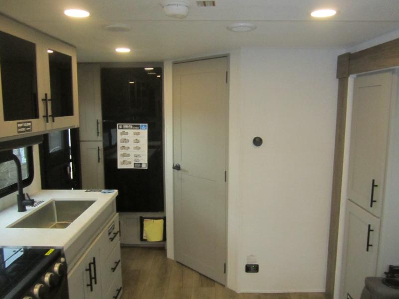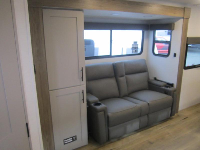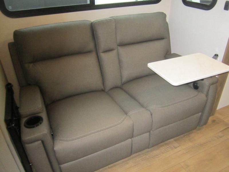 This couple's trailer is perfect for weekend trips to your favorite campground. The theater seat slide will provide comfort and space, while the fireplace across the room will have you feeling right at home. There are also two tables for the sofa and a flip-up extension by the fireplace for more counter space. All of your meals can be made on the three burner cooktop, and clean up will be a breeze with the large kitchen sink. A full bath is complete with a toilet, sink, 32" shower and a linen closet, and the front queen bed with a privacy curtain is sure to provide a great night's rest. You'll also find dual wardrobes and nightstands, along with overhead storage to keep everything organized!