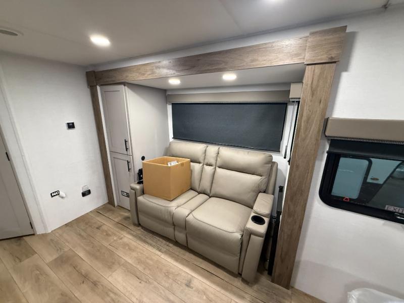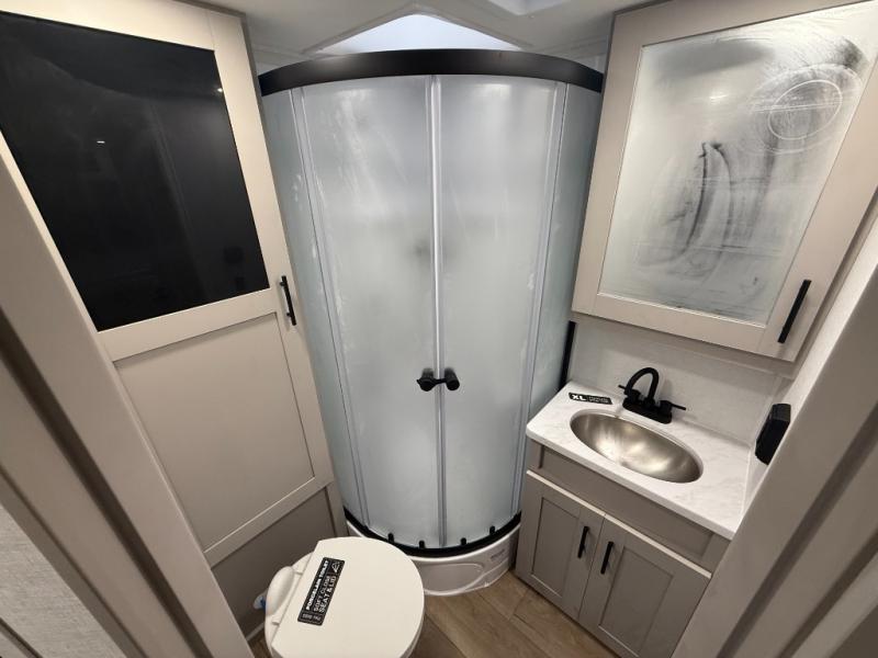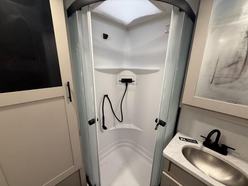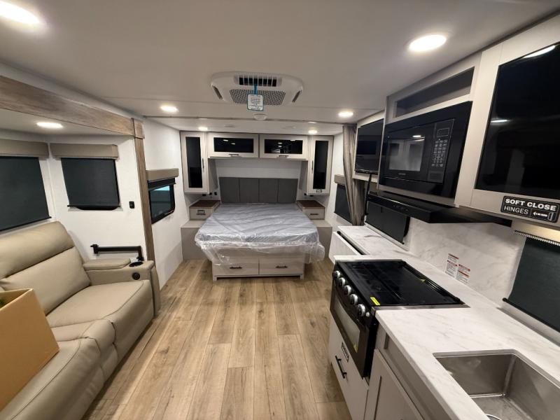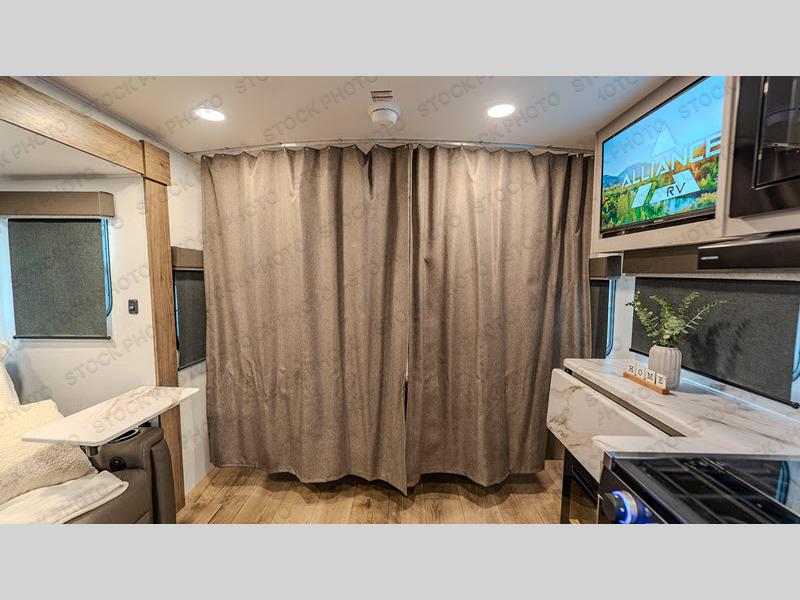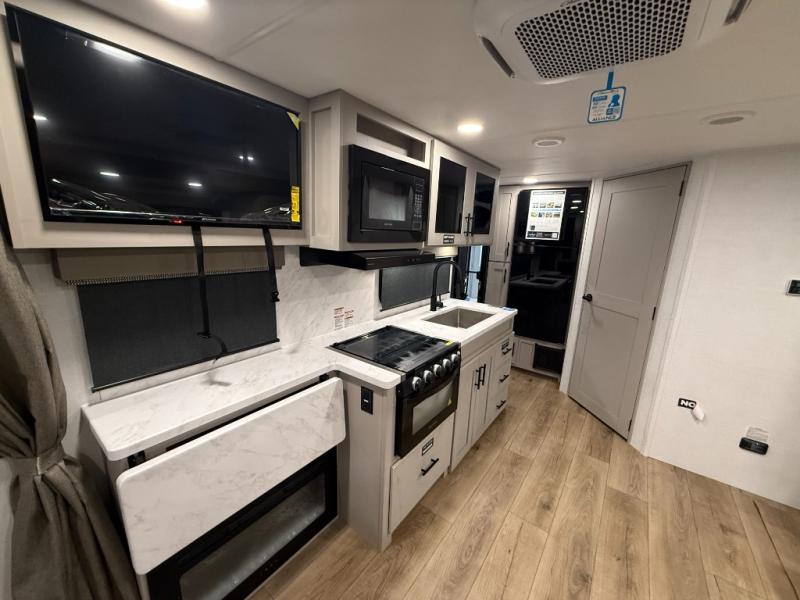 This couple's trailer is perfect for weekend trips to your favorite campground. The theater seat slide will provide comfort and space, while the fireplace across the room will have you feeling right at home. There are also two tables for the sofa and a flip-up extension by the fireplace for more counter space. All of your meals can be made on the three burner cooktop and clean up will be a breeze with the large kitchen sink. A full bath is complete with a toilet, sink, 32" shower and a linen closet, and the front queen bed with a privacy curtain is sure to provide a great night's rest. You'll also find dual wardrobes and nightstands, along with overhead storage to keep everything organized!