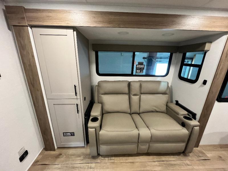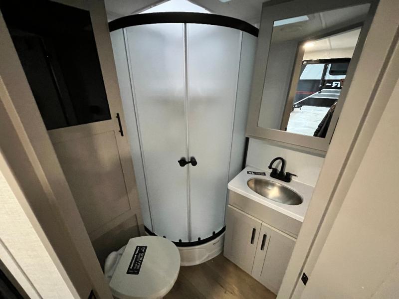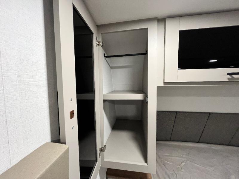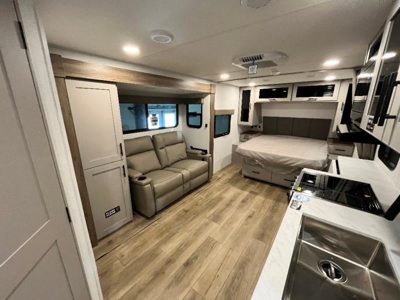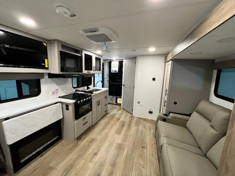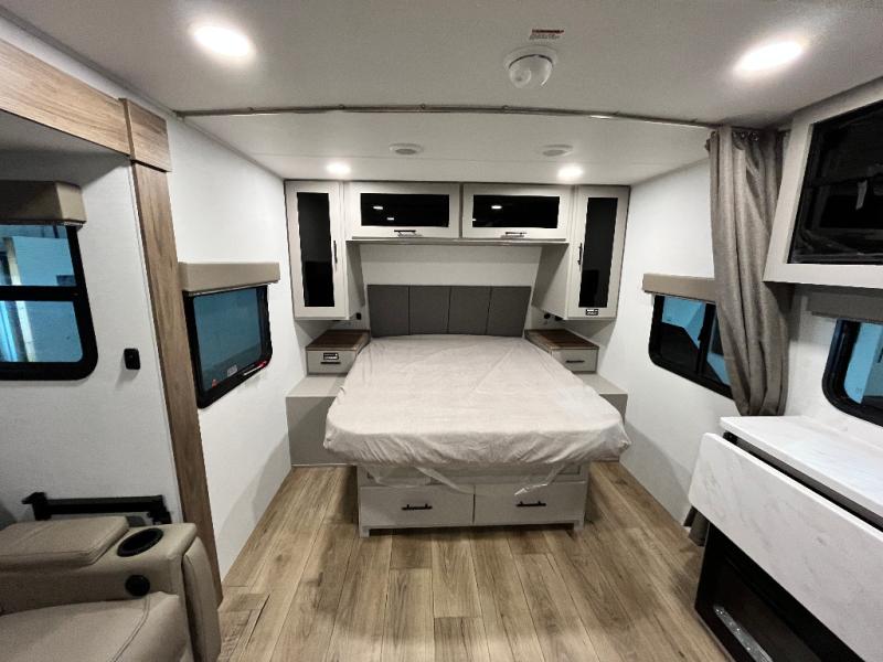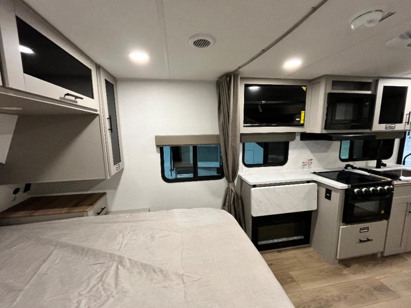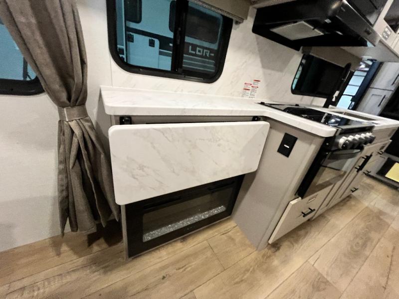 This couple's trailer is perfect for weekend trips to your favorite campground. The theater seat slide will provide comfort and space, while the fireplace across the room will have you feeling right at home. There are also two tables for the sofa and a flip-up extension by the fireplace for more counter space. All of your meals can be made on the three burner cooktop and clean up will be a breeze with the large kitchen sink. A full bath is complete with a toilet, sink, 32" shower and a linen closet, and the front queen bed with a privacy curtain is sure to provide a great night's rest. You'll also find dual wardrobes and nightstands, along with overhead storage to keep everything organized!
