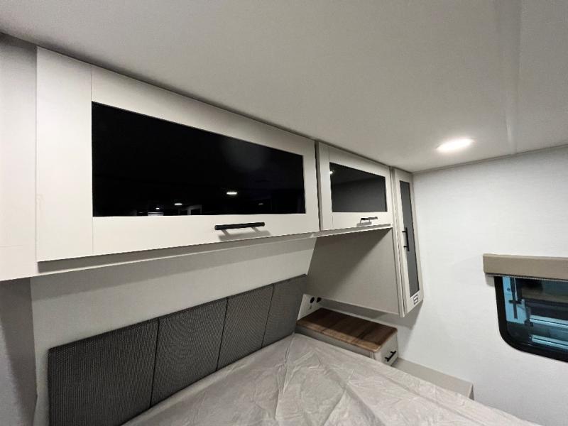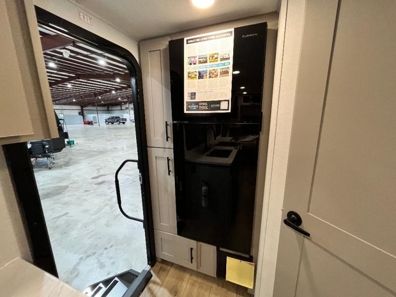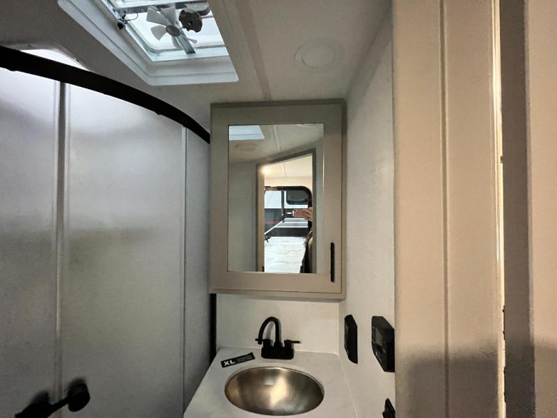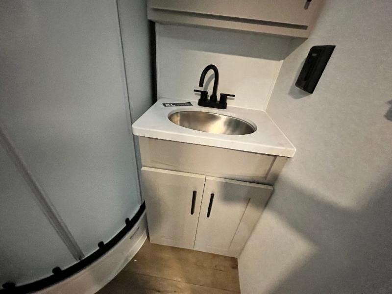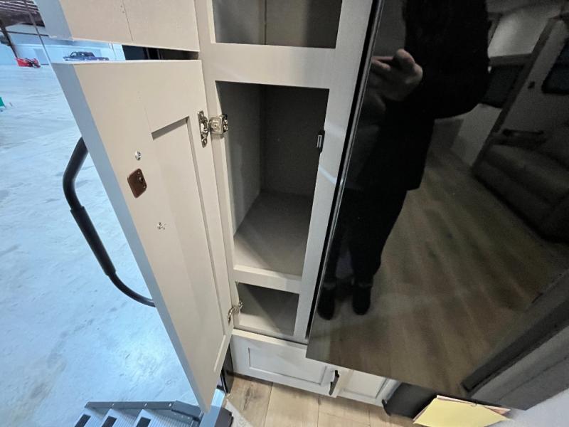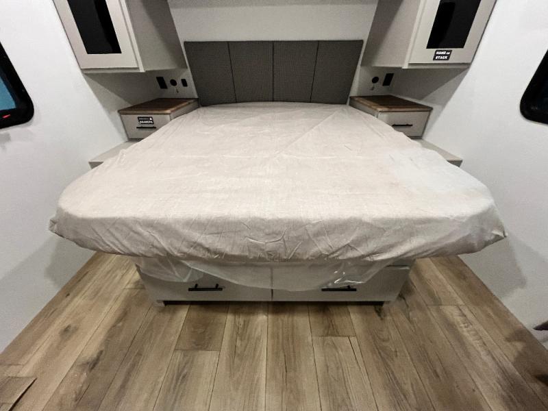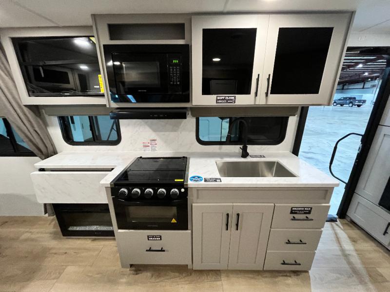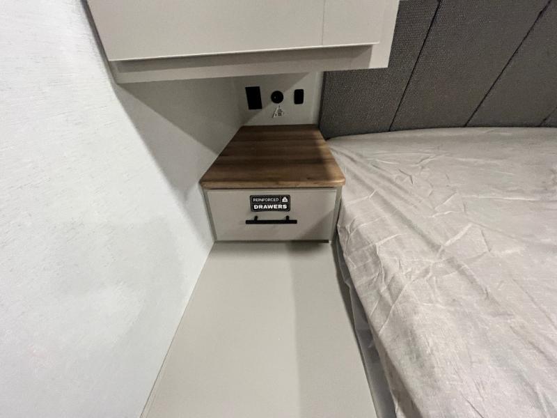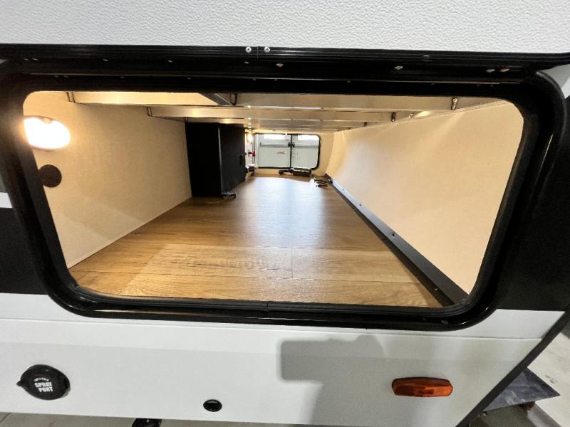 This couple's trailer is perfect for weekend trips to your favorite campground. The theater seat slide will provide comfort and space, while the fireplace across the room will have you feeling right at home. There are also two tables for the sofa and a flip-up extension by the fireplace for more counter space. All of your meals can be made on the three burner cooktop and clean up will be a breeze with the large kitchen sink. A full bath is complete with a toilet, sink, 32" shower and a linen closet, and the front queen bed with a privacy curtain is sure to provide a great night's rest. You'll also find dual wardrobes and nightstands, along with overhead storage to keep everything organized!
