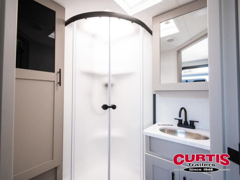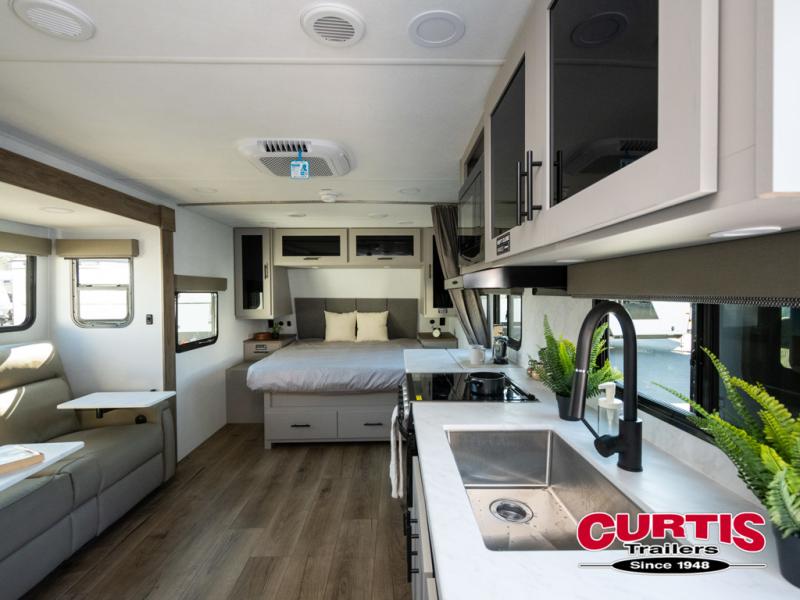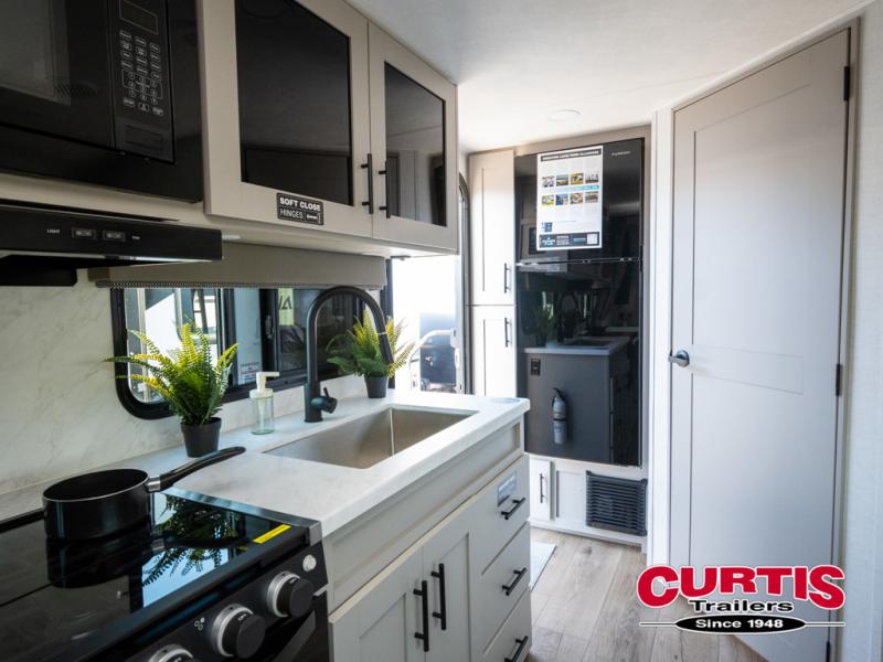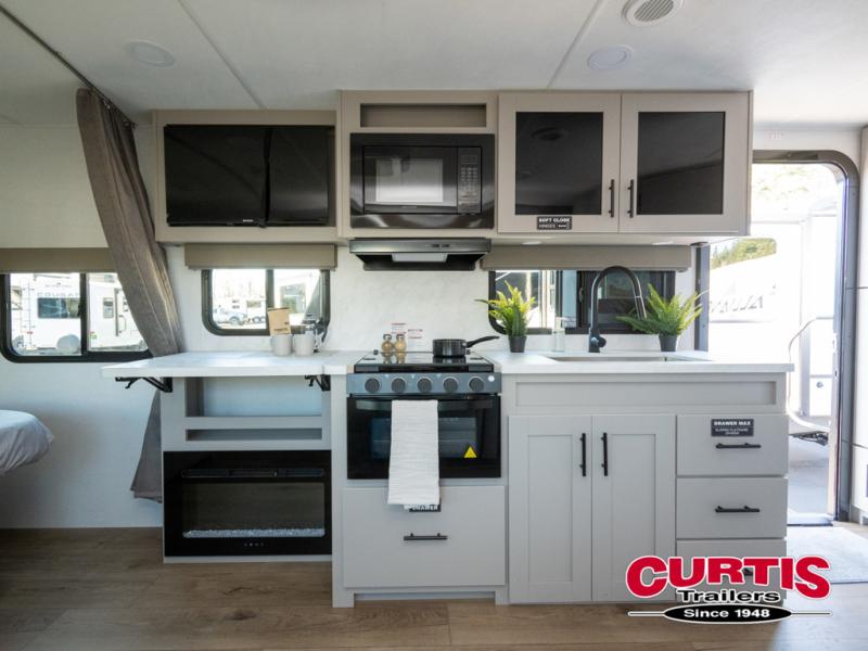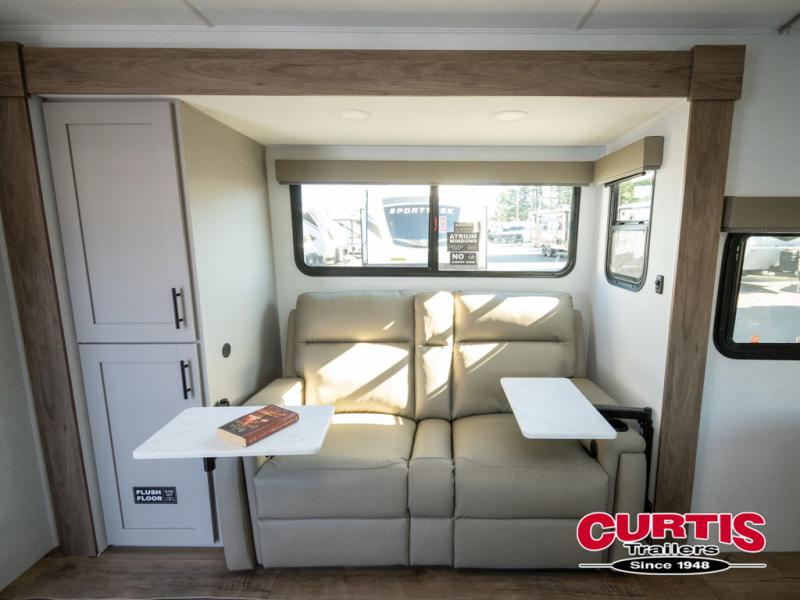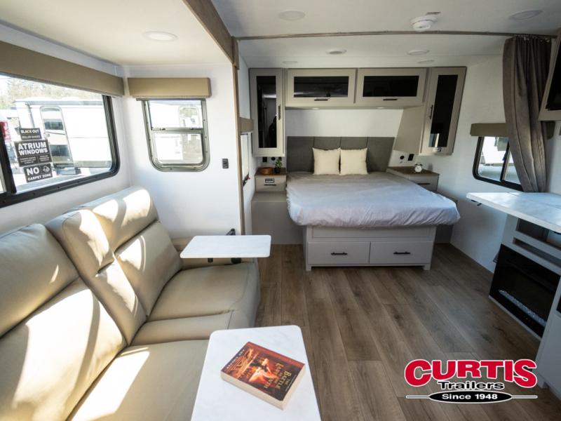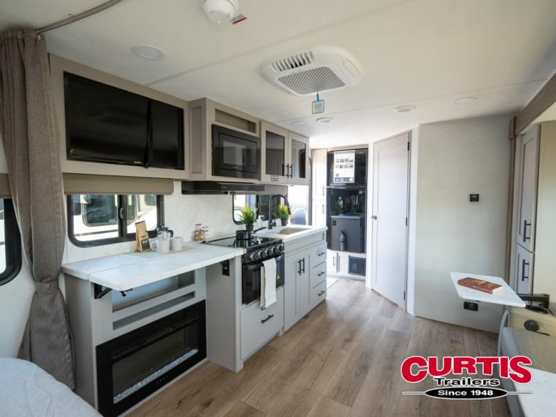 This couple's trailer is perfect for weekend trips to your favorite campground. The theater seat slide will provide comfort and space, while the fireplace across the room will have you feeling right at home. There are also two tables for the sofa and a flip-up extension by the fireplace for more counter space. All of your meals can be made on the three burner cooktop and clean up will be a breeze with the large kitchen sink. A full bath is complete with a toilet, sink, 32" shower and a linen closet, and the front queen bed with a privacy curtain is sure to provide a great night's rest. You'll also find dual wardrobes and nightstands, along with overhead storage to keep everything organized!