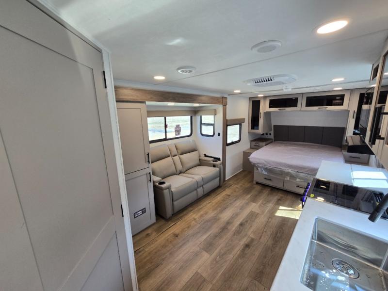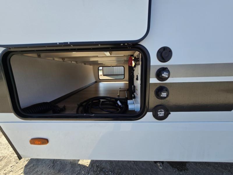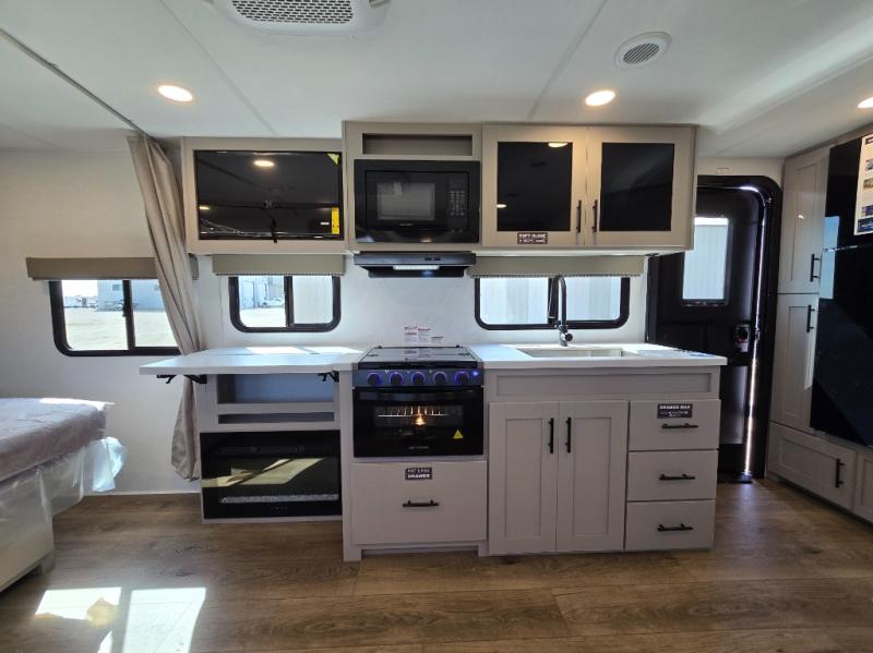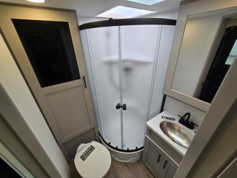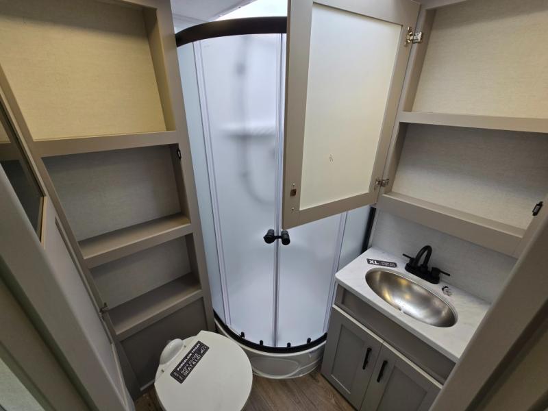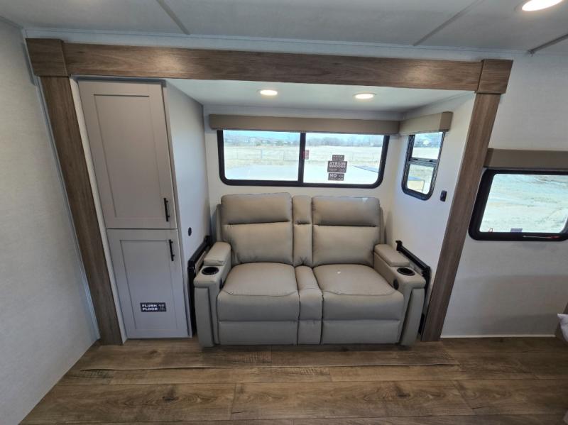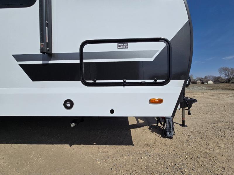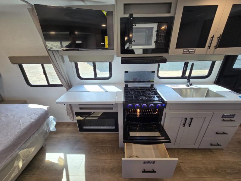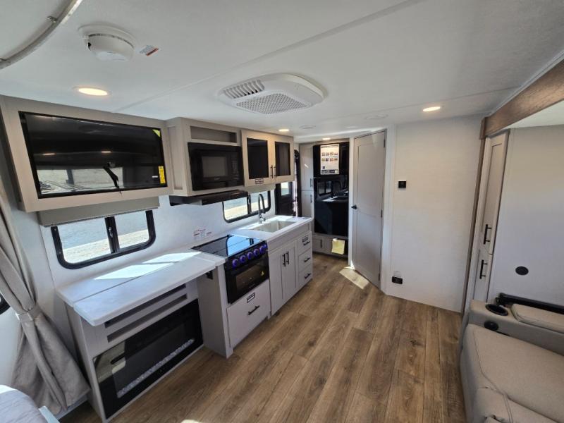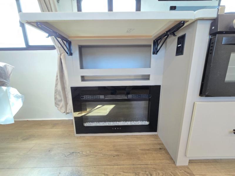 This couple's trailer is perfect for weekend trips to your favorite campground. The theater seat slide will provide comfort and space, while the fireplace across the room will have you feeling right at home. There are also two tables for the sofa and a flip-up extension by the fireplace for more counter space. All of your meals can be made on the three burner cooktop and clean up will be a breeze with the large kitchen sink. A full bath is complete with a toilet, sink, 32" shower and a linen closet, and the front queen bed with a privacy curtain is sure to provide a great night's rest. You'll also find dual wardrobes and nightstands, along with overhead storage to keep everything organized!