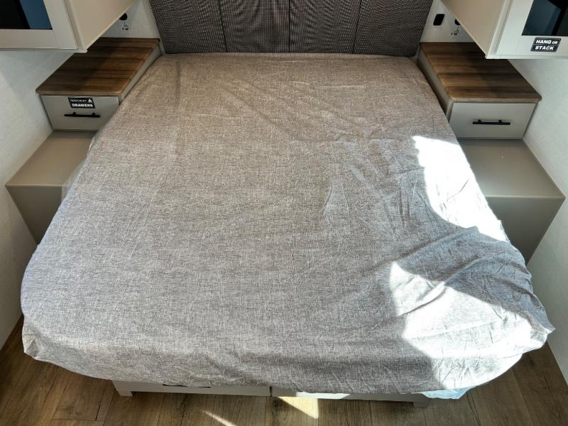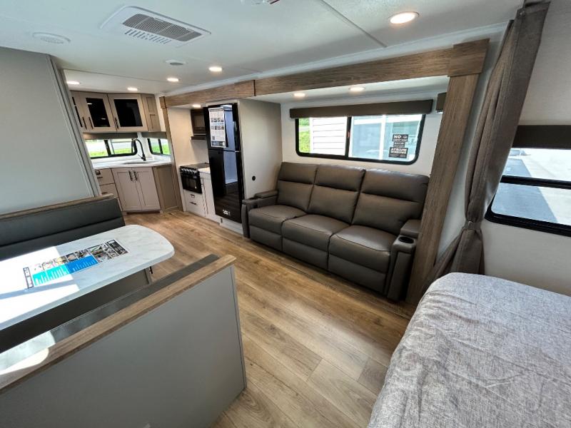 This travel trailer is perfect for three to four happy campers! You'll find a front bedroom with a queen-size bed, dual wardrobes and nightstands, plus a privacy curtain if you have someone staying over on the sofa. The booth dinette provides additional sleeping space when it's not being used to dine or play games at! A rear corner kitchen includes counter space to prep meals, a large sink, plus overhead storage for spices. After dinner, you can relax with a movie since there is a 40" swivel TV, or you can head outdoors to visit under the 19' patio awning!