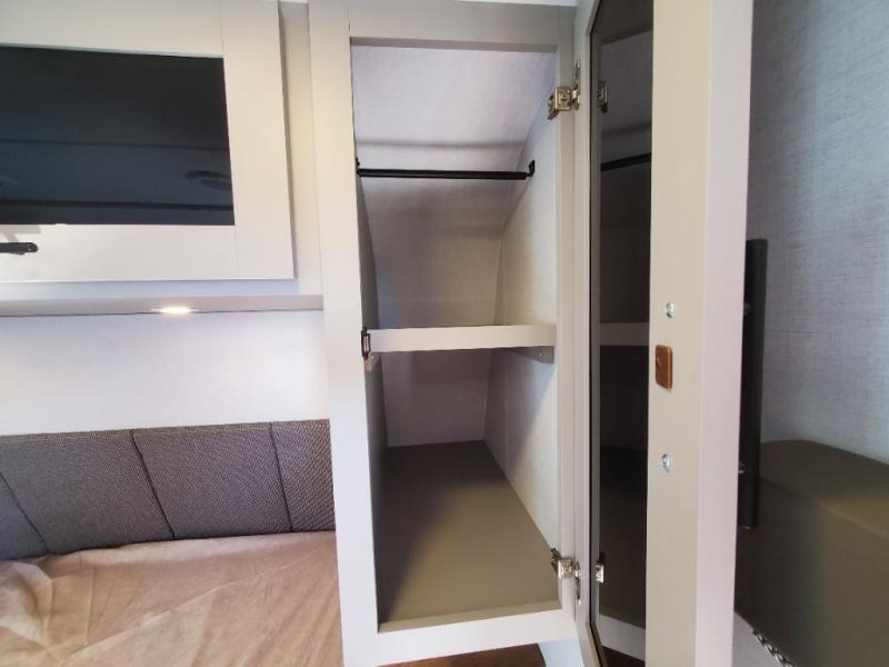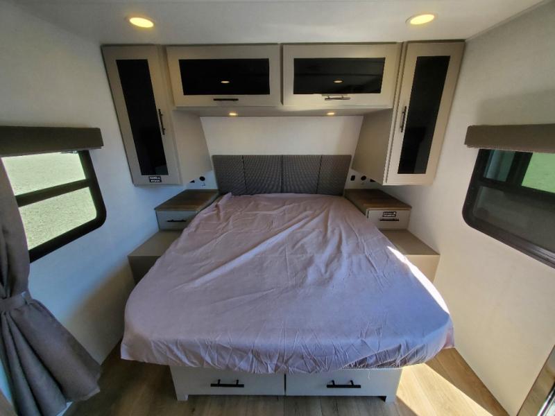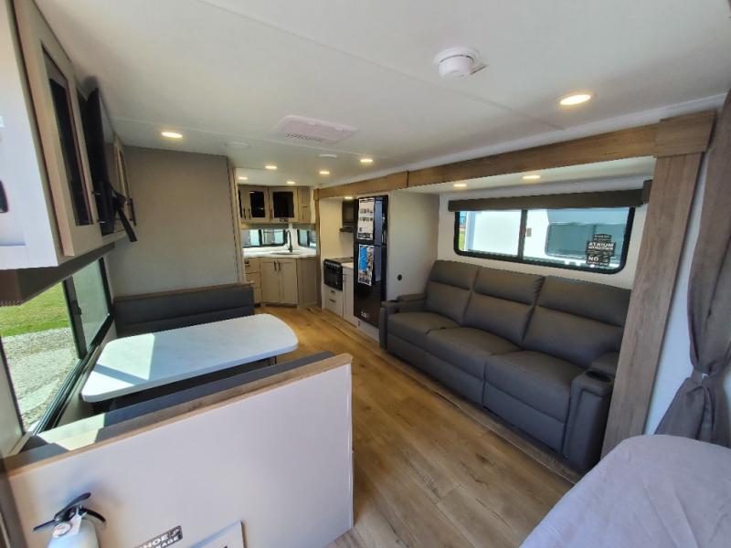 This travel trailer is perfect for three to four happy campers! You'll find a front bedroom with a queen-size bed, dual wardrobes and nightstands, plus a privacy curtain if you have someone staying over on the sofa. The booth dinette provides additional sleeping space when it's not being used to dine or play games at! A rear corner kitchen includes counter space to prep meals, a large sink, plus overhead storage for spices. After dinner, you can relax with a movie since there is a 40" swivel TV, or you can head outdoors to visit under the 19' patio awning!