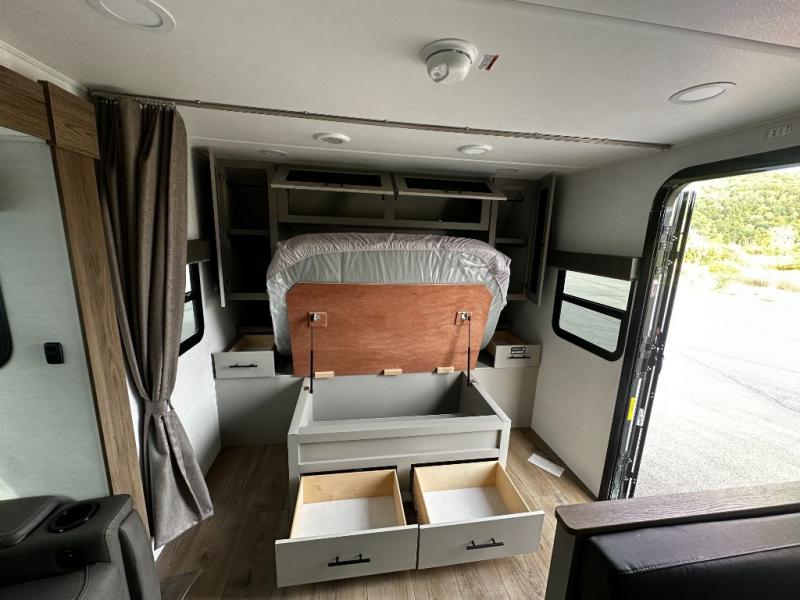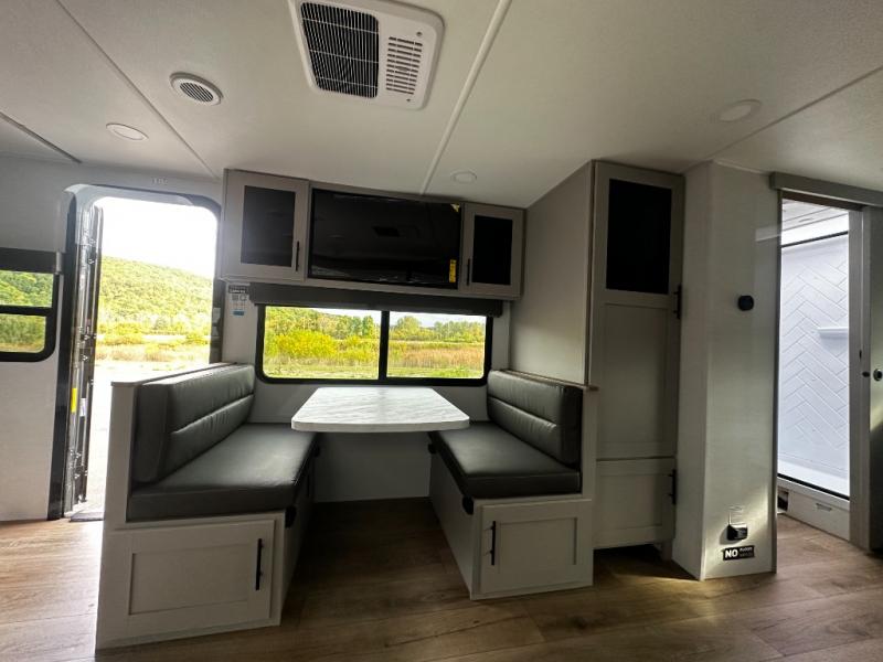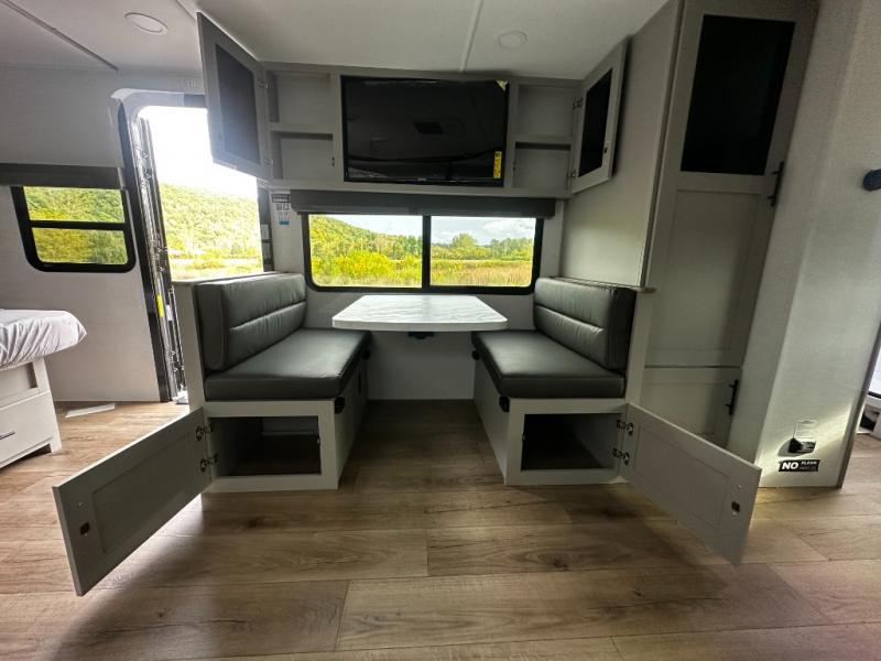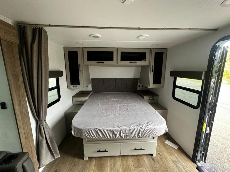 This travel trailer is perfect for three to four happy campers! You'll find a front bedroom with a queen-size bed, dual wardrobes and nightstands, plus a privacy curtain if you have someone staying over on the sofa. The booth dinette provides additional sleeping space when it's not being used to dine or play games at! A rear corner kitchen includes counter space to prep meals, a large sink, plus overhead storage for spices. After dinner, you can relax with a movie since there is a 40" swivel TV, or you can head outdoors to visit under the 19' patio awning!