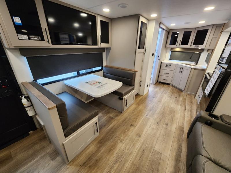 This travel trailer is perfect for three to four happy campers! You'll find a front bedroom with a queen-size bed, dual wardrobes and nightstands, plus a privacy curtain if you have someone staying over on the sofa. The booth dinette provides additional sleeping space when it's not being used to dine or play games at! A rear corner kitchen includes counter space to prep meals, a large sink, plus overhead storage for spices. After dinner, you can relax with a movie since there is a 40" swivel TV, or you can head outdoors to visit under the 19' patio awning!