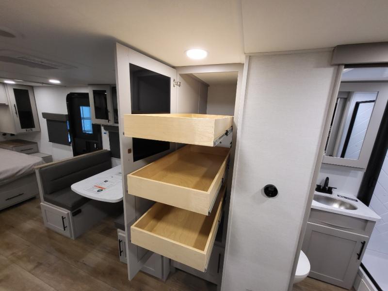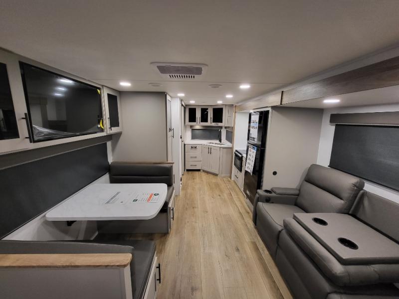 This travel trailer is perfect for three to four happy campers! You'll find a front bedroom with a queen-size bed, dual wardrobes and nightstands, plus a privacy curtain if you have someone staying over on the sofa. The booth dinette provides additional sleeping space when it's not being used to dine or play games at! A rear corner kitchen includes counter space to prep meals, a large sink, plus overhead storage for spices. After dinner, you can relax with a movie since there is a 40" swivel TV, or you can head outdoors to visit under the 19' patio awning!