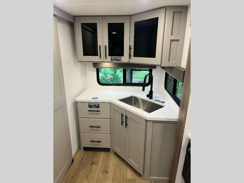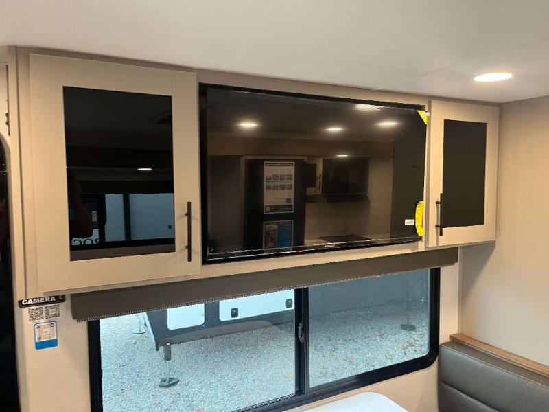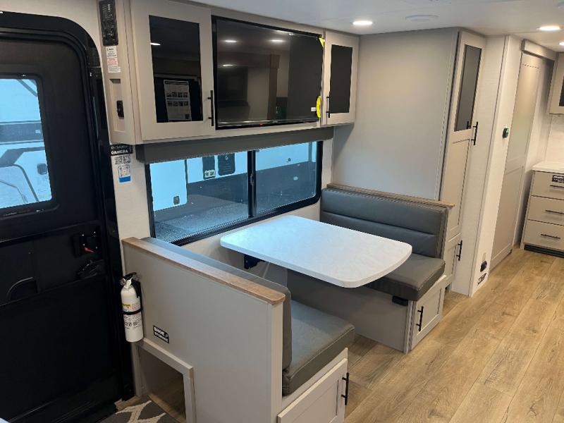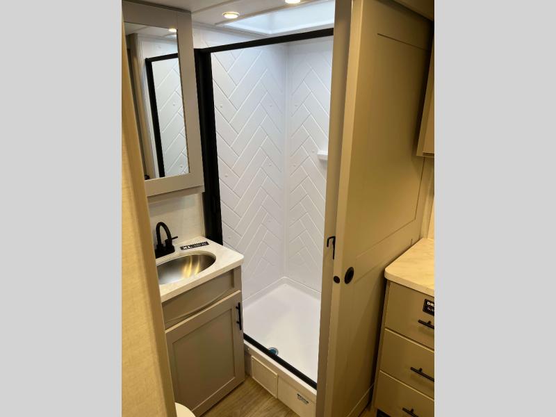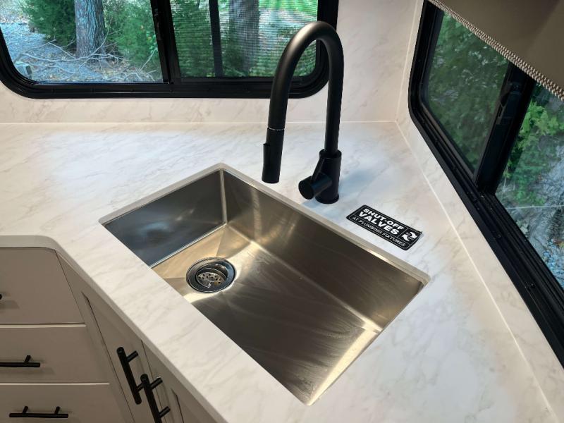 - Goodyear Endurance Tires, Rack and Pinion Flush Floor Slide Room, Porcelain Toilet w/ Foot Flush, Aluminum Rims w/ Spare Tire and Carrier, 10 cu ft 12V Refrigerator, Keyed Alike Compartment Doors, Oversized Atrium Windows Throughout, Walk on Roof w/ Seamless PVC Roof Covering, Commercial Grade Vinyl Flooring, Residential Cabinet Doors w/ Magnetic Catch, Soft Close Hidden Hinges, Roller Shades Throughout, Residential Can Style LED Ceiling Lights, Matte Black Cabinetry Hardware, No In-Floor Heat Vents, Mylar Reinforced Exterior Seals, LP Quick Connect, Heated and Enclosed Underbelly, Black Tank Flush, Pre Wired for Back Up Camera, Tire Monitor Prep, Color Coded and Numbered Wiring, Shut Off Valves at Major Plumbing Locations, Slide Topper Prep, USB Charge Ports Throughout
