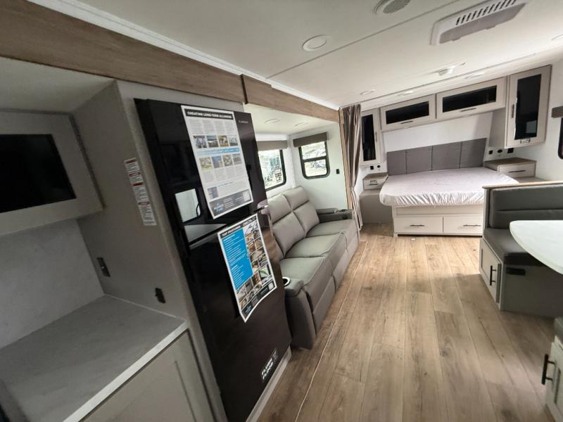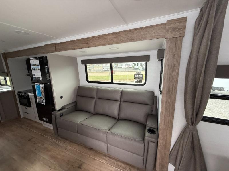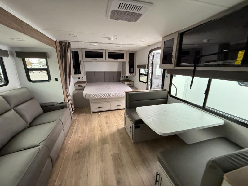 This travel trailer is perfect for three to four happy campers! You'll find a front bedroom with a queen-size bed, dual wardrobes and nightstands, plus a privacy curtain if you have someone staying over on the sofa. The booth dinette provides additional sleeping space when it's not being used to dine or play games at! A rear corner kitchen includes counter space to prep meals, a large sink, plus overhead storage for spices. After dinner, you can relax with a movie since there is a 40" swivel TV, or you can head outdoors to visit under the 19' patio awning!