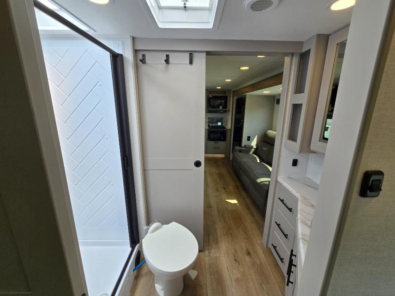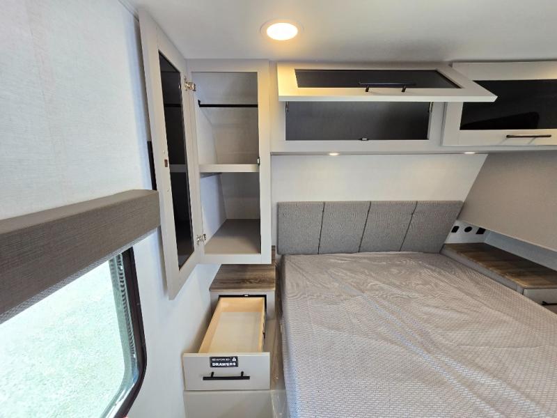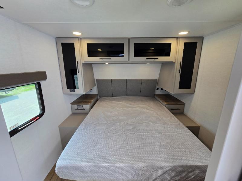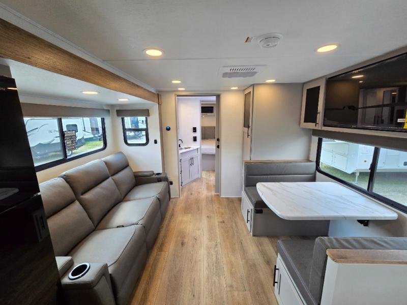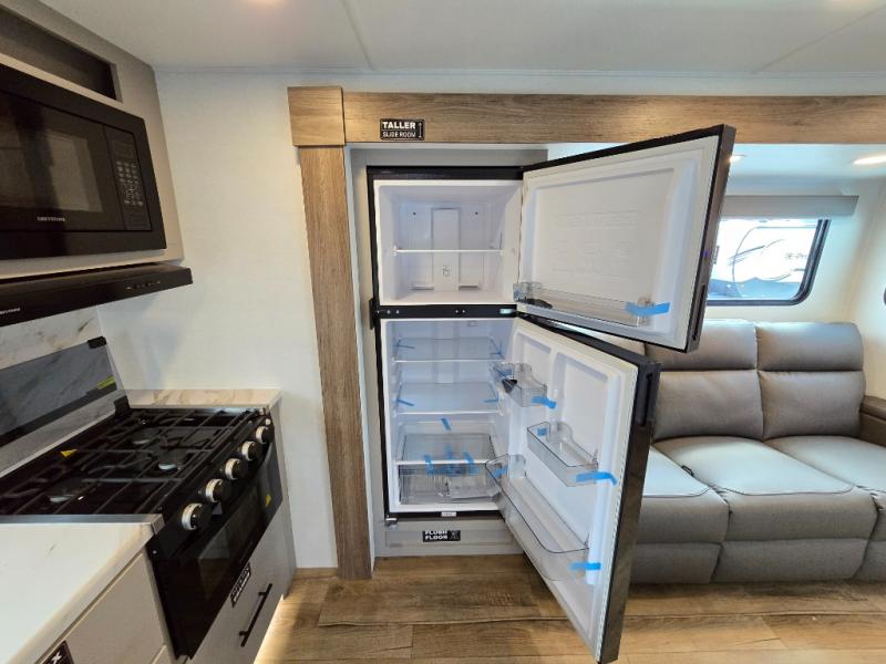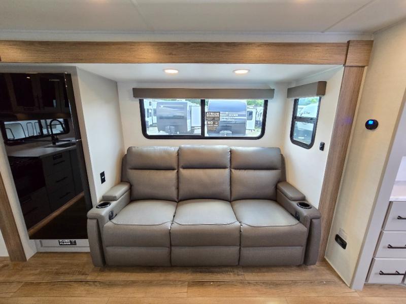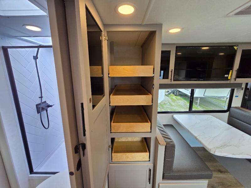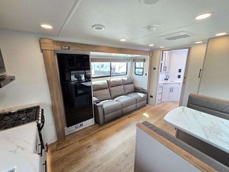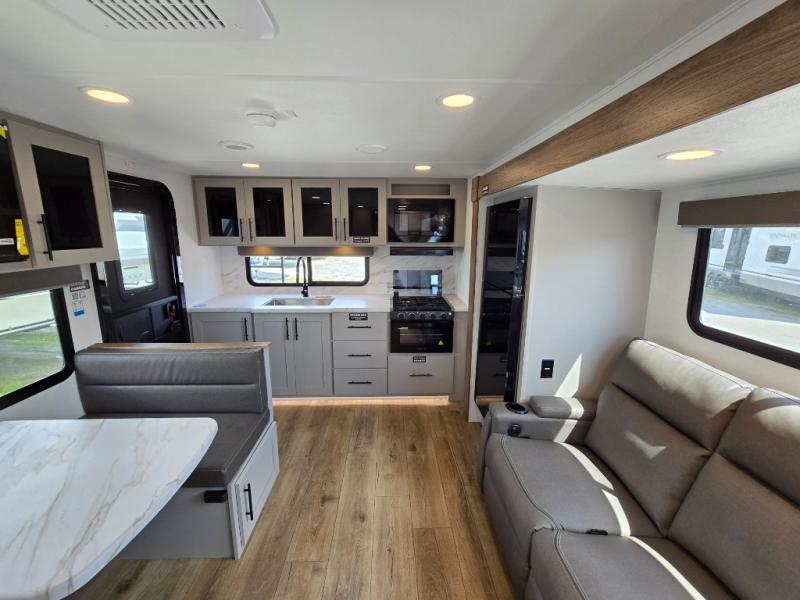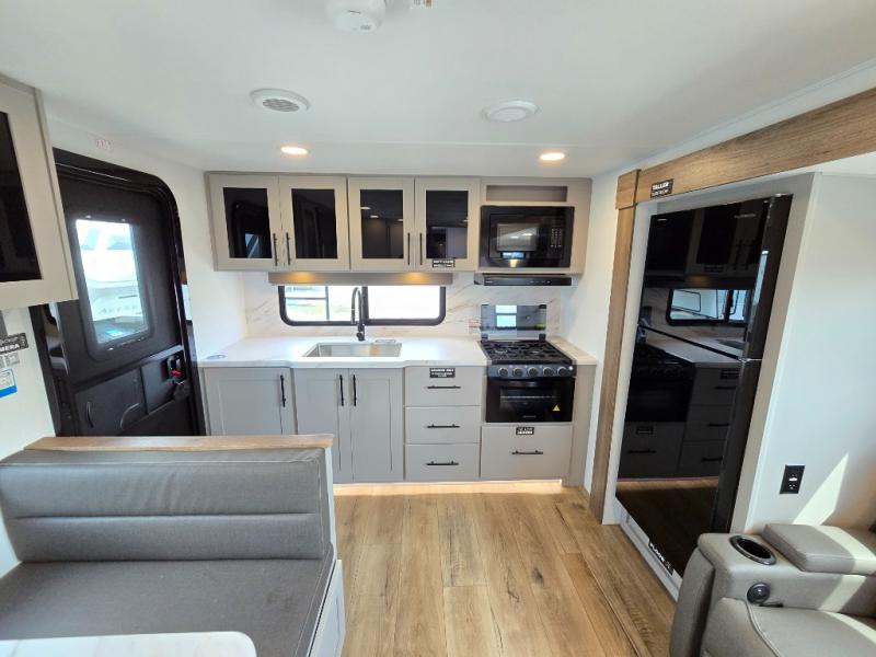 You'll love camping in this rear kitchen travel trailer with generous counter space and overhead storage for spices, dishes, and more. You can dine each day at the booth dinette or relax on the sofa slide out, which will provide more floor space. The spacious walk-thru bath includes a 30" x 36" shower, toilet, and vanity so you can clean up each day. Head to the front master bedroom where you can sleep soundly on the walk-around queen bed with dual nightstands and wardrobes. The second entry door is also found in this room so you can slip out for an early morning run!