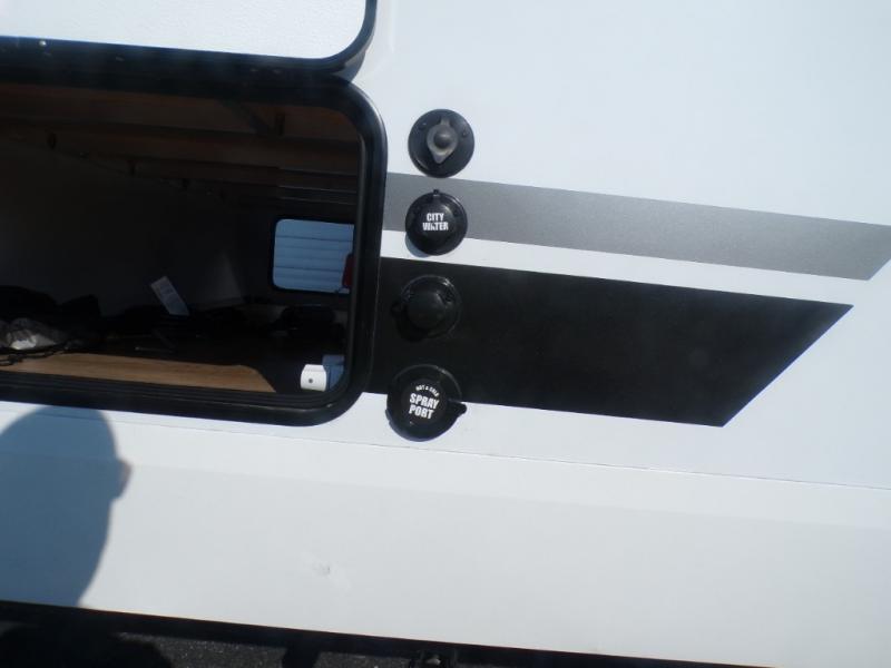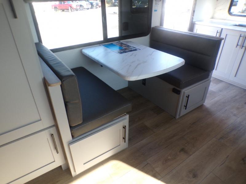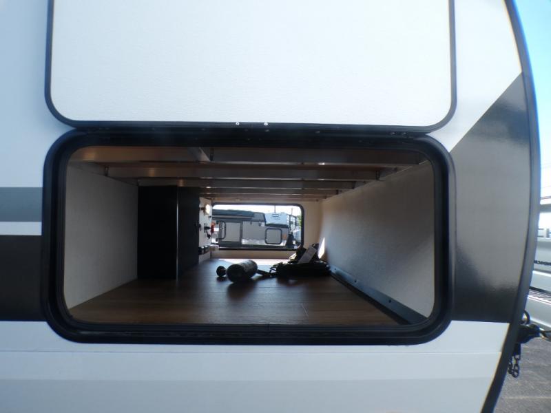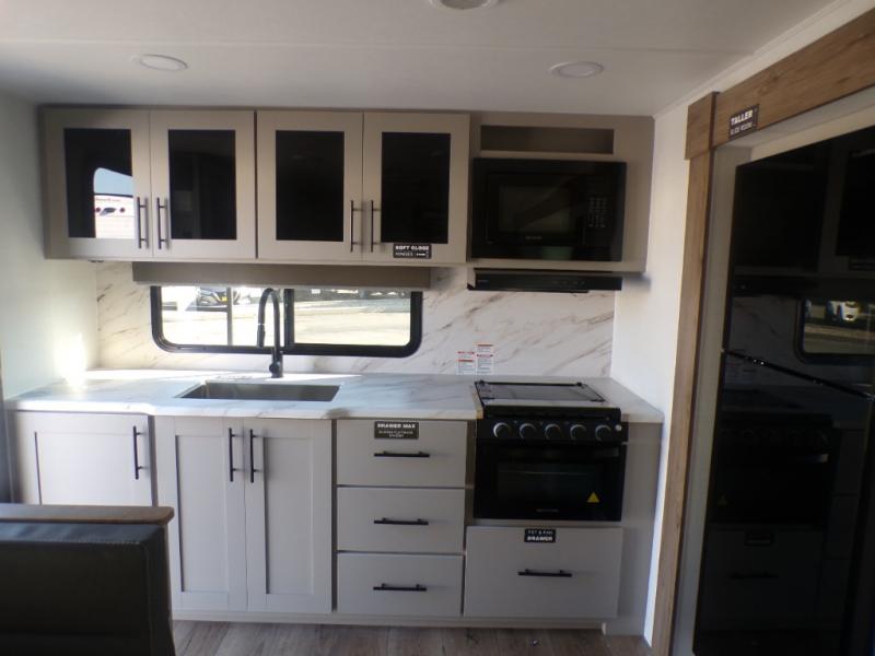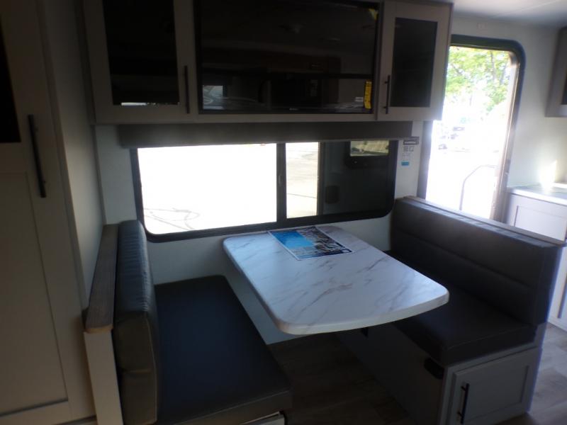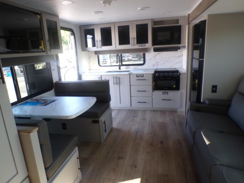 You'll love camping in this rear kitchen travel trailer with generous counter space and overhead storage for spices, dishes, and more. You can dine each day at the booth dinette or relax on the sofa slide out, which will provide more floor space. The spacious walk-thru bath includes a 30" x 36" shower, toilet, and vanity so you can clean up each day. Head to the front master bedroom where you can sleep soundly on the walk-around queen bed with dual nightstands and wardrobes. The second entry door is also found in this room so you can slip out for an early morning run!