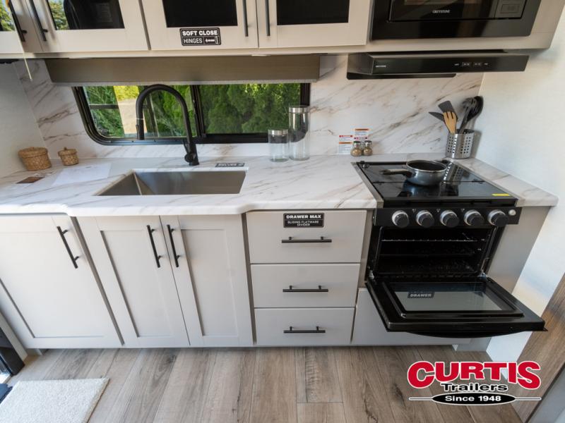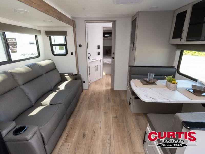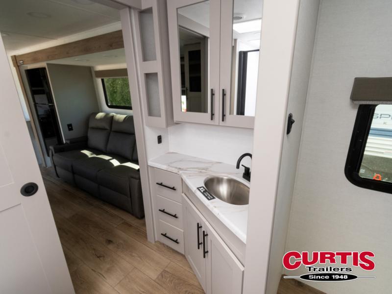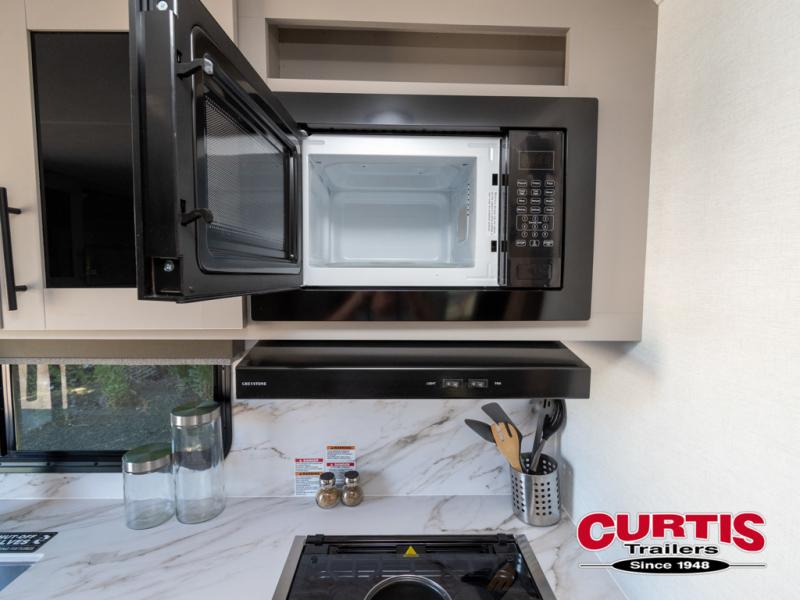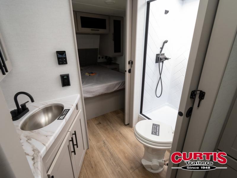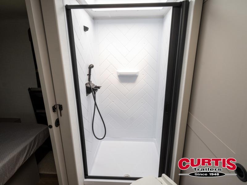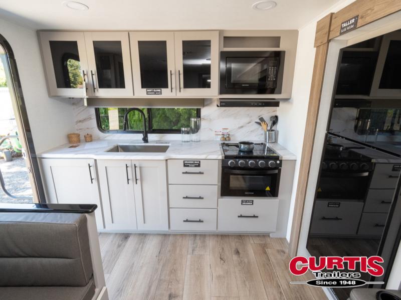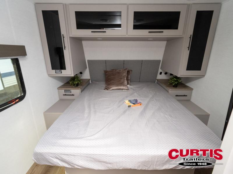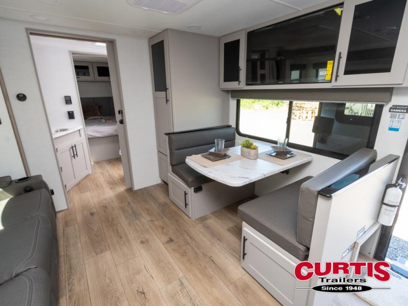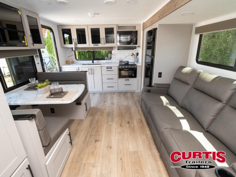 You'll love camping in this rear kitchen travel trailer with generous counter space and overhead storage for spices, dishes, and more. You can dine each day at the booth dinette or relax on the sofa slide out, which will provide more floor space. The spacious walk-thru bath includes a 30" x 36" shower, toilet, and vanity so you can clean up each day. Head to the front master bedroom where you can sleep soundly on the walk-around queen bed with dual nightstands and wardrobes. The second entry door is also found in this room so you can slip out for an early morning run!