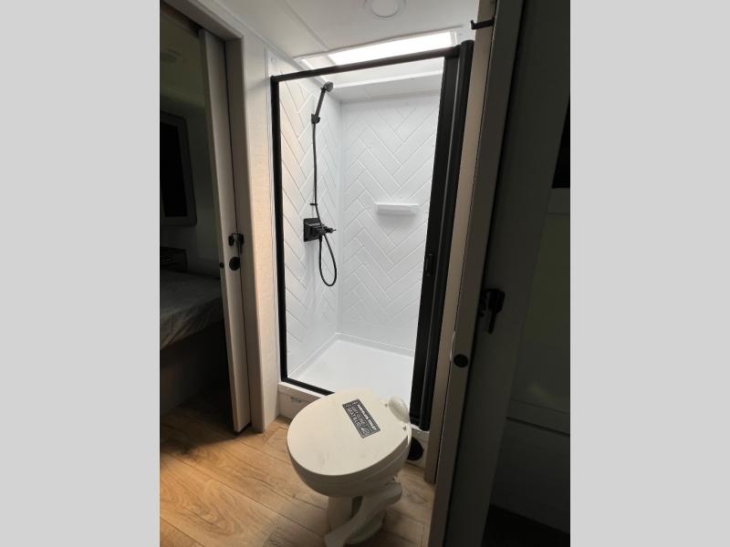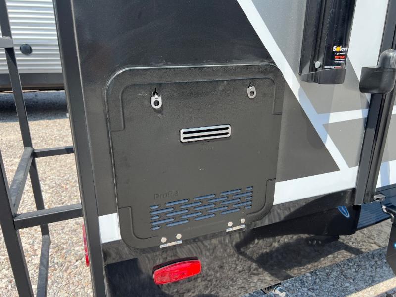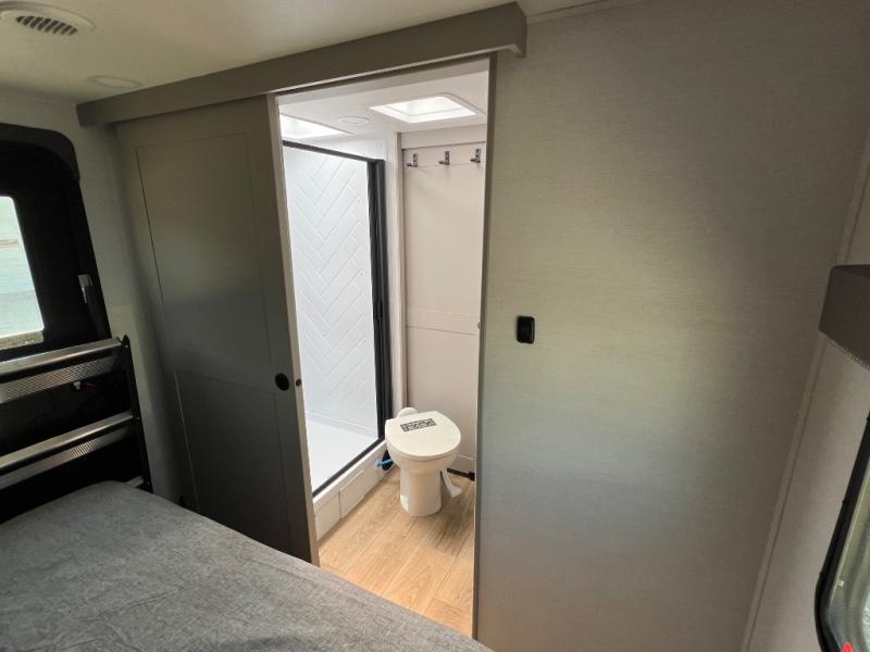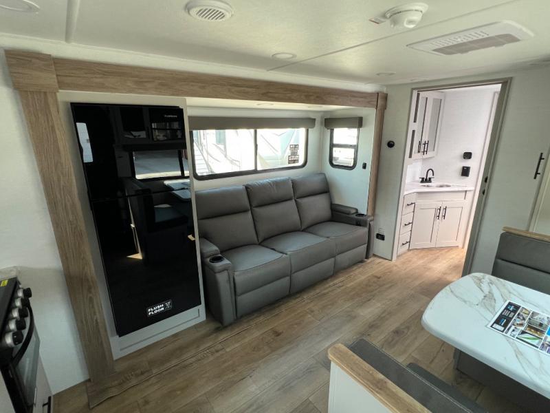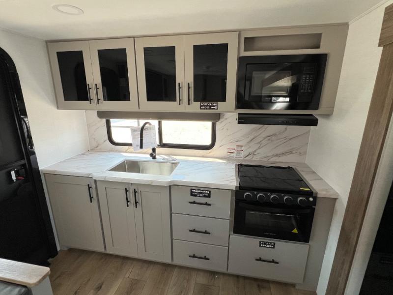 You'll love camping in this rear kitchen travel trailer with generous counter space and overhead storage for spices, dishes, and more. You can dine each day at the booth dinette or relax on the sofa slide out, which will provide more floor space. The spacious walk-thru bath includes a 30" x 36" shower, toilet, and vanity so you can clean up each day. Head to the front master bedroom where you can sleep soundly on the walk-around queen bed with dual nightstands and wardrobes. The second entry door is also found in this room so you can slip out for an early morning run!
