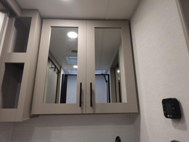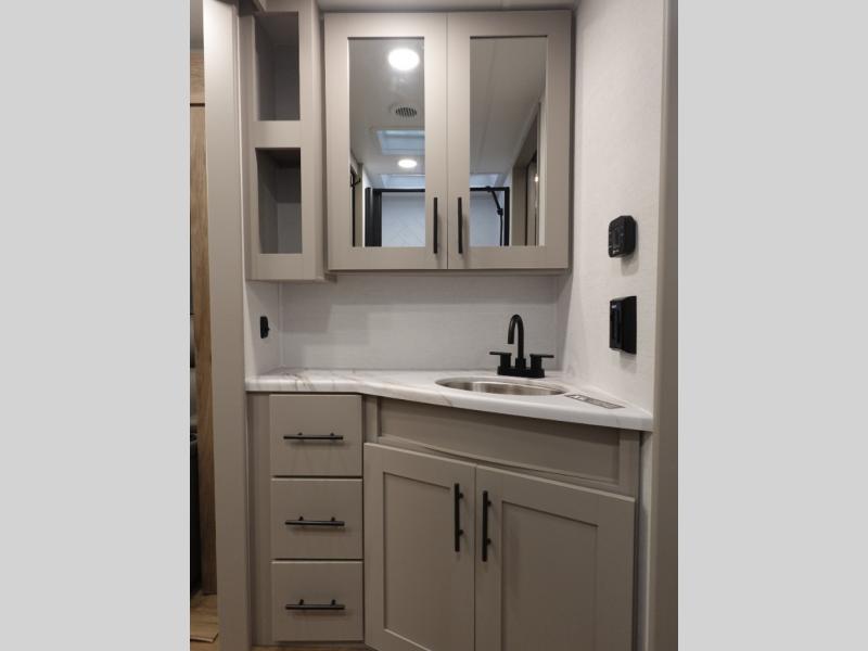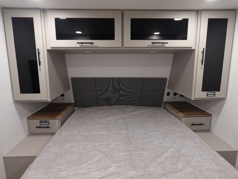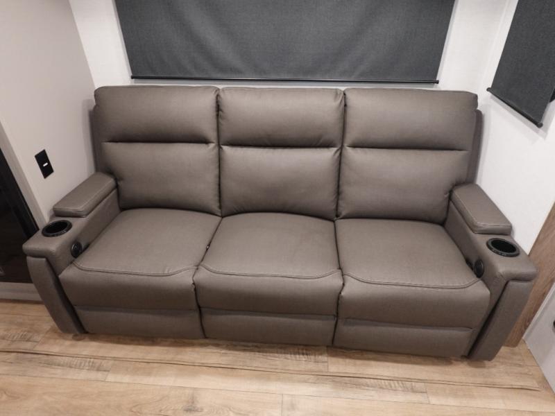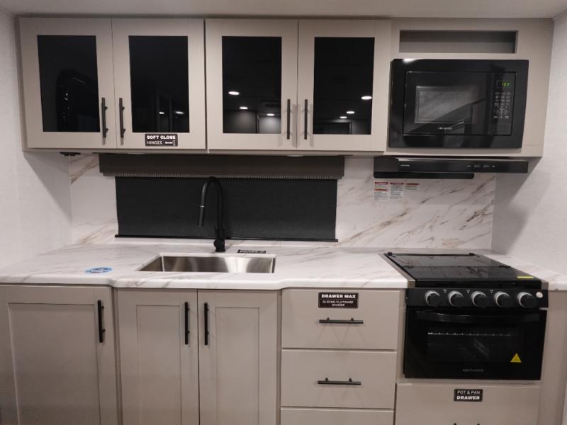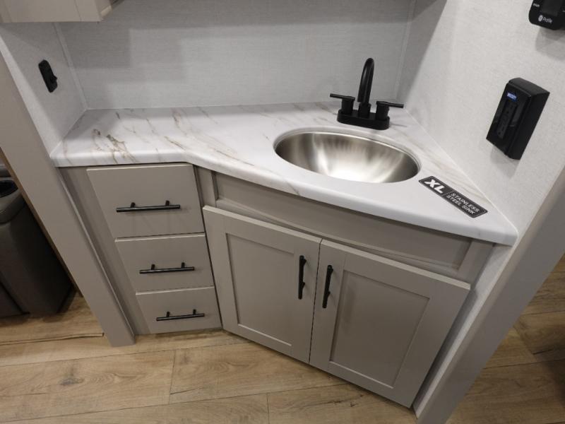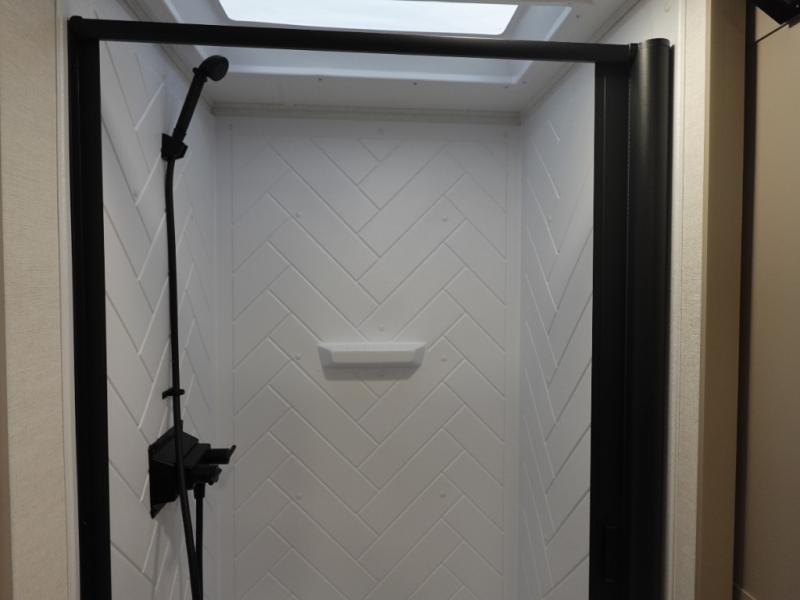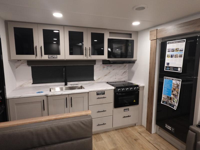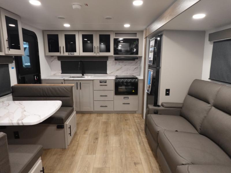 You'll love camping in this rear kitchen travel trailer with generous counter space and overhead storage for spices, dishes, and more. You can dine each day at the booth dinette or relax on the sofa slide out, which will provide more floor space. The spacious walk-thru bath includes a 30" x 36" shower, toilet, and vanity so you can clean up each day. Head to the front master bedroom where you can sleep soundly on the walk-around queen bed with dual nightstands and wardrobes. The second entry door is also found in this room so you can slip out for an early morning run!