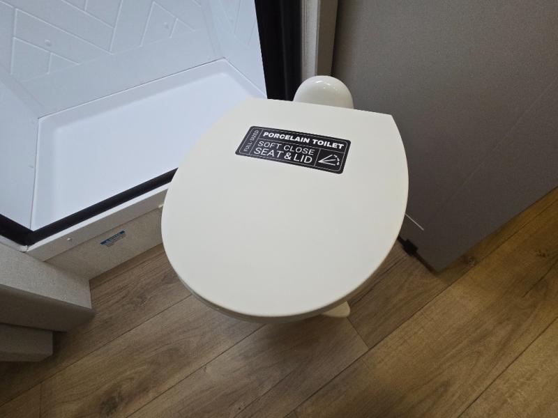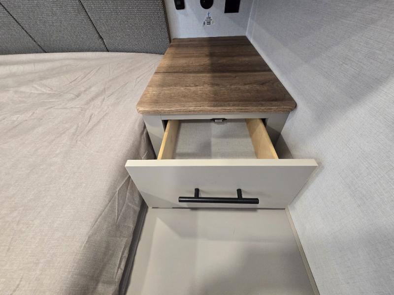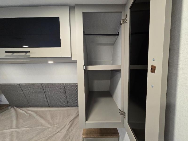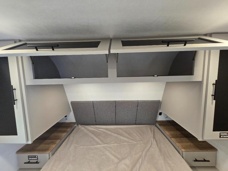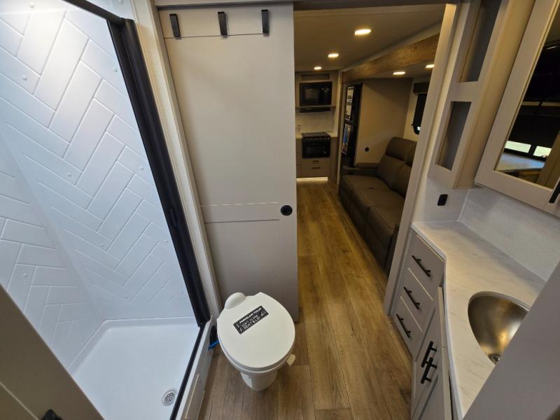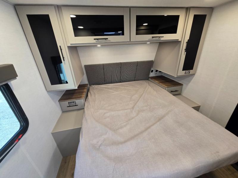 The spacious walk-thru bath includes a 30" x 36" shower, toilet, and vanity, leading to the private front bedroom with a walk-around queen bed, dual wardrobes, and its own entry door — perfect for slipping out for an early morning walk or coffee under the awning.
