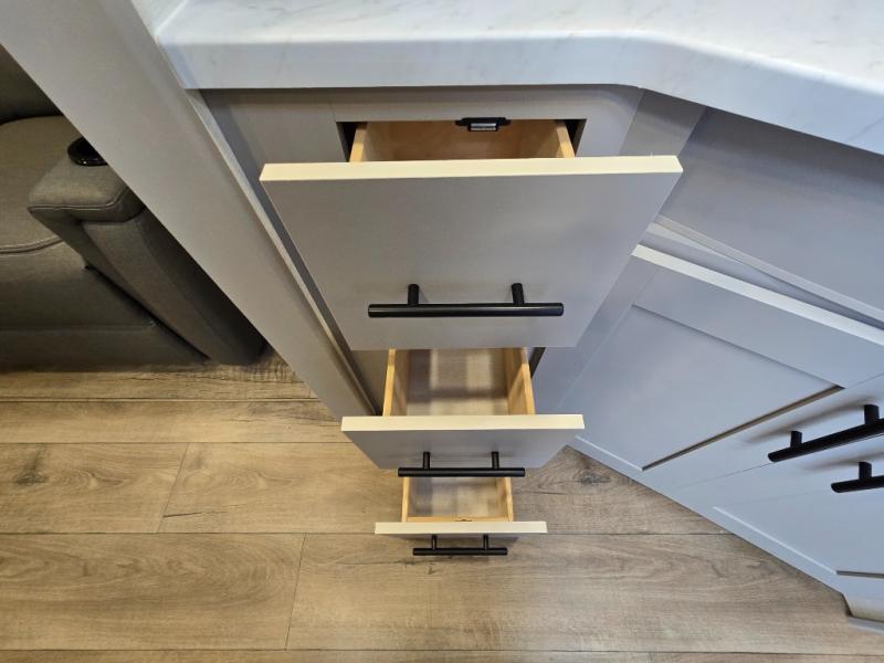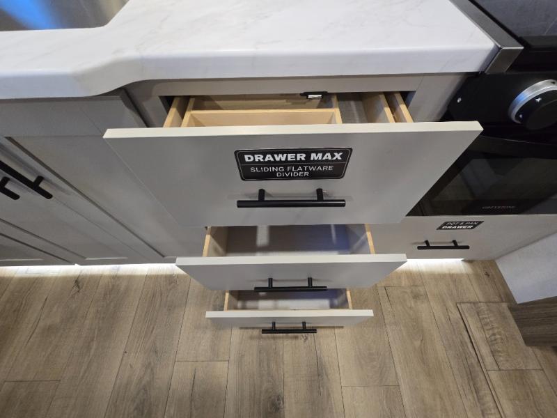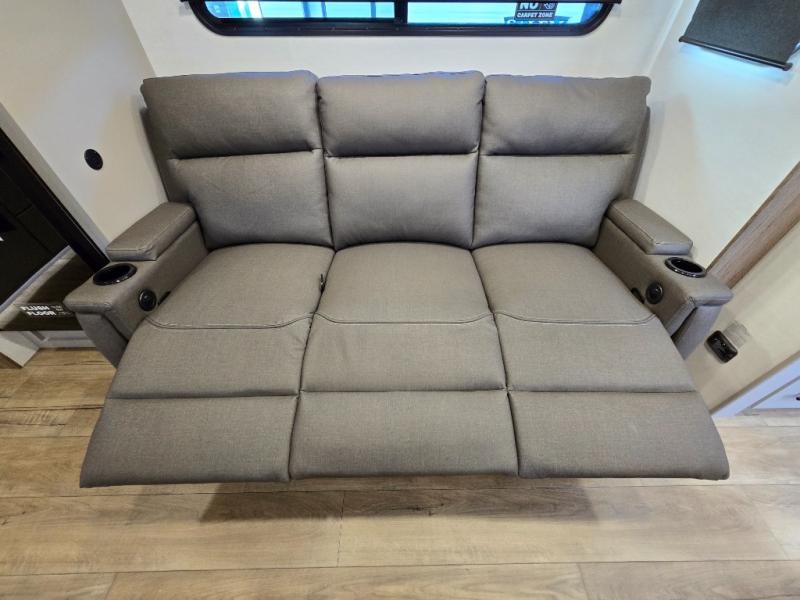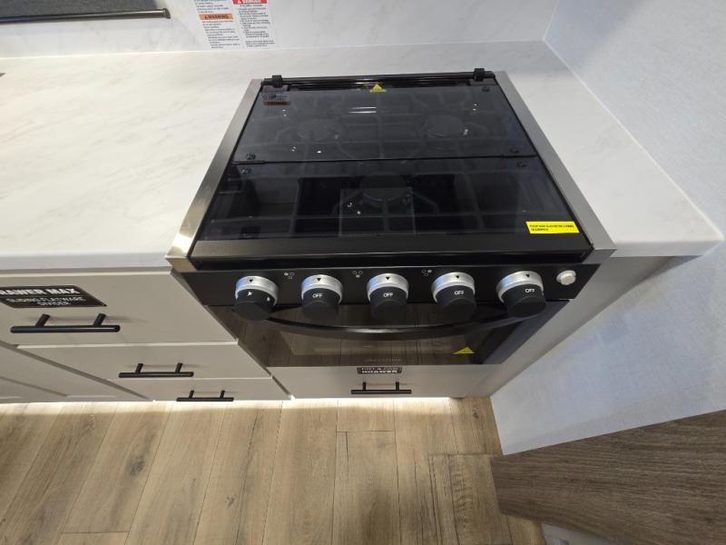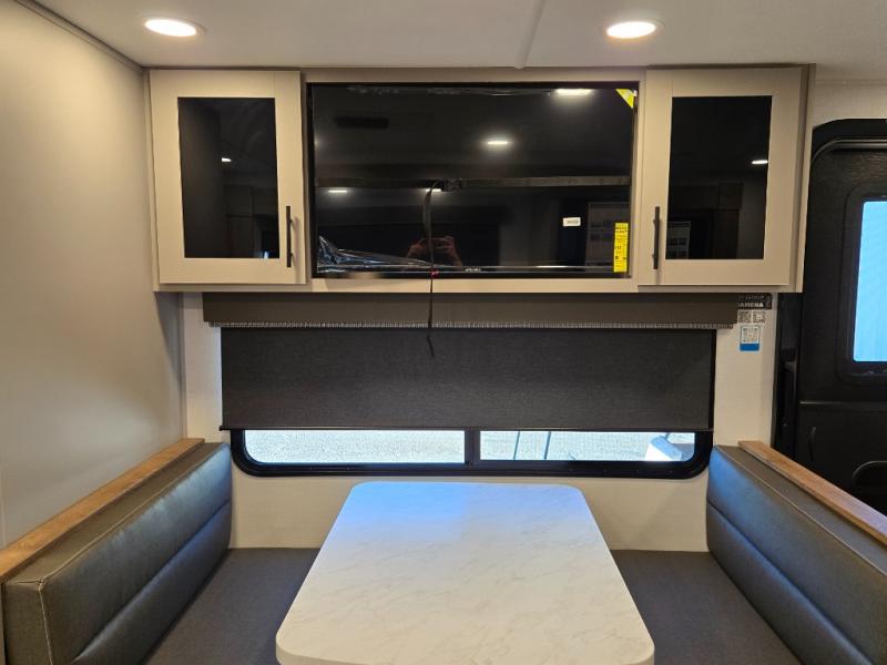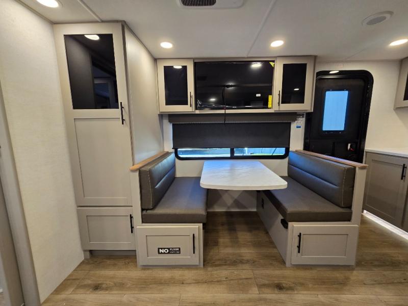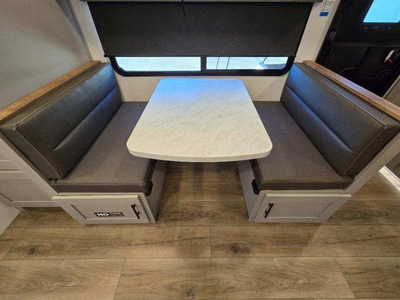 You’ll love the rear kitchen, which features generous counter space, plenty of overhead cabinetry, and a 10 cu. ft. refrigerator to store all your ingredients for delicious campsite meals. Dine comfortably at the booth dinette or unwind on the sofa slide, which expands your living area for a more open feel.