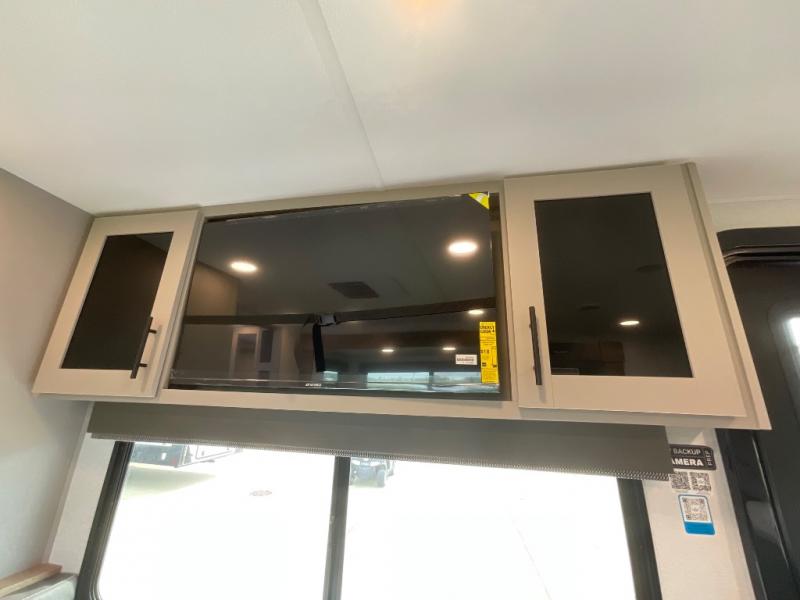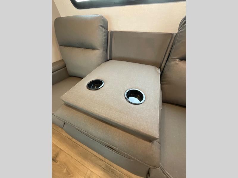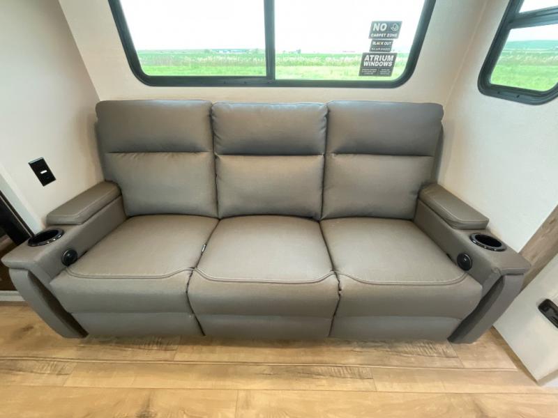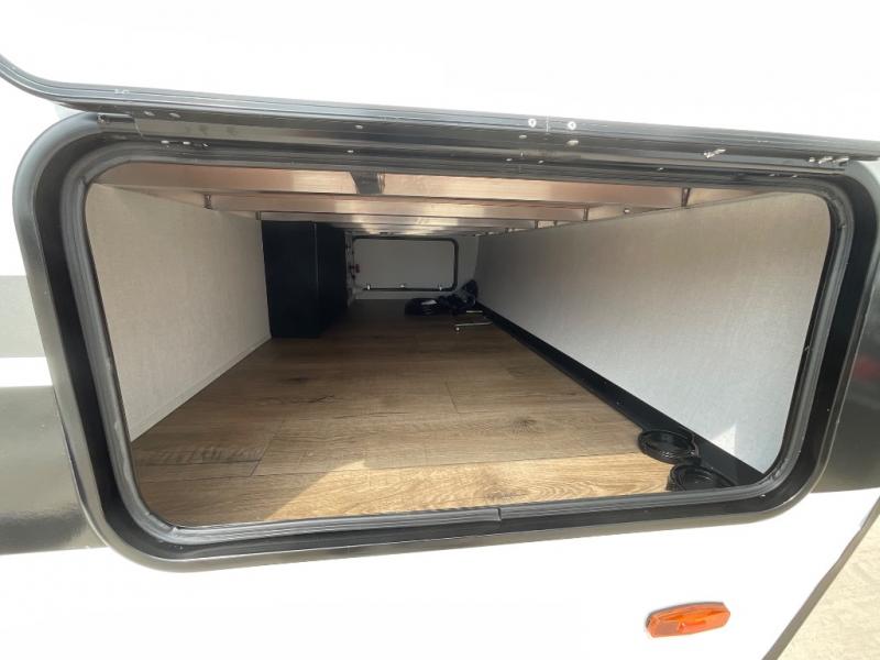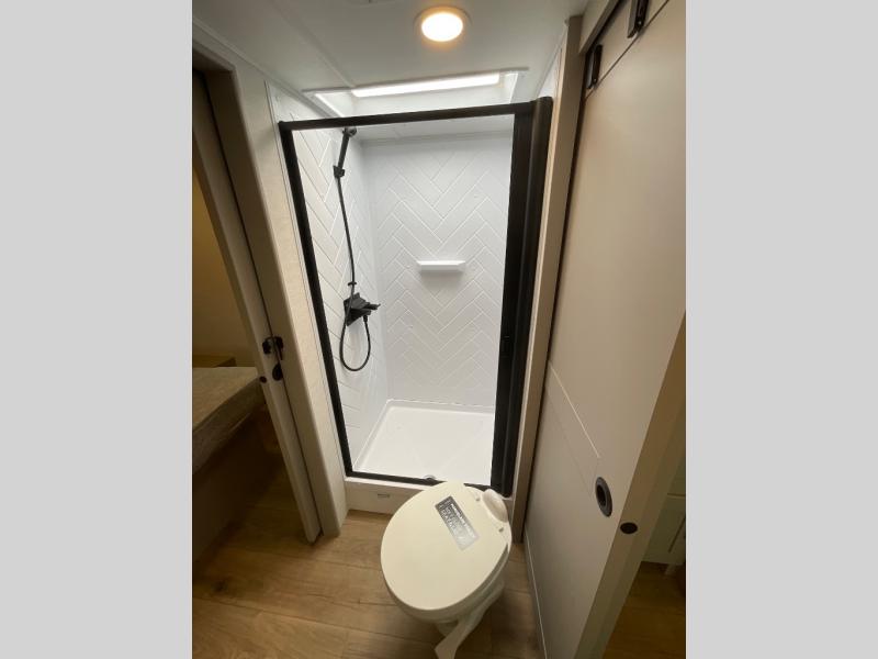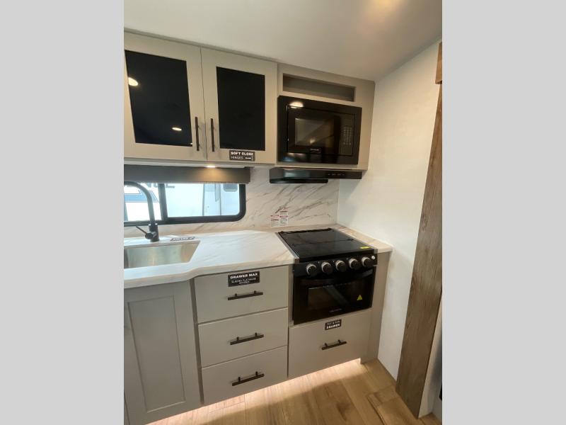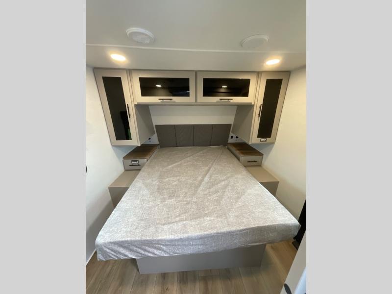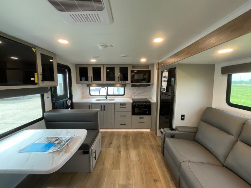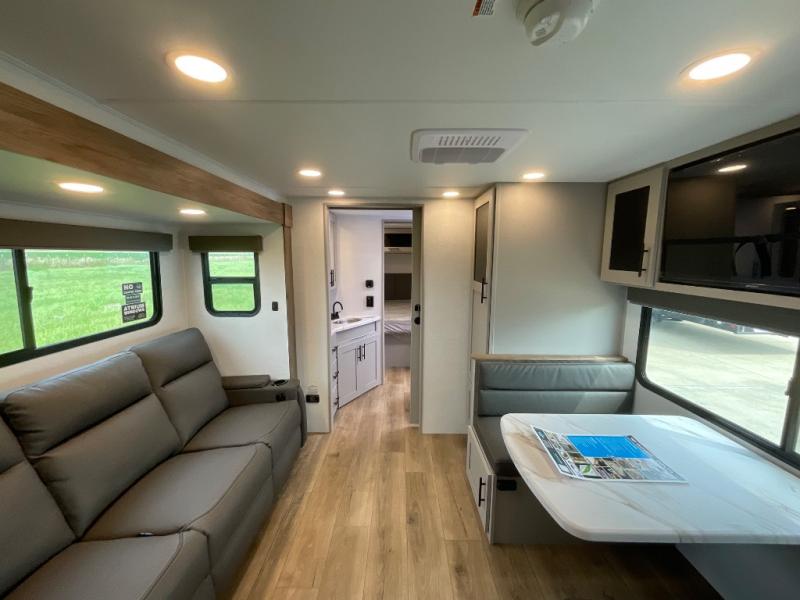 You'll love camping in this rear kitchen travel trailer with generous counter space and overhead storage for spices, dishes, and more. You can dine each day at the booth dinette or relax on the sofa slide out, which will provide more floor space. The spacious walk-thru bath includes a 30" x 36" shower, toilet, and vanity so you can clean up each day. Head to the front master bedroom where you can sleep soundly on the walk-around queen bed with dual nightstands and wardrobes. The second entry door is also found in this room so you can slip out for an early morning run!