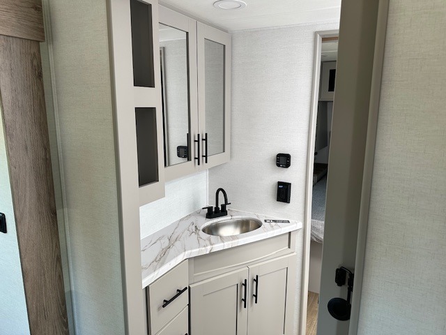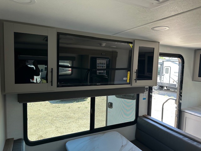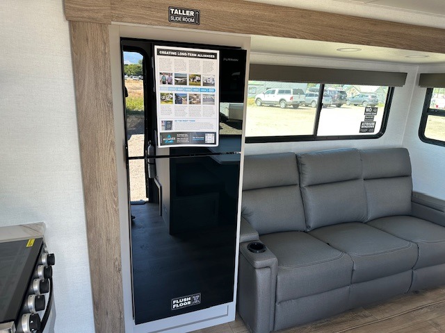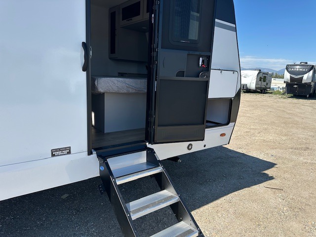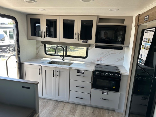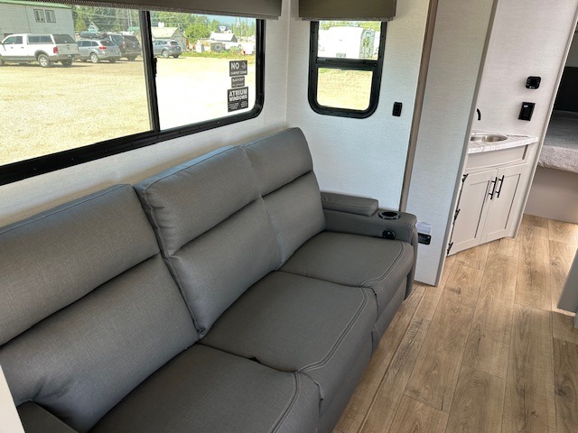 You'll love camping in this rear kitchen travel trailer with generous counter space and overhead storage for spices, dishes, and more. You can dine each day at the booth dinette or relax on the sofa slide out, which will provide more floor space. The spacious walk-thru bath includes a 30" x 36" shower, toilet, and vanity so you can clean up each day. Head to the front master bedroom where you can sleep soundly on the walk-around queen bed with dual nightstands and wardrobes. The second entry door is also found in this room so you can slip out for an early morning run!