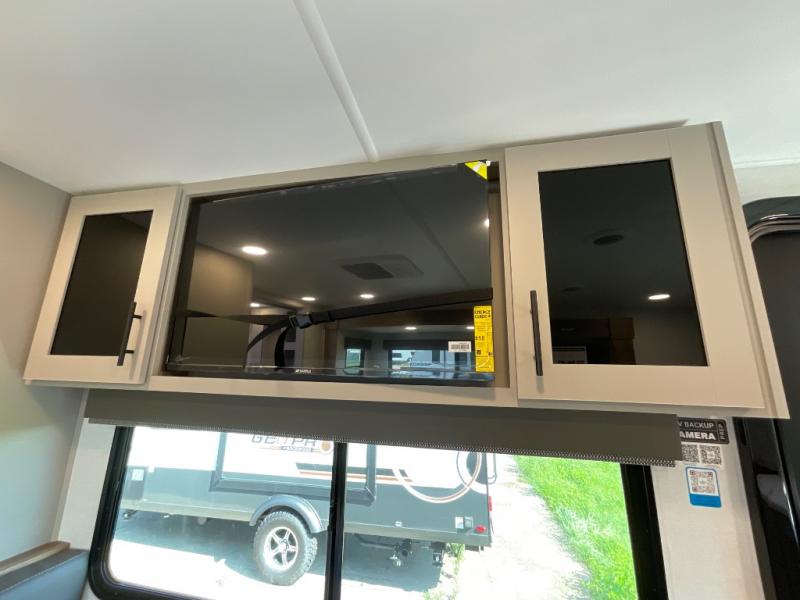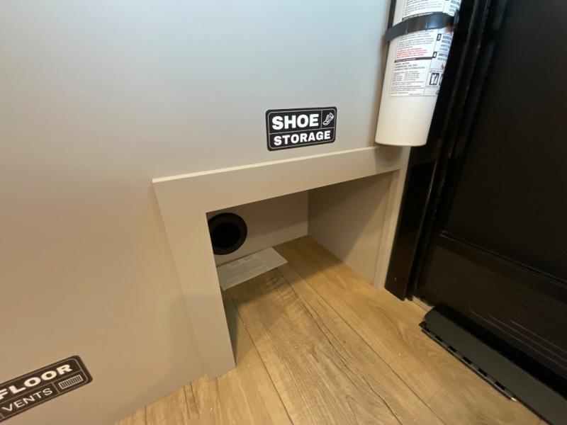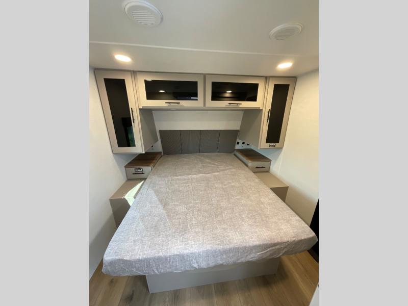 You'll love camping in this rear kitchen travel trailer with generous counter space and overhead storage for spices, dishes, and more. You can dine each day at the booth dinette or relax on the sofa slide out, which will provide more floor space. The spacious walk-thru bath includes a 30" x 36" shower, toilet, and vanity so you can clean up each day. Head to the front master bedroom where you can sleep soundly on the walk-around queen bed with dual nightstands and wardrobes. The second entry door is also found in this room so you can slip out for an early morning run!