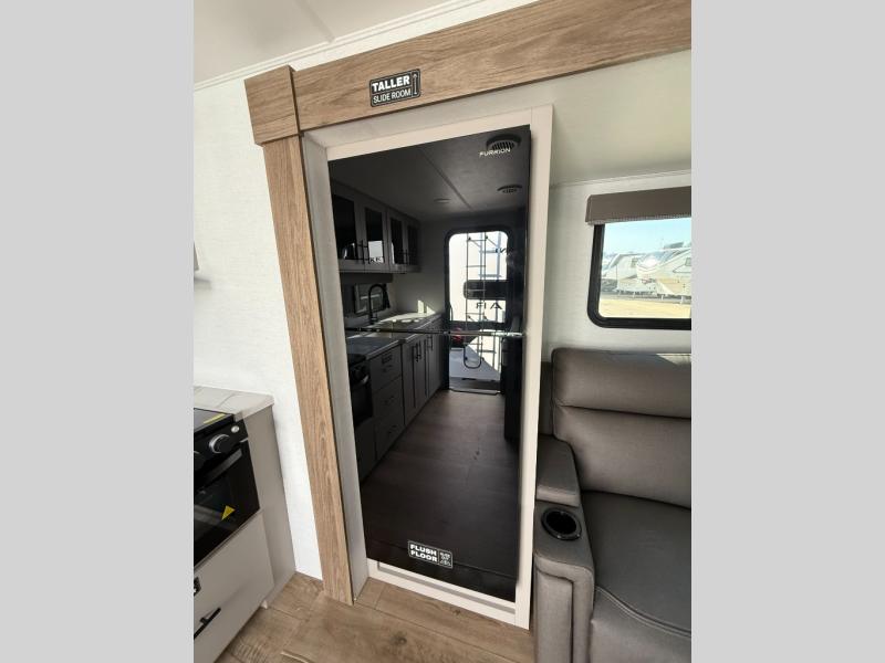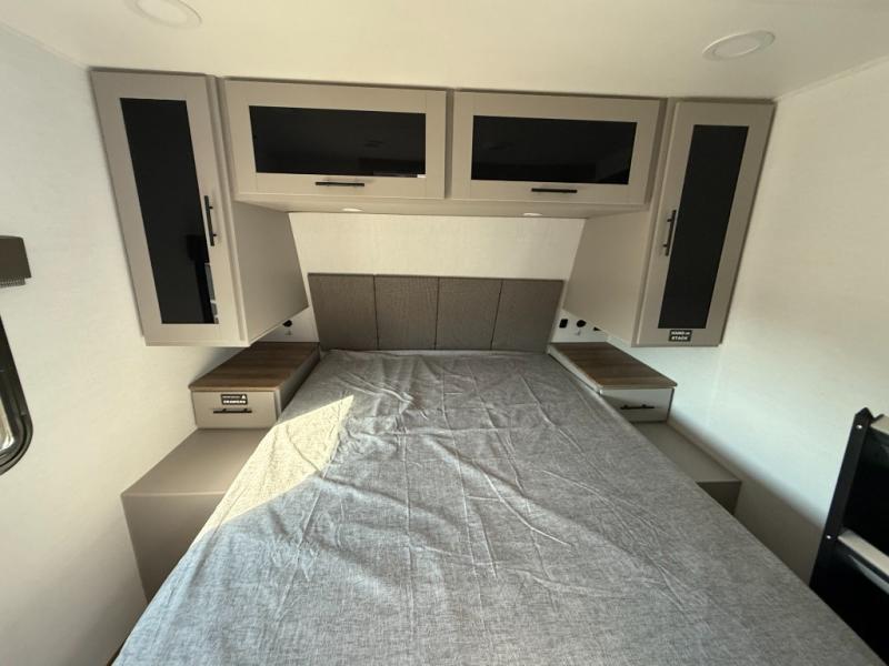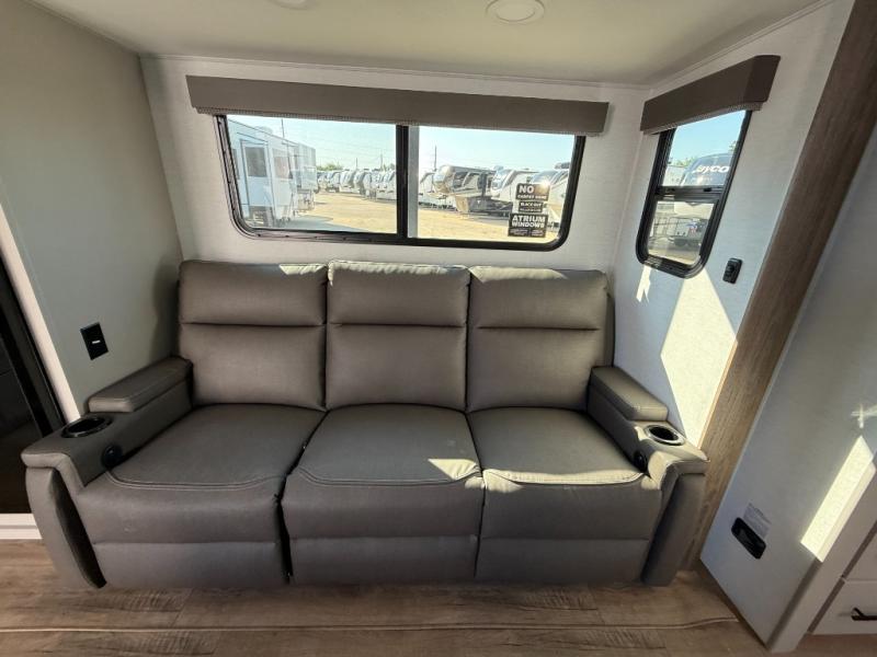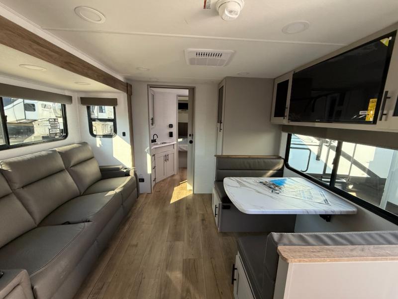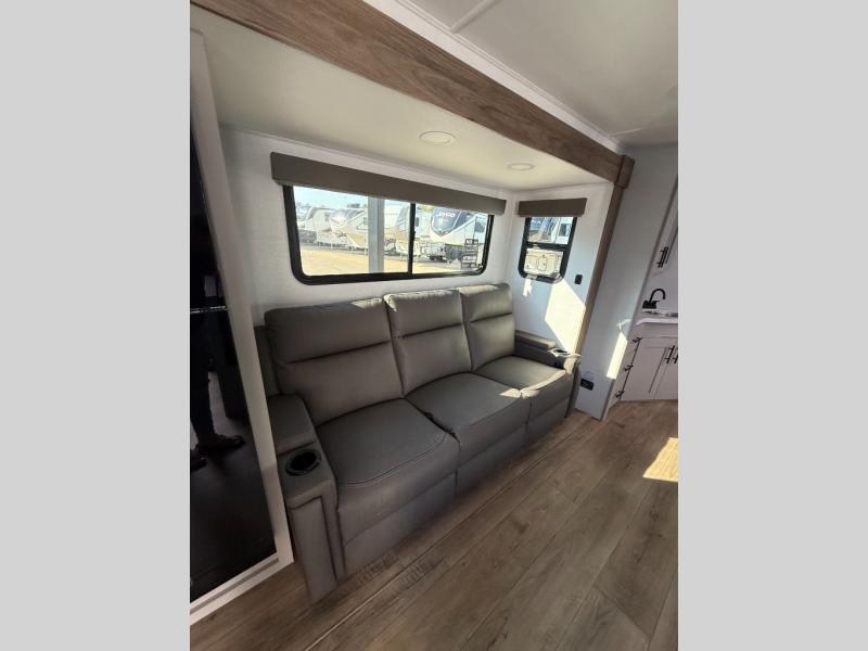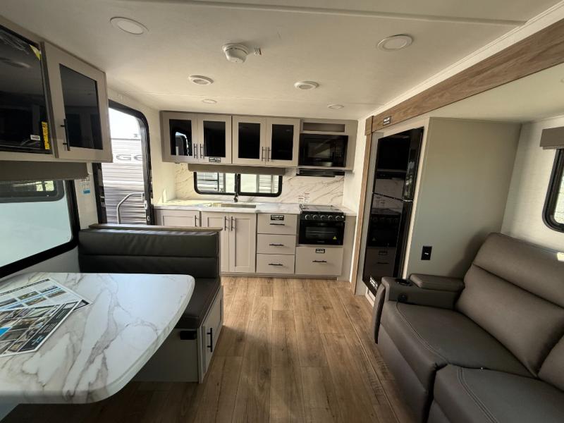You'll love camping in this rear kitchen travel trailer with generous counter space and overhead storage for spices, dishes, and more. You can dine each day at the booth dinette or relax on the sofa slide out, which will provide more floor space. The spacious walk-thru bath includes a 30" x 36" shower, toilet, and vanity so you can clean up each day. Head to the front master bedroom where you can sleep soundly on the walk-around queen bed with dual nightstands and wardrobes. The second entry door is also found in this room so you can slip out for an early morning run!