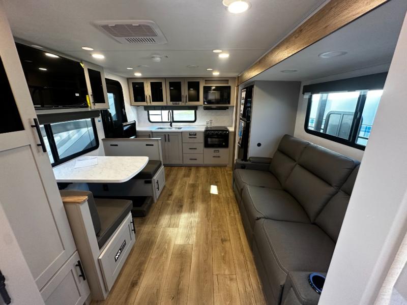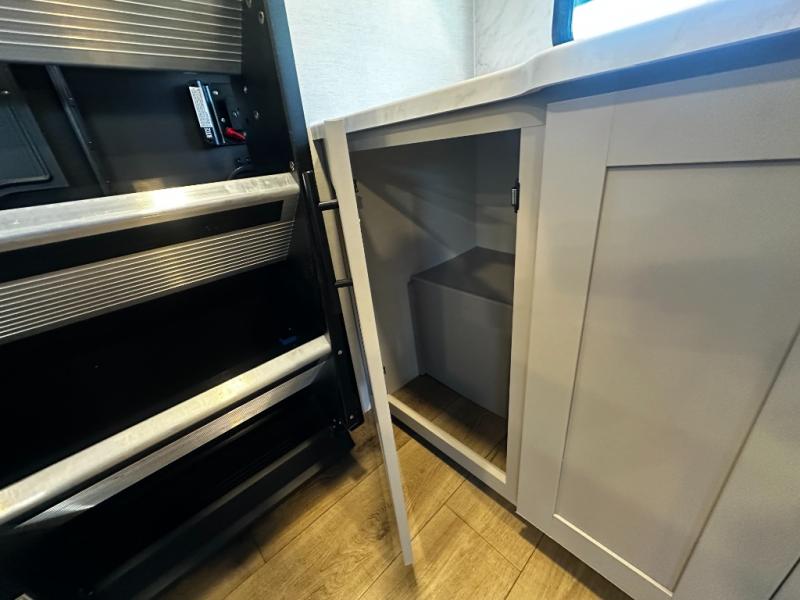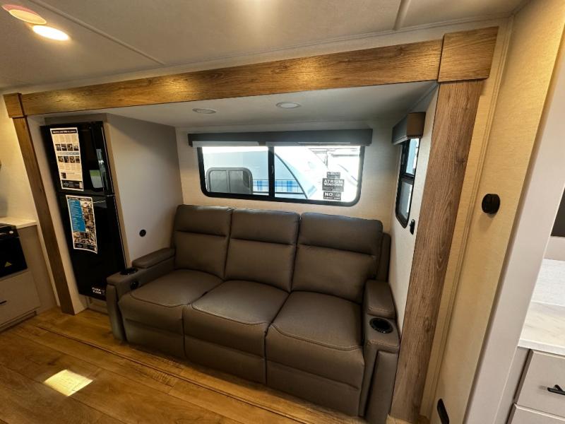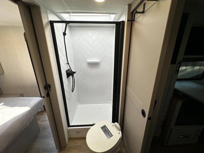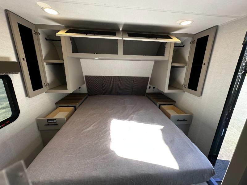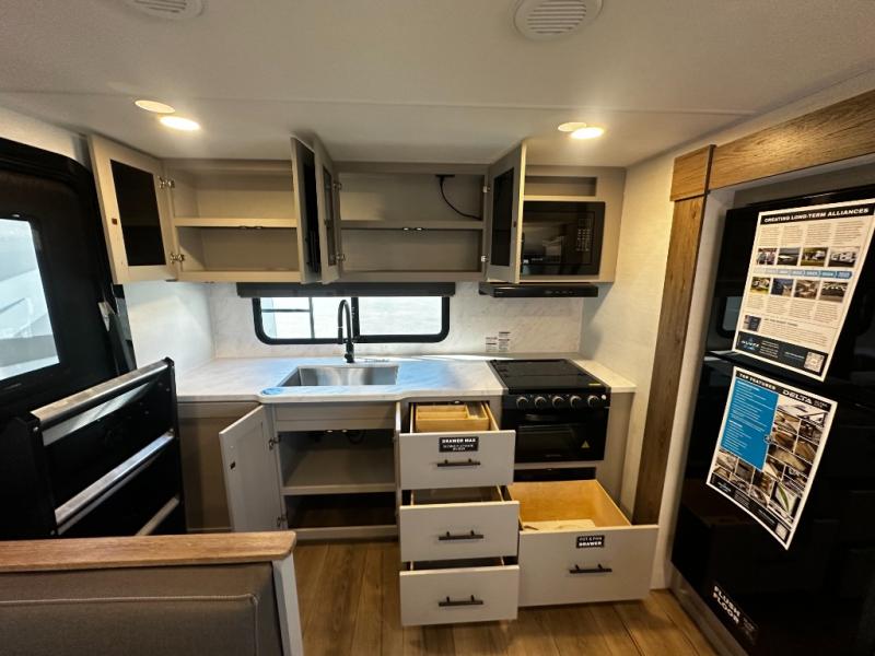 You'll love camping in this rear kitchen travel trailer with generous counter space and overhead storage for spices, dishes, and more. You can dine each day at the booth dinette or relax on the sofa slide out, which will provide more floor space. The spacious walk-thru bath includes a 30" x 36" shower, toilet, and vanity so you can clean up each day. Head to the front master bedroom where you can sleep soundly on the walk-around queen bed with dual nightstands and wardrobes. The second entry door is also found in this room so you can slip out for an early morning run!