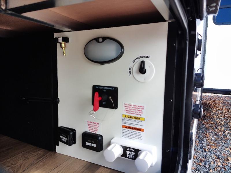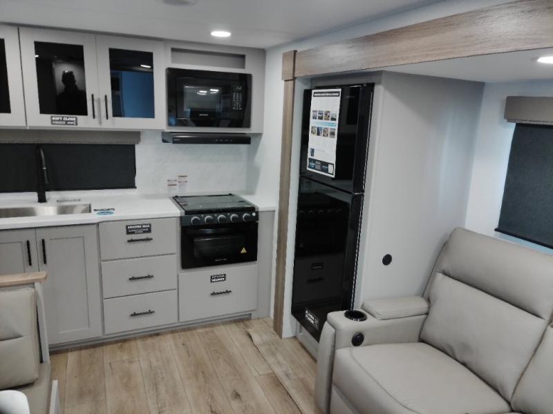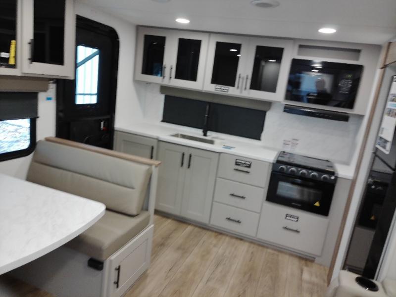You'll love camping in this rear kitchen travel trailer with generous counter space and overhead storage for spices, dishes, and more. You can dine each day at the booth dinette or relax on the sofa slide out, which will provide more floor space. The spacious walk-thru bath includes a 30" x 36" shower, toilet, and vanity so you can clean up each day. Head to the front master bedroom where you can sleep soundly on the walk-around queen bed with dual nightstands and wardrobes. The second entry door is also found in this room so you can slip out for an early morning run!