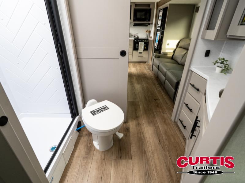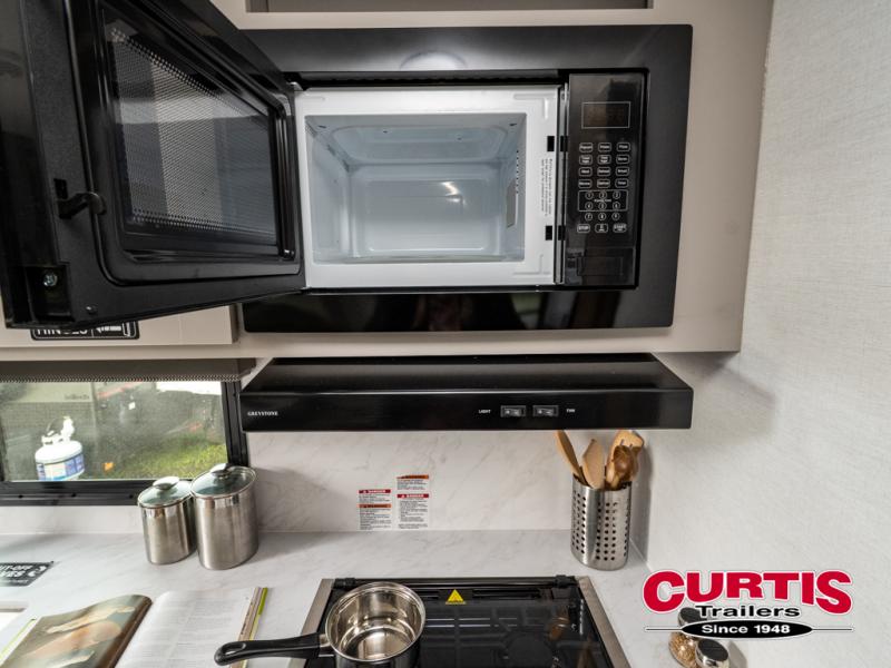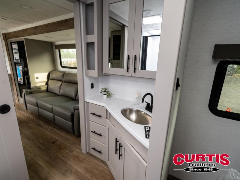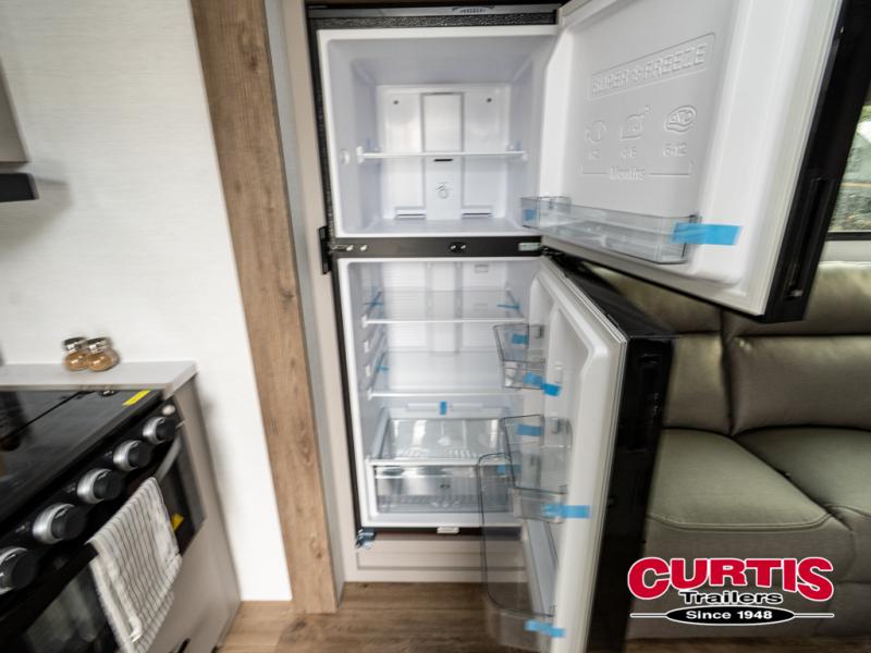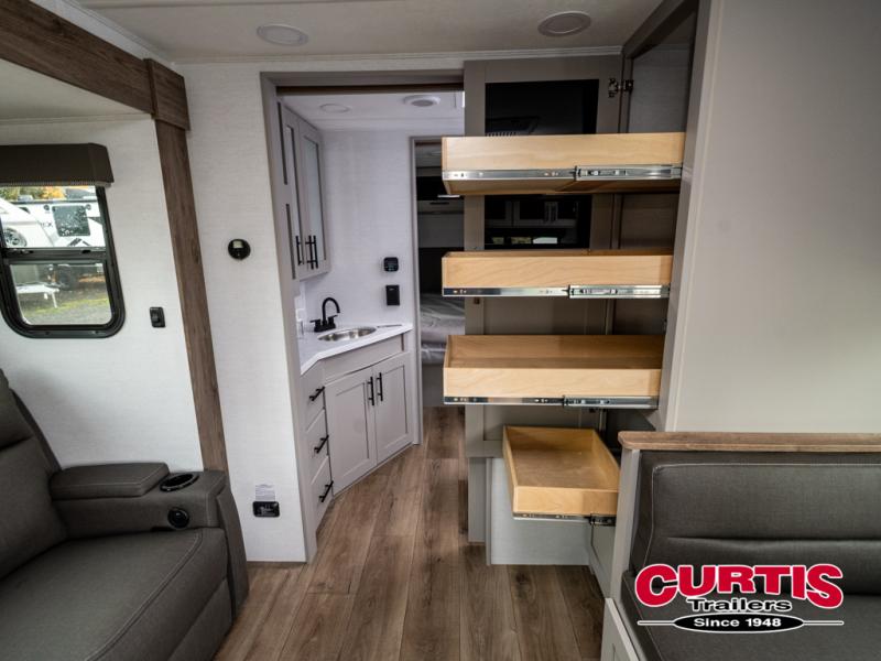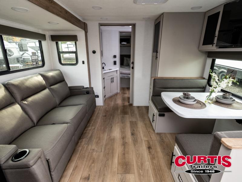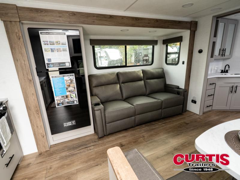 You'll love camping in this rear kitchen travel trailer with generous counter space and overhead storage for spices, dishes, and more. You can dine each day at the booth dinette or relax on the sofa slide out, which will provide more floor space. The spacious walk-thru bath includes a 30" x 36" shower, toilet, and vanity so you can clean up each day. Head to the front master bedroom where you can sleep soundly on the walk-around queen bed with dual nightstands and wardrobes. The second entry door is also found in this room so you can slip out for an early morning run!