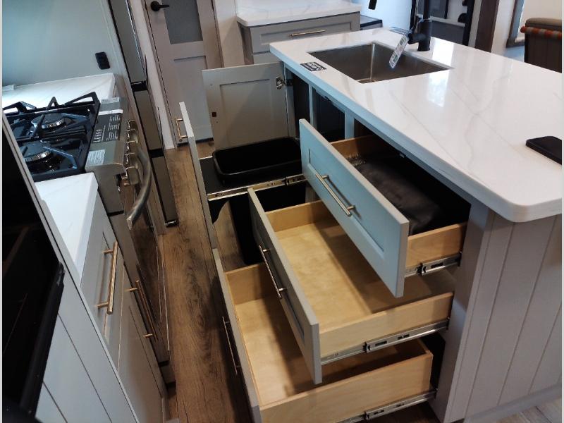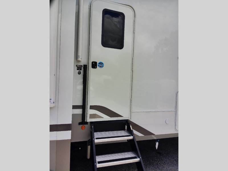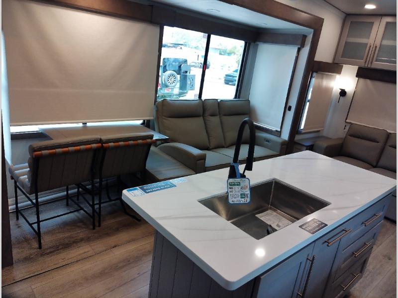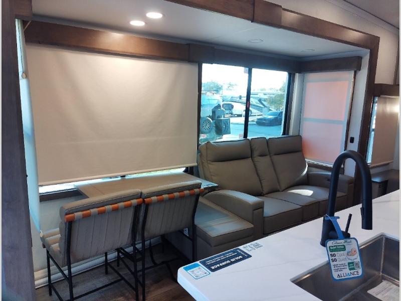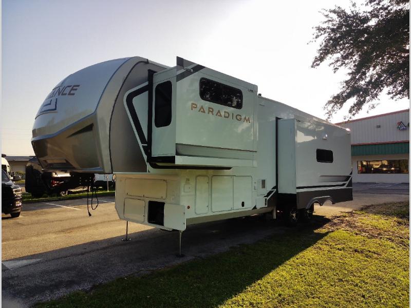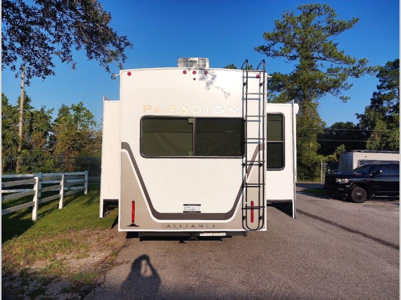 The Paradigm fifth wheels by Alliance RV are functional, high-quality, and luxurious for an unforgettable camping experience. There are three A/C units and a 40K BTU furnace to keep you comfortable year around, and you'll appreciate additional convenient amenities, like the all-in-one enclosed/heated utility center and the color coded and numbered wiring. A Helux Series coil spring pin box comes standard for hassle-free towing, along with Super-G 4,400 lb. rated tires and Dexter 7,000 lb. axles. You'll love the kitchen with its LG solid surface countertops and Lusso range, plus there is LED motion lighting in the pantry and a Maxx fan with a rain sensor to keep everything fresh when making dinner. Each model also includes an HD Smart TV in the living room and bedroom, plus a Winegard Air 360 antenna to keep you connected to the outside world. And of course there are a variety of options you can choose from to further customize your fifth wheel; dual pane windows, Super Solar Plus, slide out awning toppers, and generator prep or a generator to name a few!