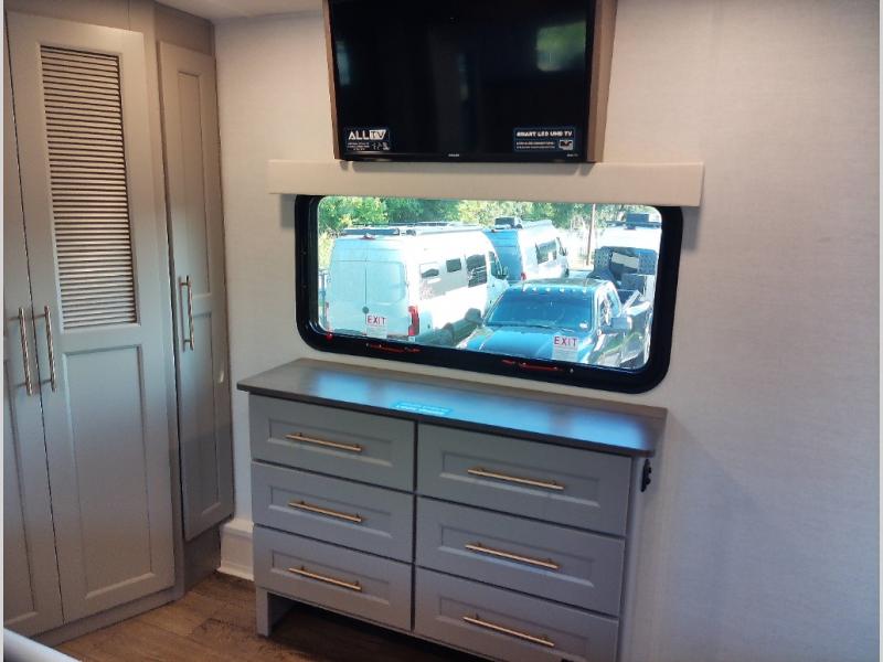 Search for the best views, the nicest RV park, or a place you haven't seen for years with this Paradigm in tow! There is a king bed slide in the master bedroom, a Smart TV, and a dresser with flip-up hidden storage for your belongings. The full bathroom offers a large residential shower, a porcelain toilet with a soft close seat, and storage for your linens, while the kitchen gives you two pantries, an island with a large undermount single basin sink and dishwasher prep if you want the option for easy clean up. You will also have a residential microwave and range, plus a 3.73 cu. ft. oven to make meals. When you're ready to relax for the evening, head to the rear living area to enjoy the dual recliner love seat across from the 50" Smart TV and fireplace!