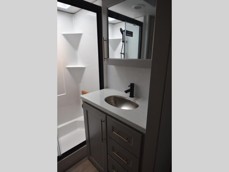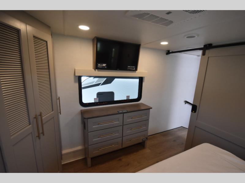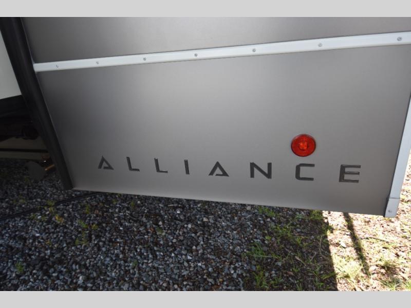 The Paradigm fifth wheels by Alliance RV are functional, high-quality, and luxurious for an unforgettable camping experience. There are three A/C units and a 40K BTU furnace to keep you comfortable year around, and you'll appreciate additional convenient amenities, like the all-in-one enclosed/heated utility center and the color coded and numbered wiring. A Helux Series coil spring pin box comes standard for hassle-free towing, along with Super-G 4,400 lb. rated tires and Dexter 7,000 lb. axles. You'll love the kitchen with its LG solid surface countertops and Lusso range, plus there is LED motion lighting in the pantry and a Maxx fan with a rain sensor to keep everything fresh when making dinner. Each model also includes an HD Smart TV in the living room and bedroom, plus a Winegard Air 360 antenna to keep you connected to the outside world. And of course there are a variety of options you can choose from to further customize your fifth wheel; dual pane windows, Super Solar Plus, slide out awning toppers, and generator prep or a generator to name a few!
