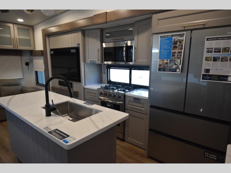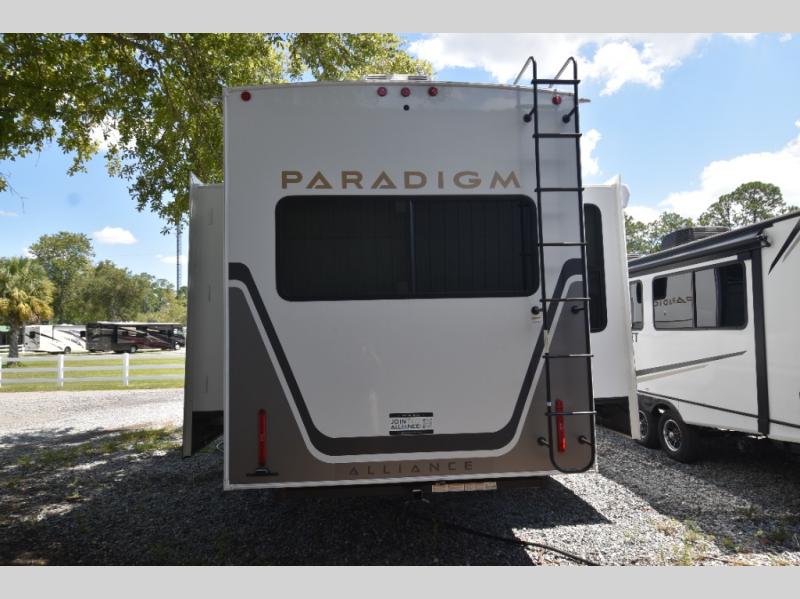 Search for the best views, the nicest RV park, or a place you haven't seen for years with this Paradigm in tow! There is a king bed slide in the master bedroom, a Smart TV, and a dresser with flip-up hidden storage for your belongings. The full bathroom offers a large residential shower, a porcelain toilet with a soft close seat, and storage for your linens, while the kitchen gives you two pantries, an island with a large undermount single basin sink and dishwasher prep if you want the option for easy clean up. You will also have a residential microwave and range, plus a 3.73 cu. ft. oven to make meals. When you're ready to relax for the evening, head to the rear living area to enjoy the dual recliner love seat across from the 50" Smart TV and fireplace!
