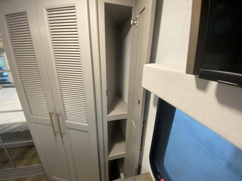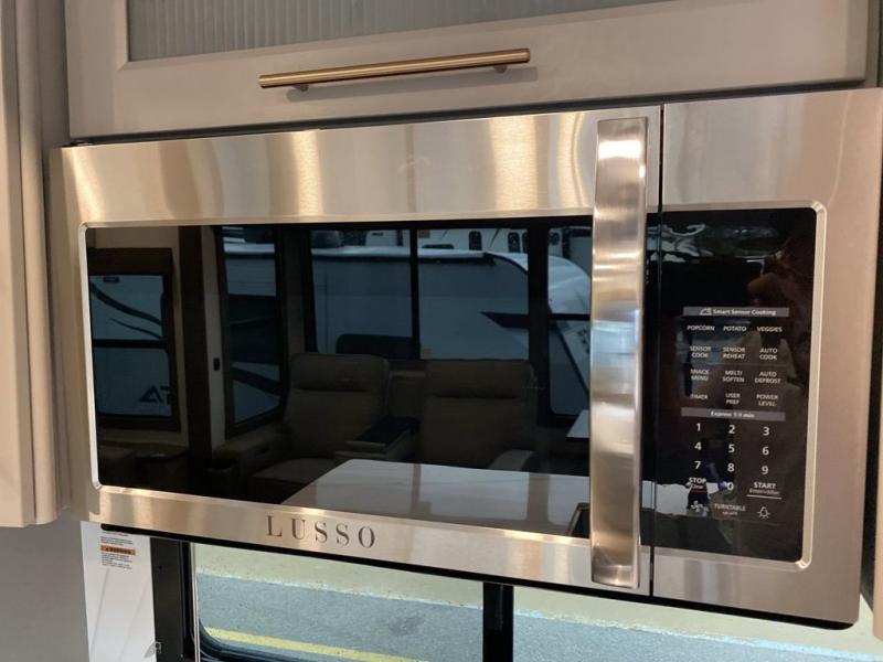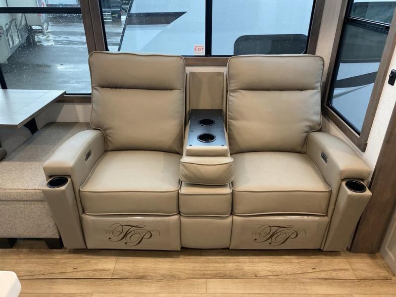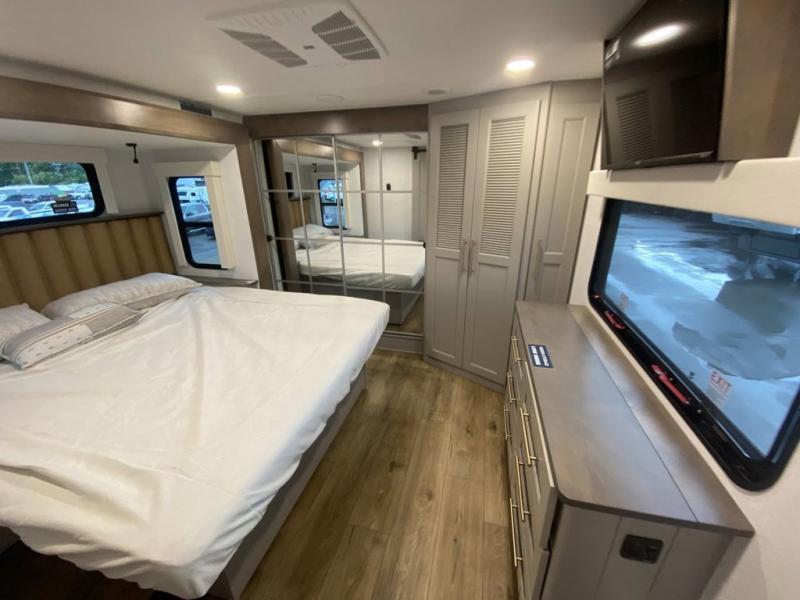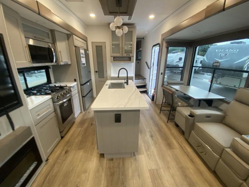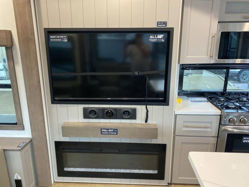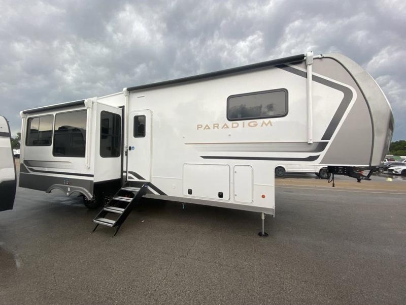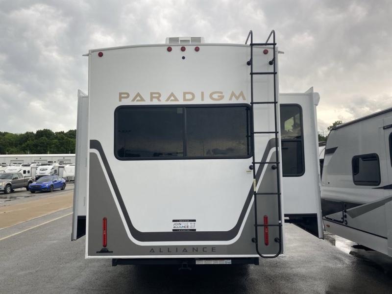 Search for the best views, the nicest RV park, or a place you haven't seen for years with this Paradigm in tow! There is a king bed slide in the master bedroom, a Smart TV, and a dresser with flip-up hidden storage for your belongings. The full bathroom offers a large residential shower, a porcelain toilet with a soft close seat, and storage for your linens, while the kitchen gives you two pantries, an island with a large undermount single basin sink and dishwasher prep if you want the option for easy clean up. You will also have a residential microwave and range, plus a 3.73 cu. ft. oven to make meals. When you're ready to relax for the evening, head to the rear living area to enjoy the dual recliner love seat across from the 50" Smart TV and fireplace!