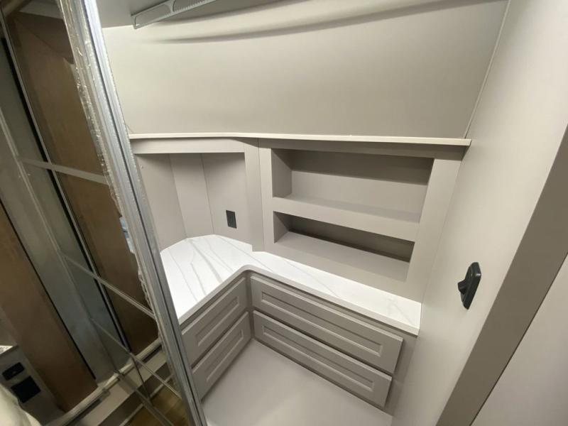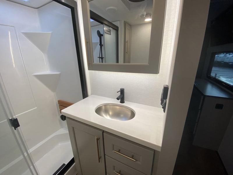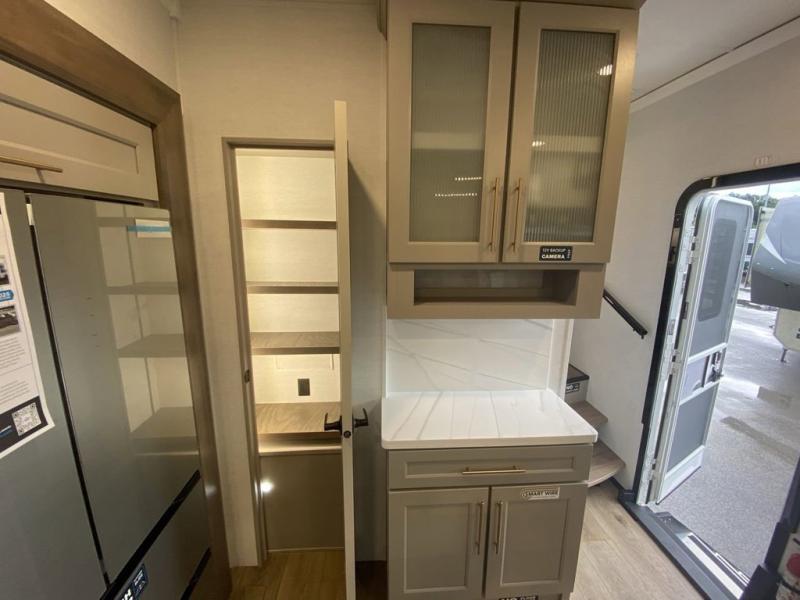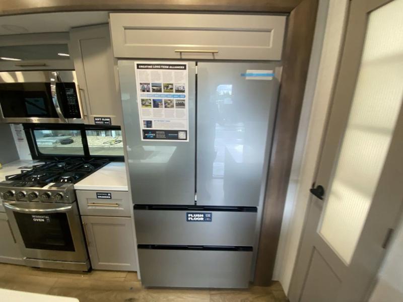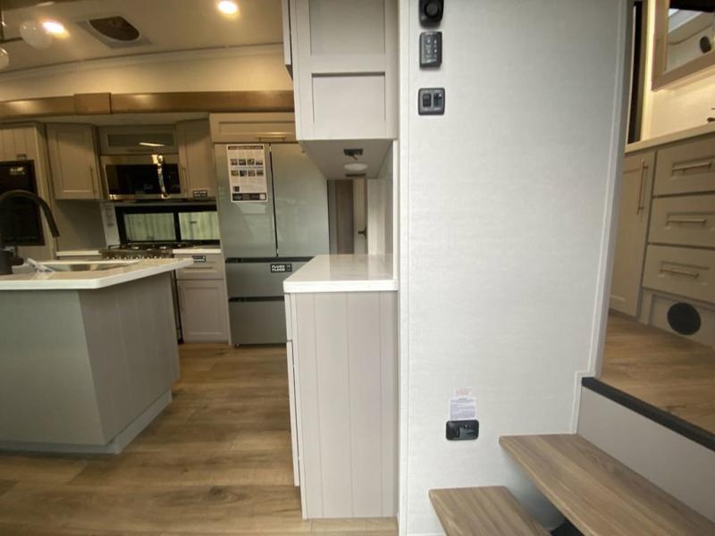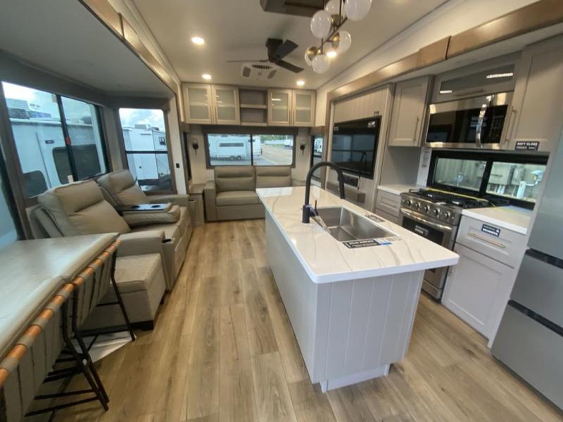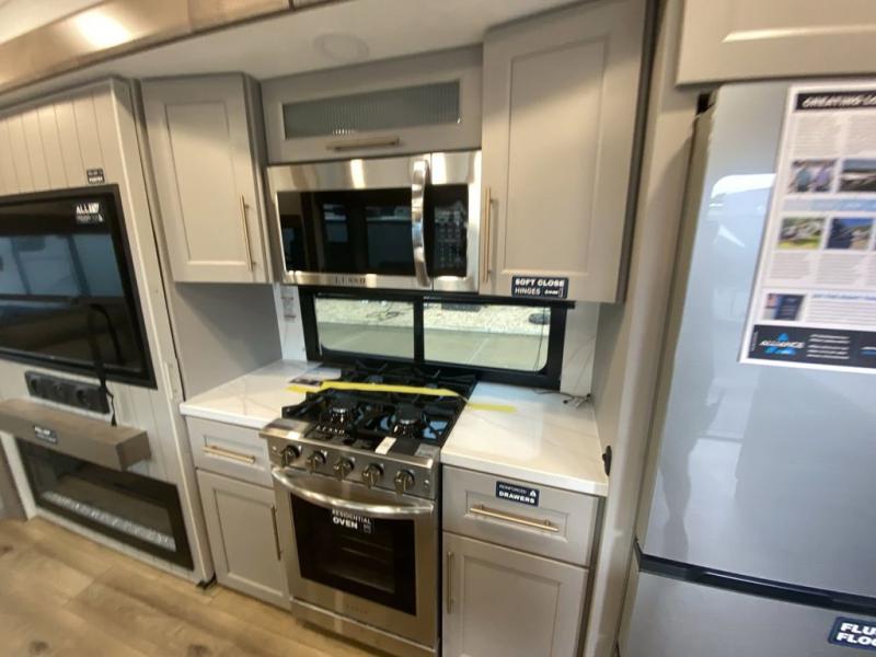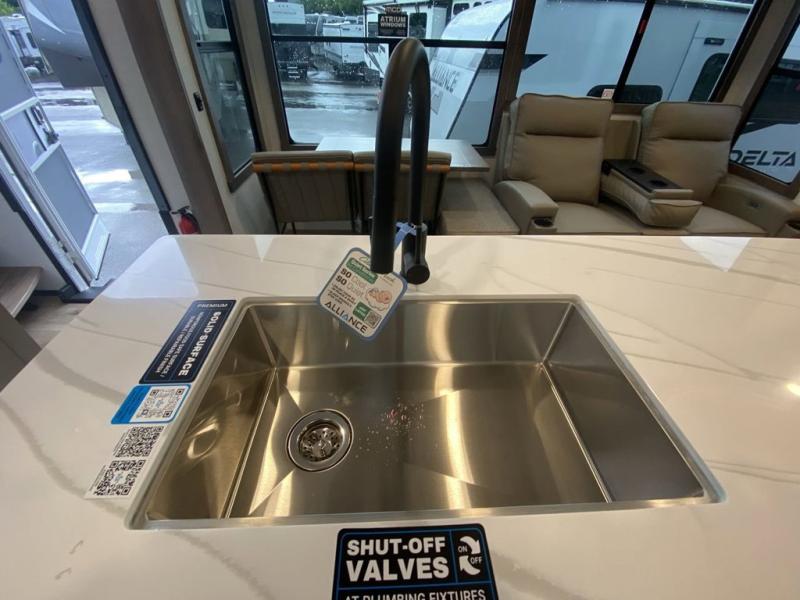 The Paradigm fifth wheels by Alliance RV are functional, high-quality, and luxurious for an unforgettable camping experience. There are three A/C units and a 40K BTU furnace to keep you comfortable year around, and you'll appreciate additional convenient amenities, like the all-in-one enclosed/heated utility center and the color coded and numbered wiring. A Helux Series coil spring pin box comes standard for hassle-free towing, along with Super-G 4,400 lb. rated tires and Dexter 7,000 lb. axles. You'll love the kitchen with its LG solid surface countertops and Lusso range, plus there is LED motion lighting in the pantry and a Maxx fan with a rain sensor to keep everything fresh when making dinner. Each model also includes an HD Smart TV in the living room and bedroom, plus a Winegard Air 360 antenna to keep you connected to the outside world. And of course there are a variety of options you can choose from to further customize your fifth wheel; dual pane windows, Super Solar Plus, slide out awning toppers, and generator prep or a generator to name a few!