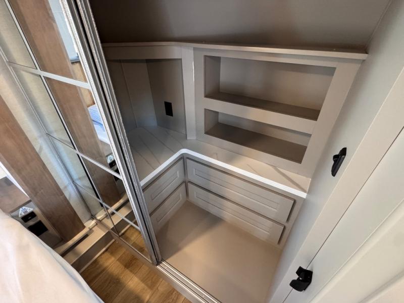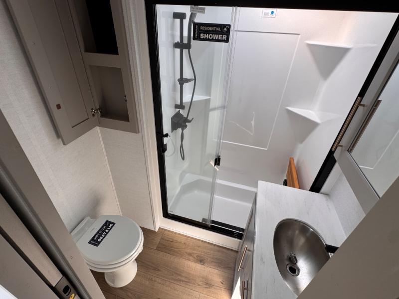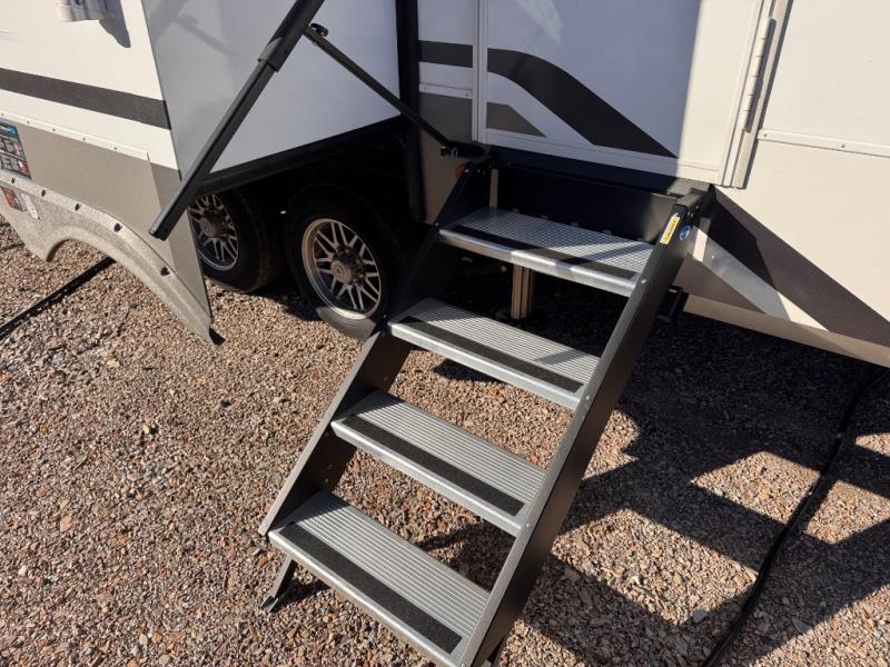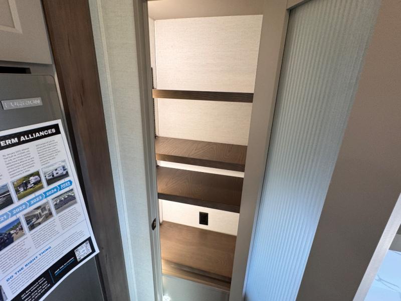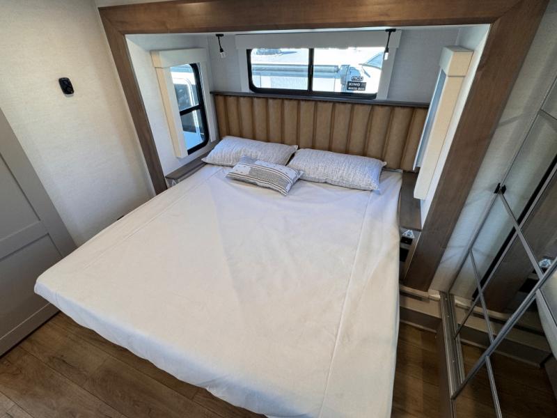 The Paradigm fifth wheels by Alliance RV are functional, high-quality, and luxurious for an unforgettable camping experience. There are three A/C units and a 40K BTU furnace to keep you comfortable year around, and you'll appreciate additional convenient amenities, like the all-in-one enclosed/heated utility center and the color coded and numbered wiring. A Helux Series coil spring pin box comes standard for hassle-free towing, along with Super-G 4,400 lb. rated tires and Dexter 7,000 lb. axles. You'll love the kitchen with its LG solid surface countertops and Lusso range, plus there is LED motion lighting in the pantry and a Maxx fan with a rain sensor to keep everything fresh when making dinner. Each model also includes an HD Smart TV in the living room and bedroom, plus a Winegard Air 360 antenna to keep you connected to the outside world. And of course there are a variety of options you can choose from to further customize your fifth wheel; dual pane windows, Super Solar Plus, slide out awning toppers, and generator prep or a generator to name a few!