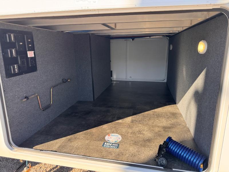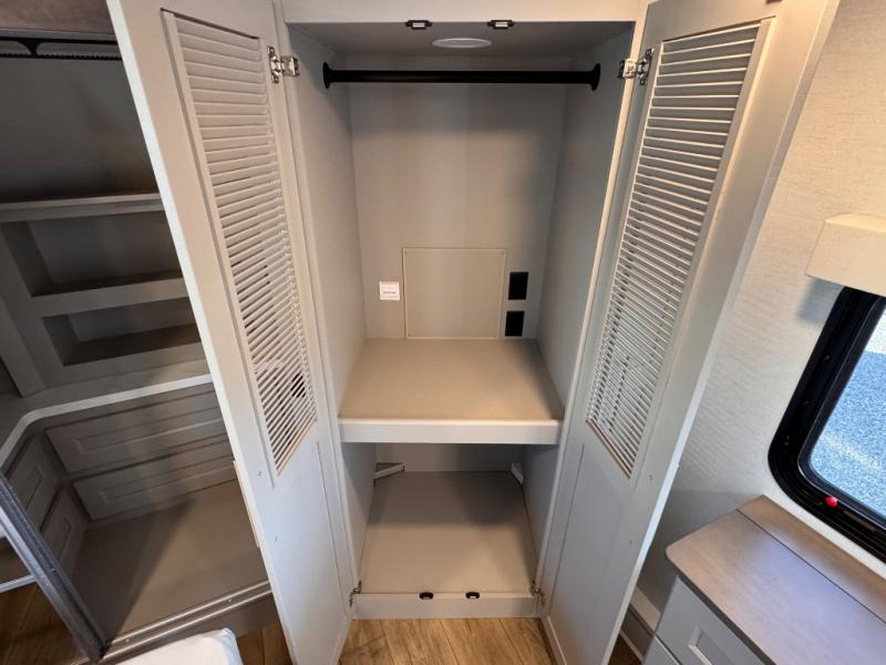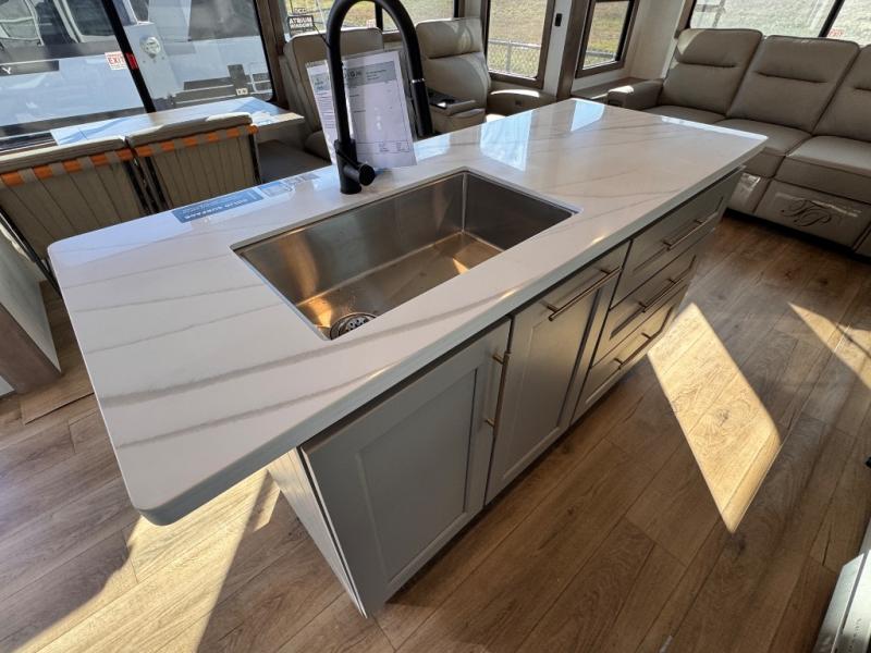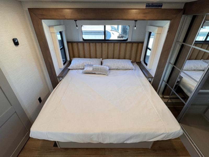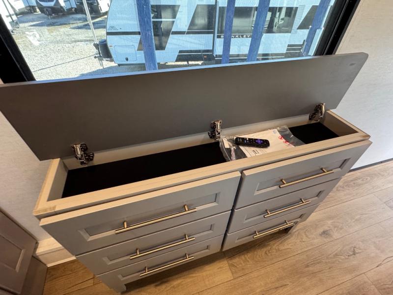 Search for the best views, the nicest RV park, or a place you haven't seen for years with this Paradigm in tow! There is a king bed slide in the master bedroom, a Smart TV, and a dresser with flip-up hidden storage for your belongings. The full bathroom offers a large residential shower, a porcelain toilet with a soft close seat, and storage for your linens, while the kitchen gives you two pantries, an island with a large undermount single basin sink and dishwasher prep if you want the option for easy clean up. You will also have a residential microwave and range, plus a 3.73 cu. ft. oven to make meals. When you're ready to relax for the evening, head to the rear living area to enjoy the dual recliner love seat across from the 50" Smart TV and fireplace!