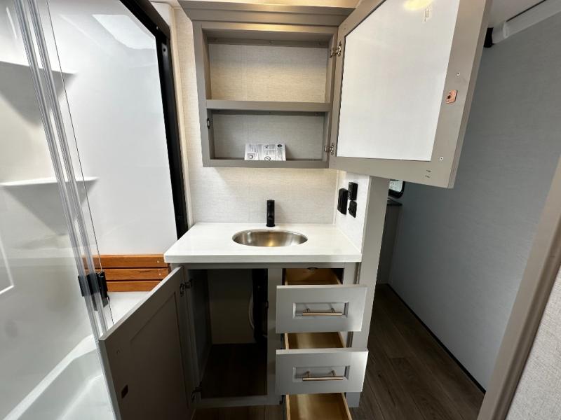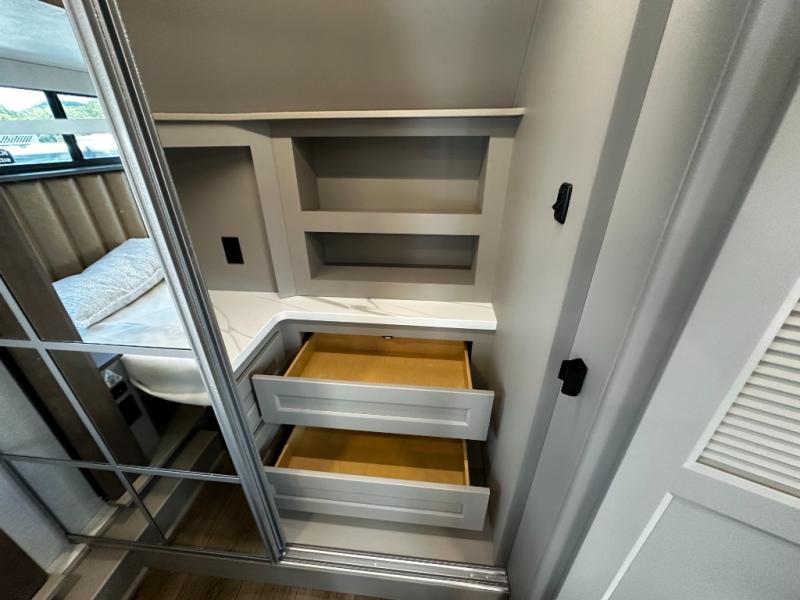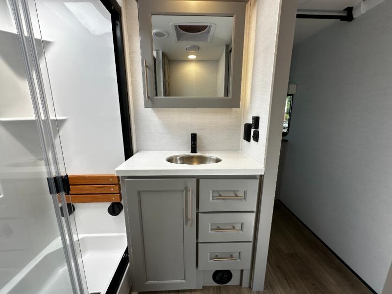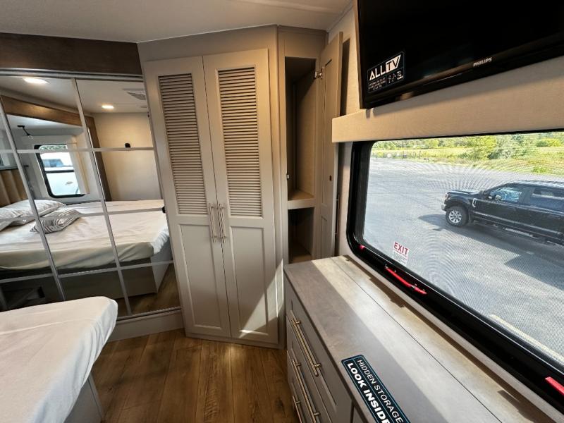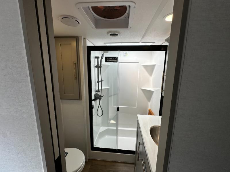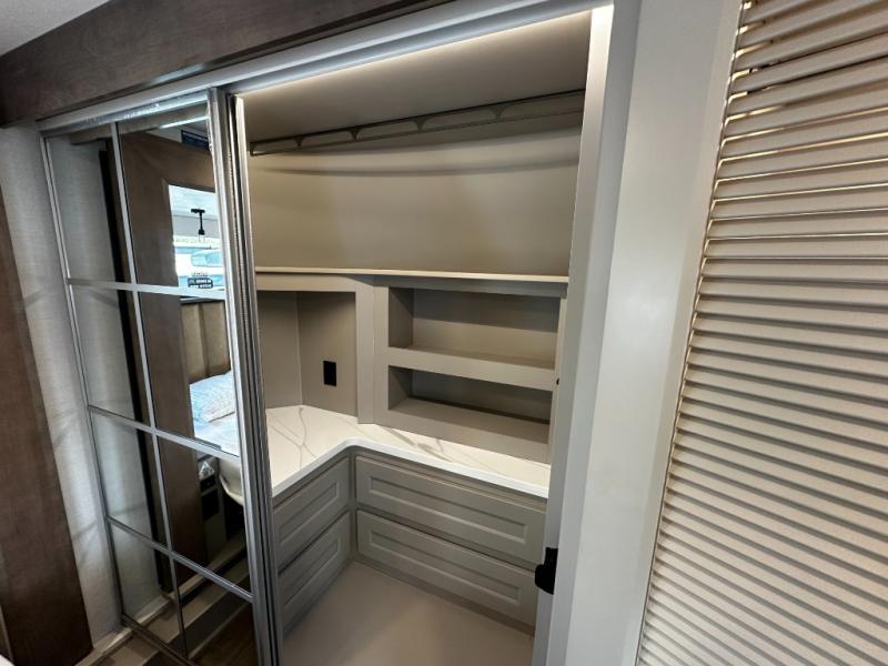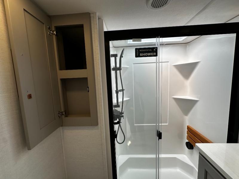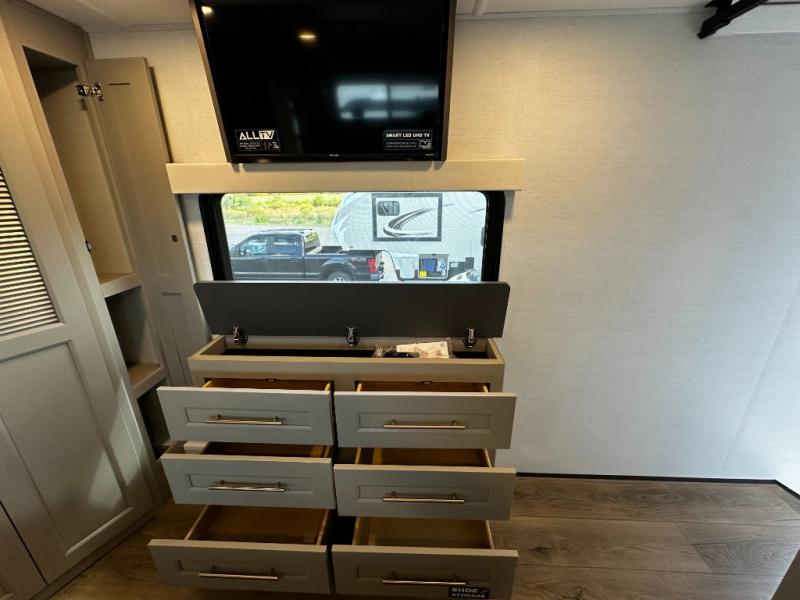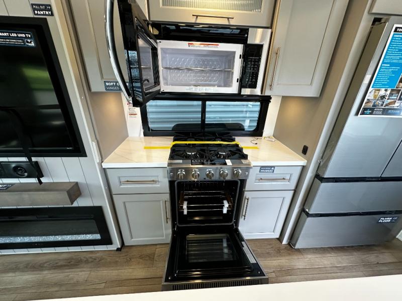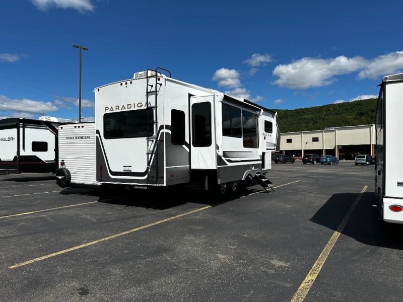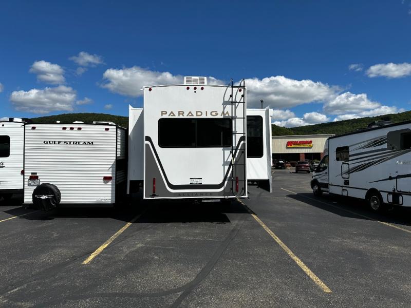 Search for the best views, the nicest RV park, or a place you haven't seen for years with this Paradigm in tow! There is a king bed slide in the master bedroom, a Smart TV, and a dresser with flip-up hidden storage for your belongings. The full bathroom offers a large residential shower, a porcelain toilet with a soft close seat, and storage for your linens, while the kitchen gives you two pantries, an island with a large undermount single basin sink and dishwasher prep if you want the option for easy clean up. You will also have a residential microwave and range, plus a 3.73 cu. ft. oven to make meals. When you're ready to relax for the evening, head to the rear living area to enjoy the dual recliner love seat across from the 50" Smart TV and fireplace!