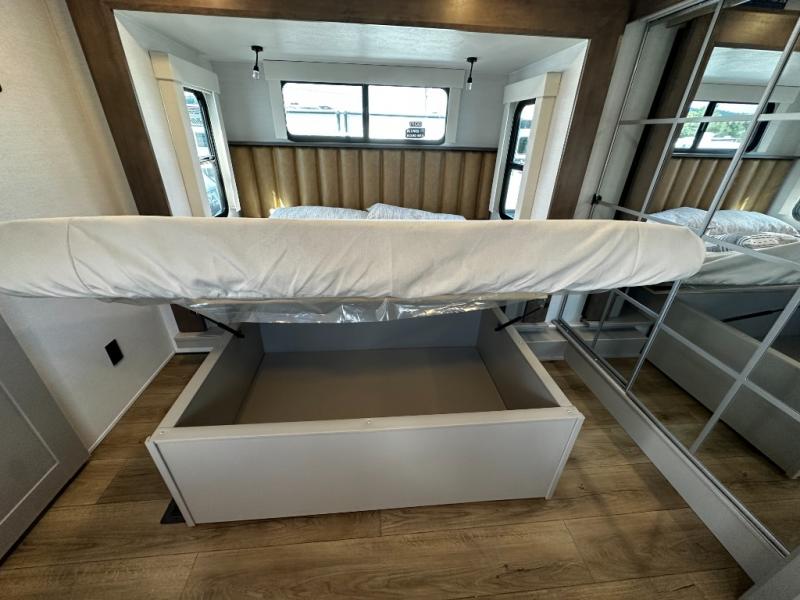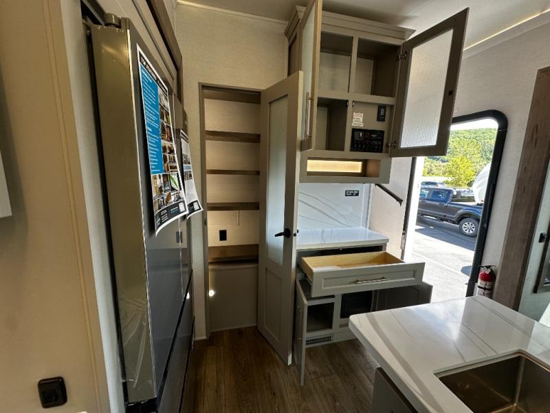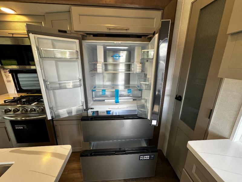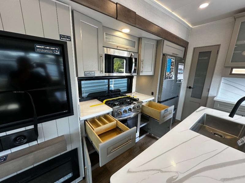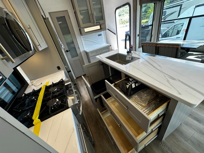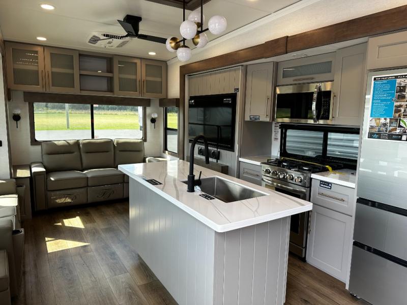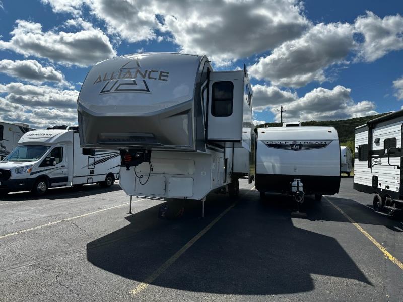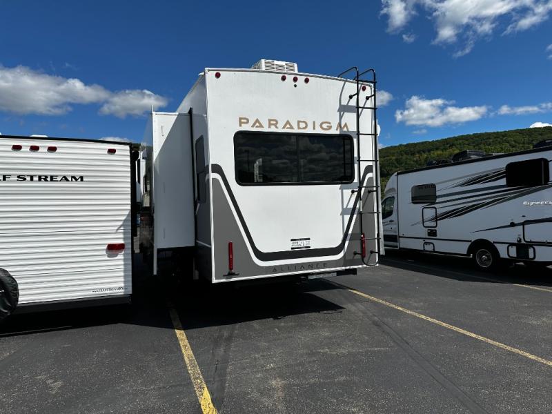 The Paradigm fifth wheels by Alliance RV are functional, high-quality, and luxurious for an unforgettable camping experience. There are three A/C units and a 40K BTU furnace to keep you comfortable year around, and you'll appreciate additional convenient amenities, like the all-in-one enclosed/heated utility center and the color coded and numbered wiring. A Helux Series coil spring pin box comes standard for hassle-free towing, along with Super-G 4,400 lb. rated tires and Dexter 7,000 lb. axles. You'll love the kitchen with its LG solid surface countertops and Lusso range, plus there is LED motion lighting in the pantry and a Maxx fan with a rain sensor to keep everything fresh when making dinner. Each model also includes an HD Smart TV in the living room and bedroom, plus a Winegard Air 360 antenna to keep you connected to the outside world. And of course there are a variety of options you can choose from to further customize your fifth wheel; dual pane windows, Super Solar Plus, slide out awning toppers, and generator prep or a generator to name a few!