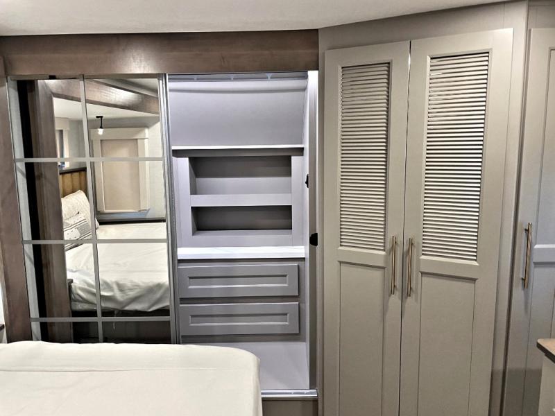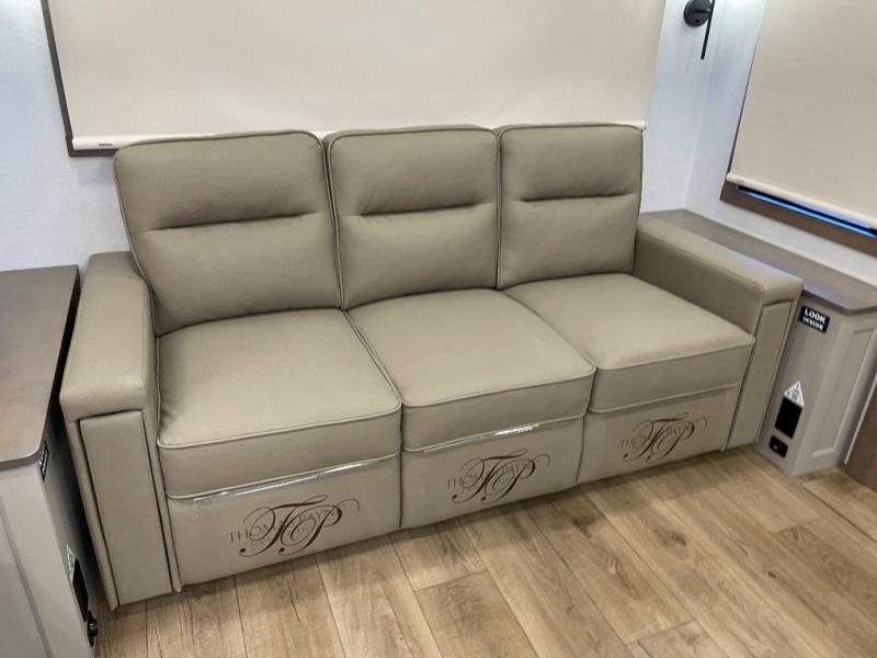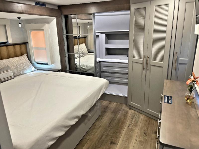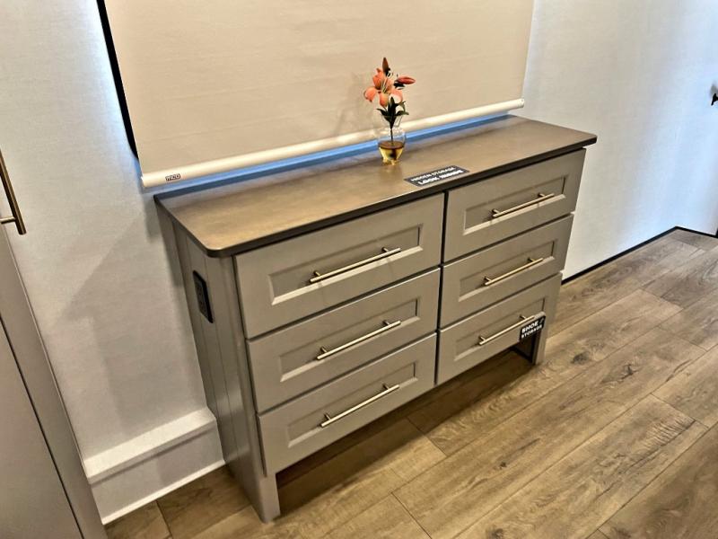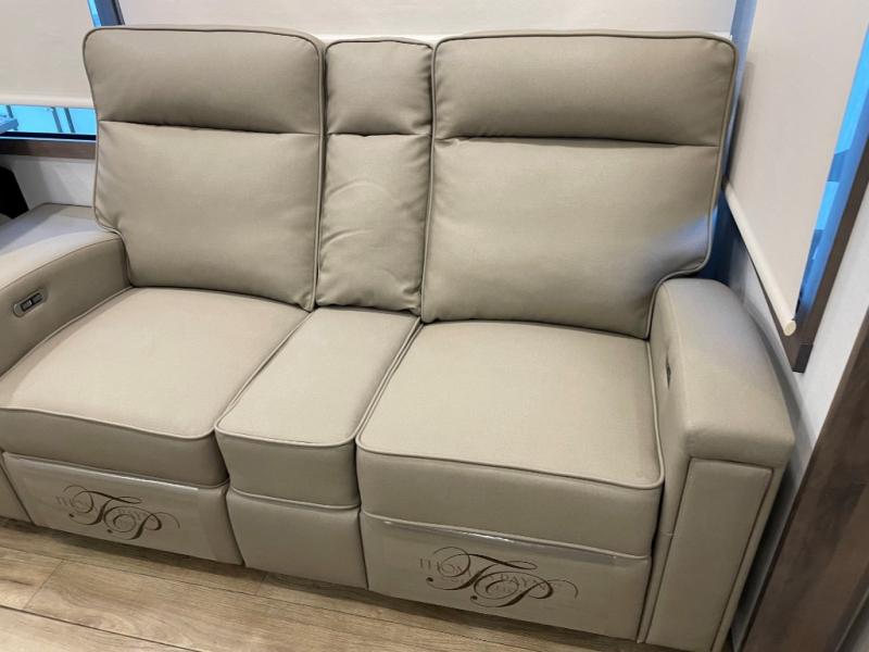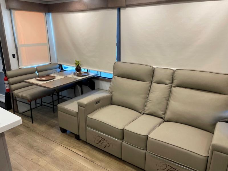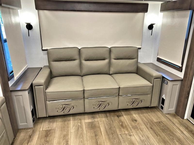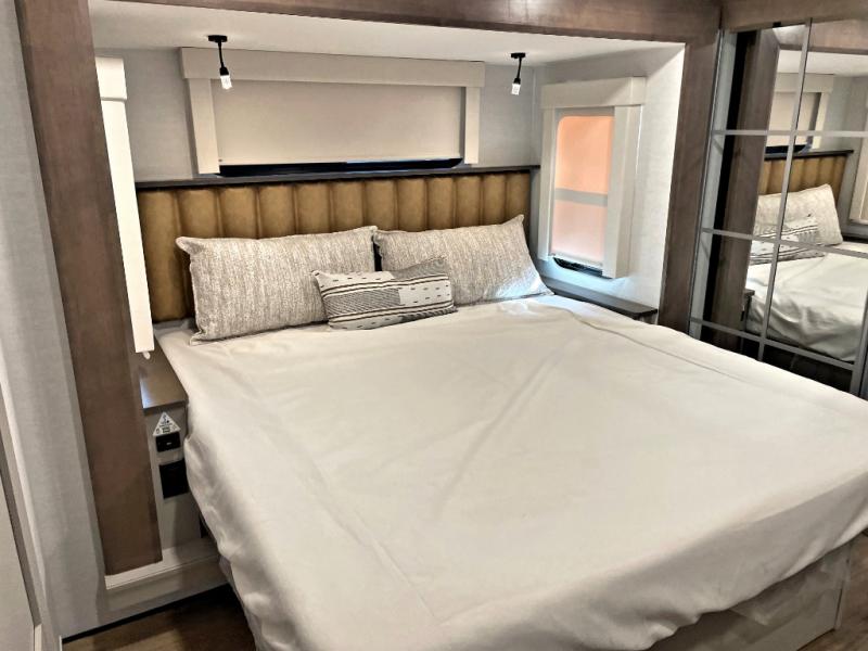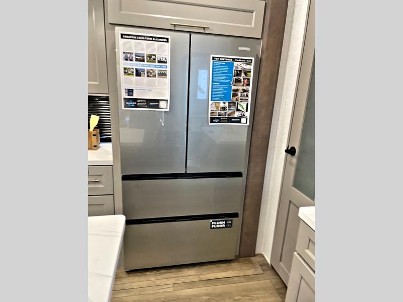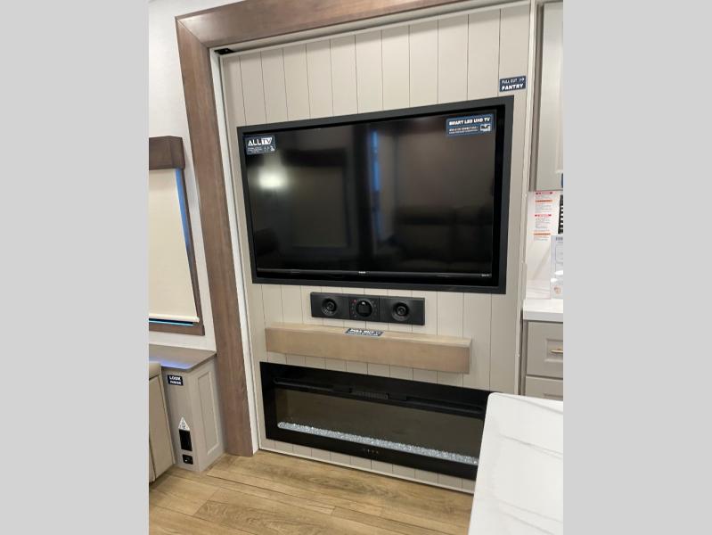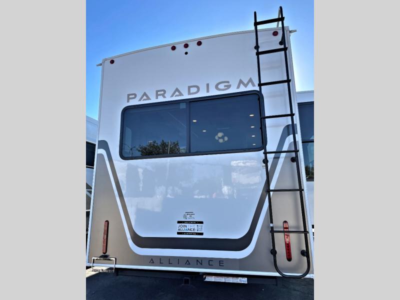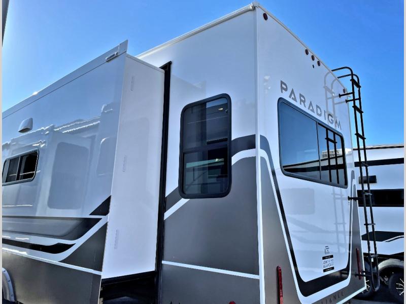 Search for the best views, the nicest RV park, or a place you haven't seen for years with this Paradigm in tow! There is a king bed slide in the master bedroom, a Smart TV, and a dresser with flip-up hidden storage for your belongings. The full bathroom offers a large residential shower, a porcelain toilet with a soft close seat, and storage for your linens, while the kitchen gives you two pantries, an island with a large undermount single basin sink and dishwasher prep if you want the option for easy clean up. You will also have a residential microwave and range, plus a 3.73 cu. ft. oven to make meals. When you're ready to relax for the evening, head to the rear living area to enjoy the dual recliner love seat across from the 50" Smart TV and fireplace!