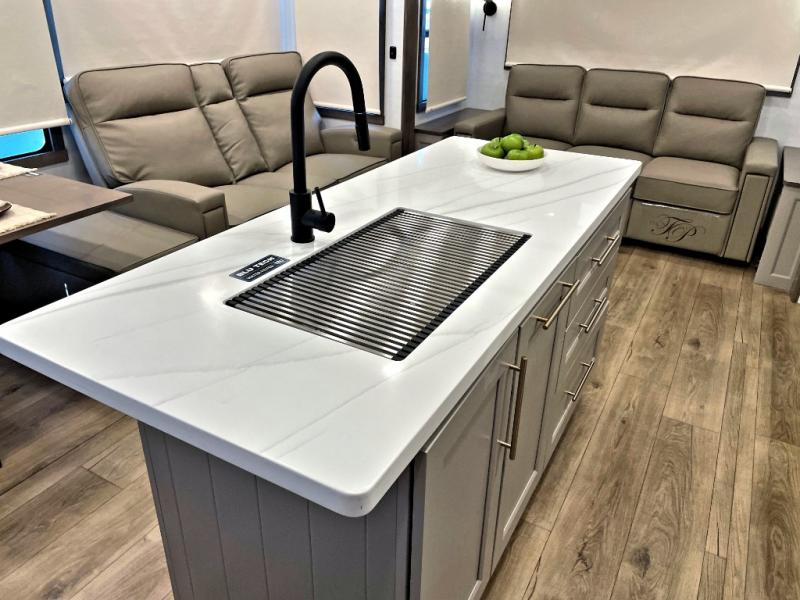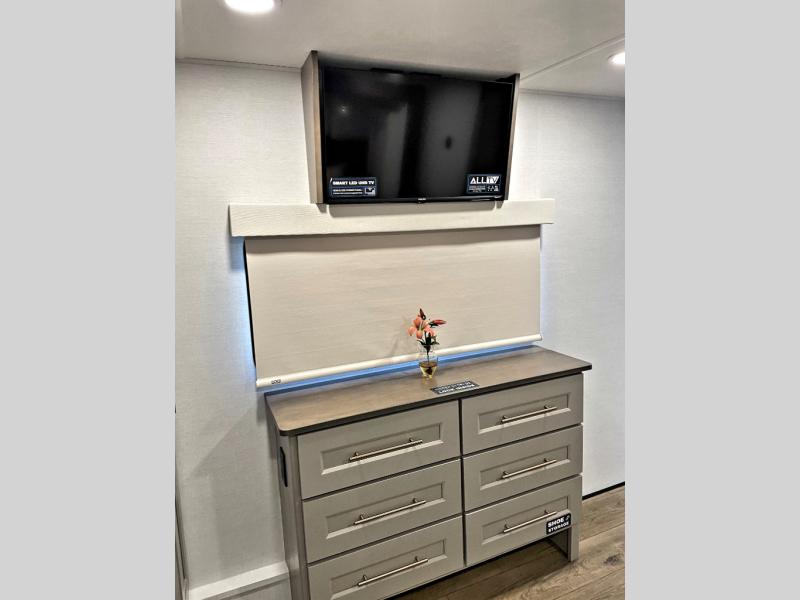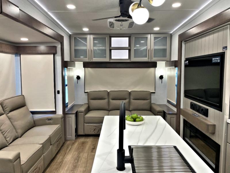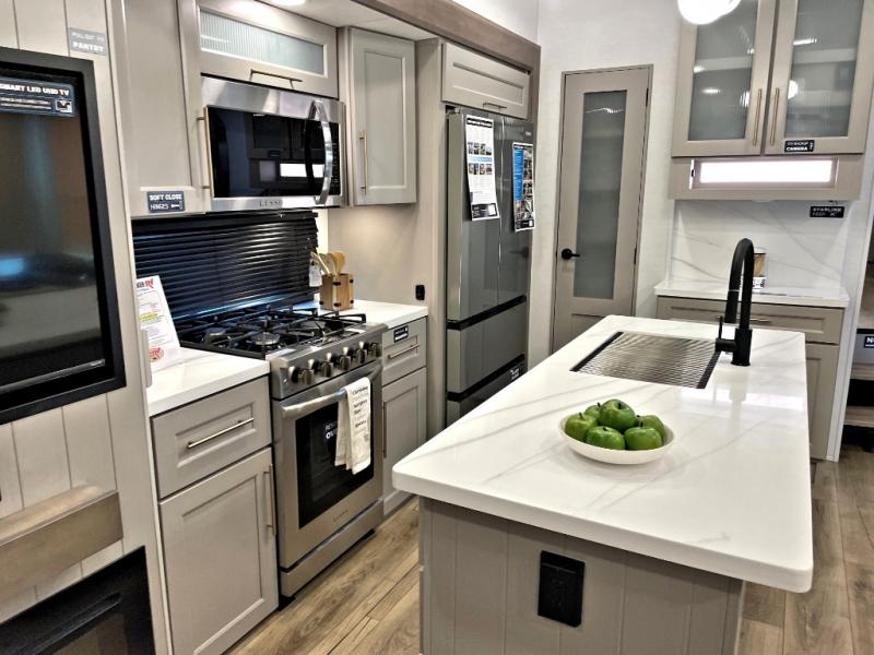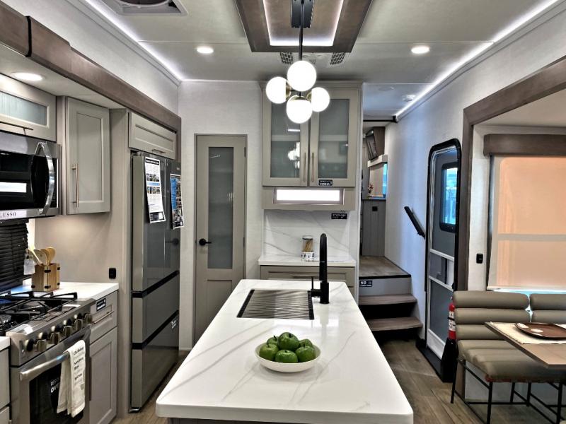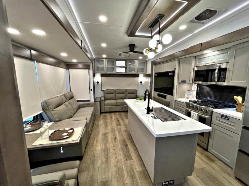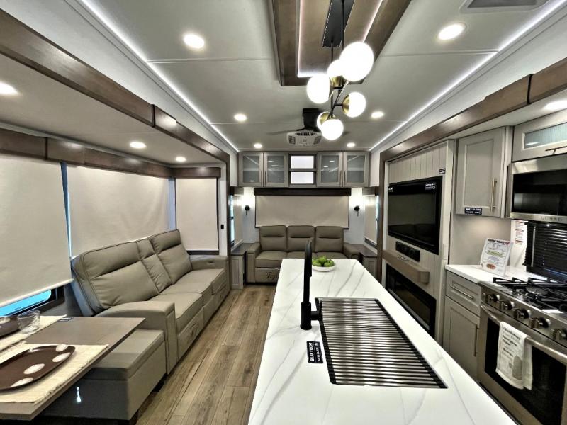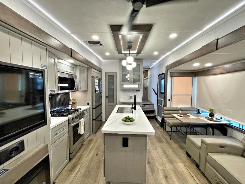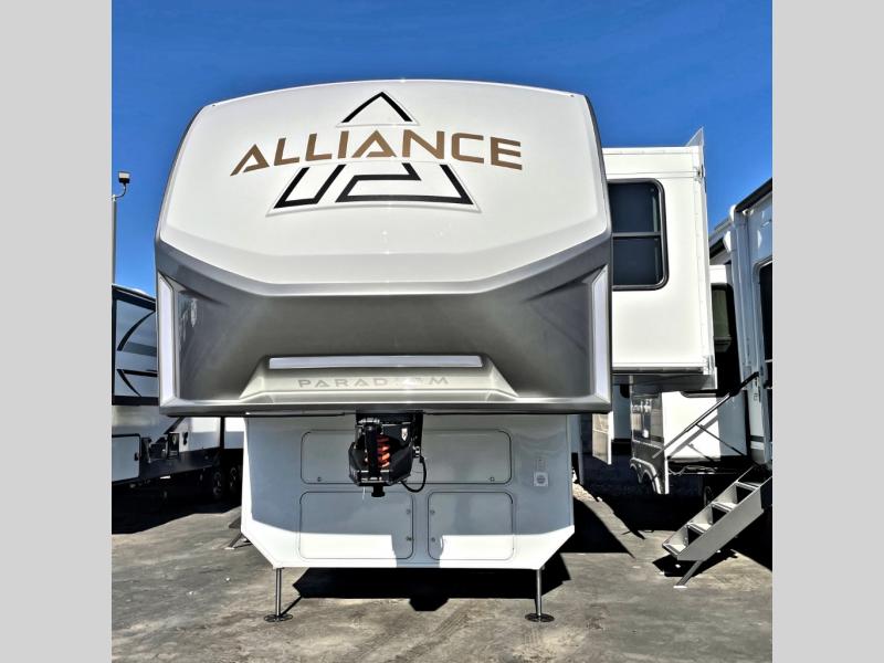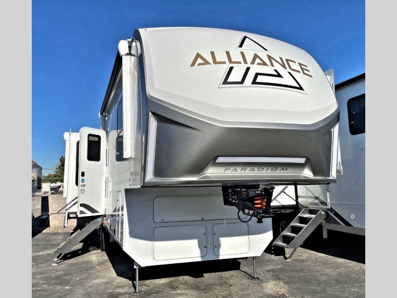 The Paradigm fifth wheels by Alliance RV are functional, high-quality, and luxurious for an unforgettable camping experience. There are three A/C units and a 40K BTU furnace to keep you comfortable year around, and you'll appreciate additional convenient amenities, like the all-in-one enclosed/heated utility center and the color coded and numbered wiring. A Helux Series coil spring pin box comes standard for hassle-free towing, along with Super-G 4,400 lb. rated tires and Dexter 7,000 lb. axles. You'll love the kitchen with its LG solid surface countertops and Lusso range, plus there is LED motion lighting in the pantry and a Maxx fan with a rain sensor to keep everything fresh when making dinner. Each model also includes an HD Smart TV in the living room and bedroom, plus a Winegard Air 360 antenna to keep you connected to the outside world. And of course there are a variety of options you can choose from to further customize your fifth wheel; dual pane windows, Super Solar Plus, slide out awning toppers, and generator prep or a generator to name a few!