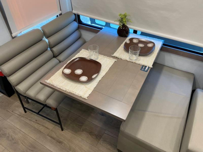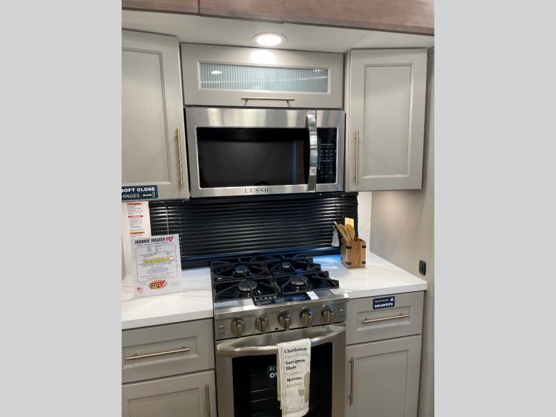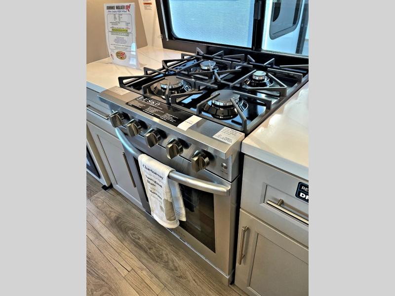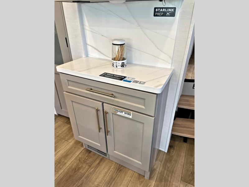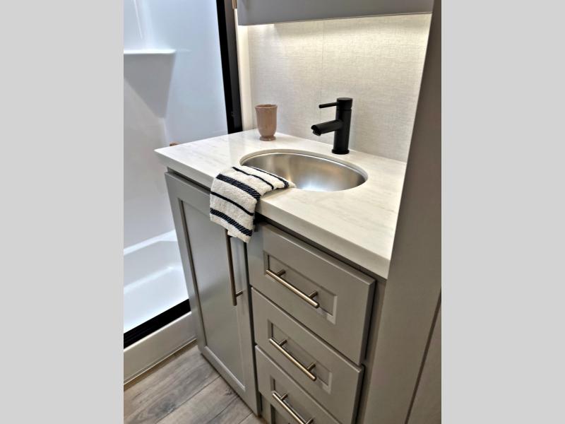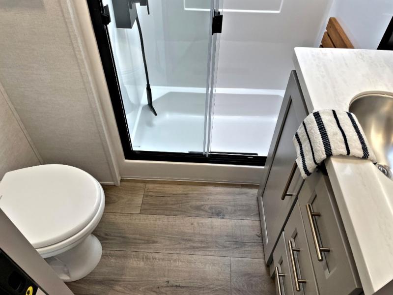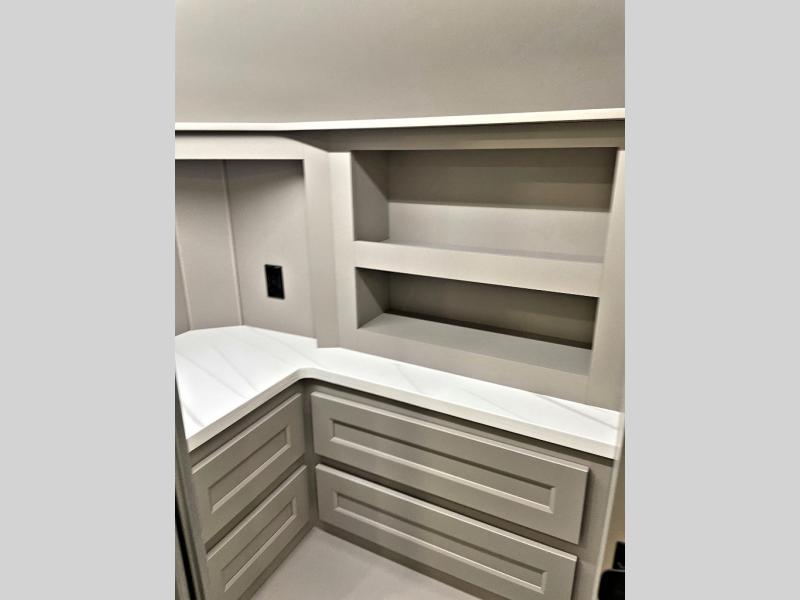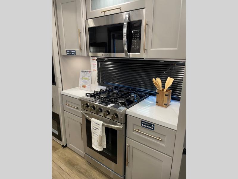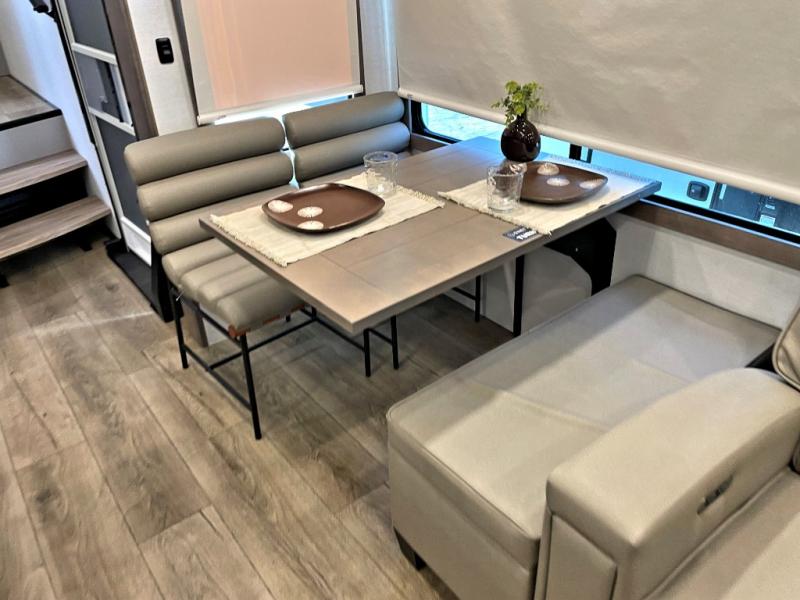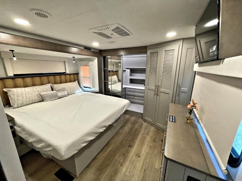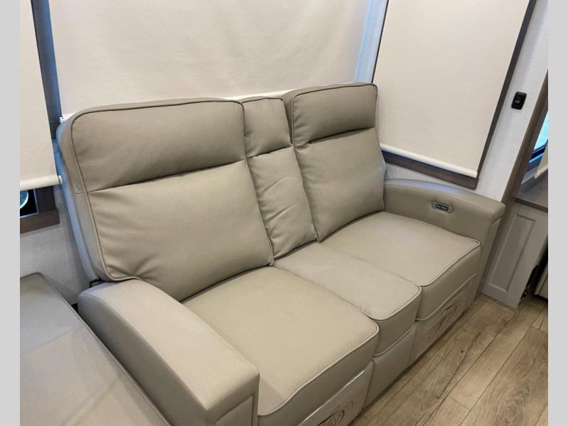 The Paradigm fifth wheels by Alliance RV are functional, high-quality, and luxurious for an unforgettable camping experience. There are three A/C units and a 40K BTU furnace to keep you comfortable year around, and you'll appreciate additional convenient amenities, like the all-in-one enclosed/heated utility center and the color coded and numbered wiring. A Helux Series coil spring pin box comes standard for hassle-free towing, along with Super-G 4,400 lb. rated tires and Dexter 7,000 lb. axles. You'll love the kitchen with its LG solid surface countertops and Lusso range, plus there is LED motion lighting in the pantry and a Maxx fan with a rain sensor to keep everything fresh when making dinner. Each model also includes an HD Smart TV in the living room and bedroom, plus a Winegard Air 360 antenna to keep you connected to the outside world. And of course there are a variety of options you can choose from to further customize your fifth wheel; dual pane windows, Super Solar Plus, slide out awning toppers, and generator prep or a generator to name a few!