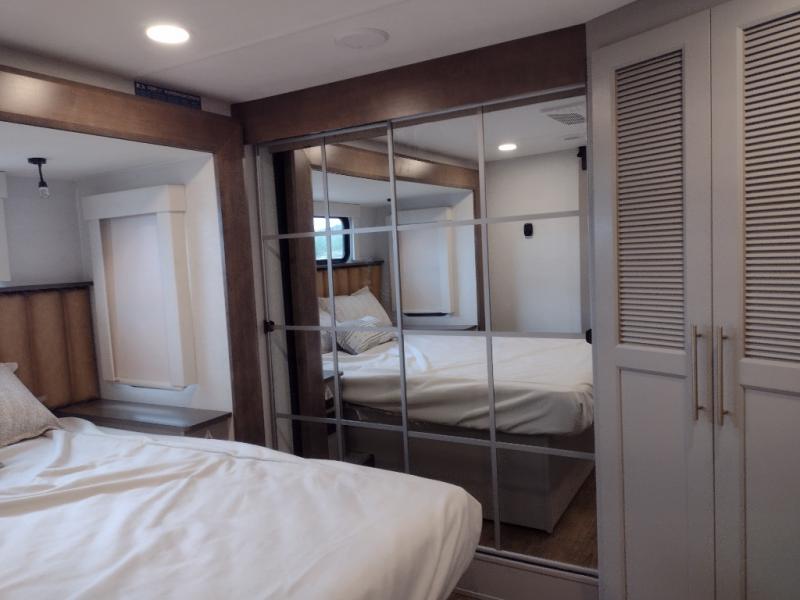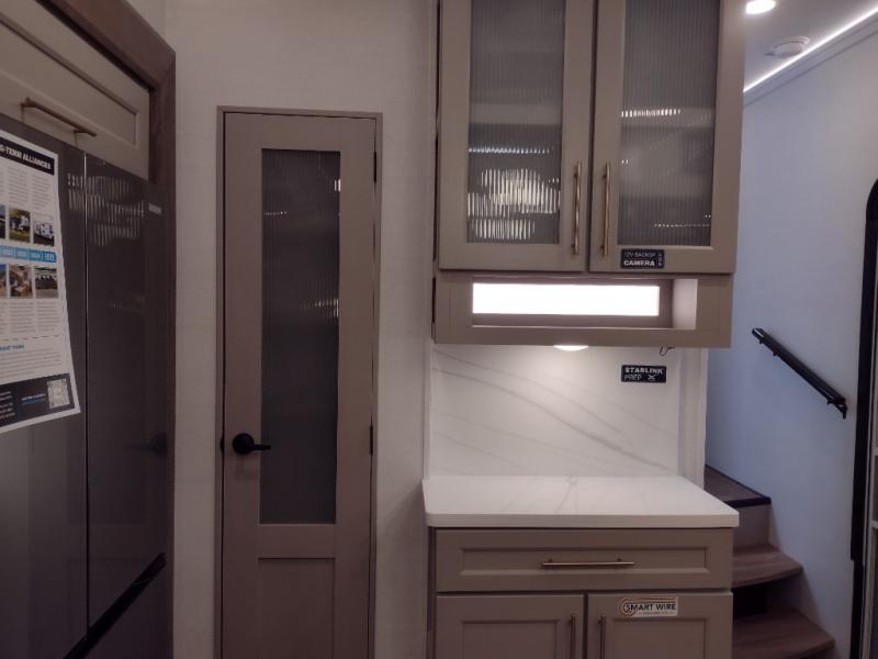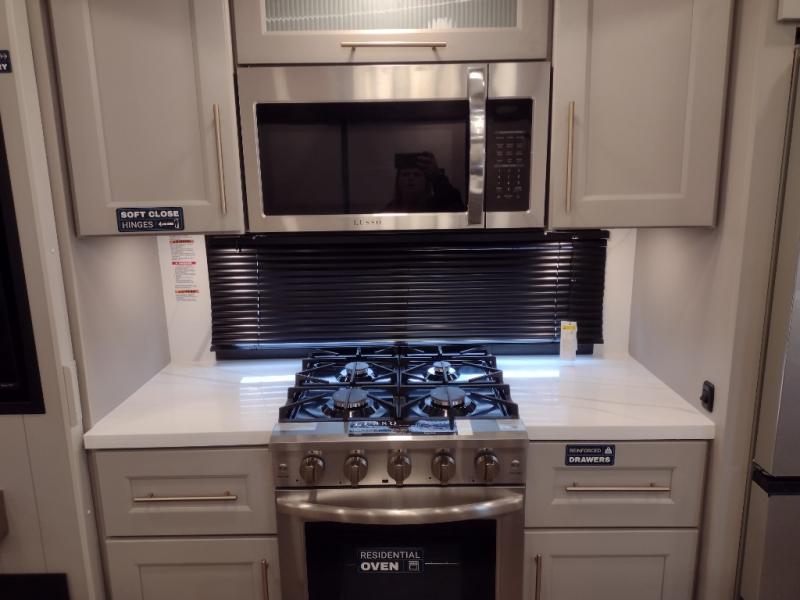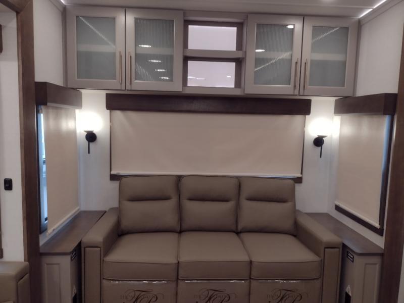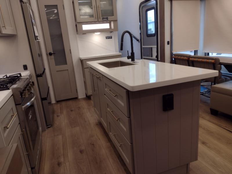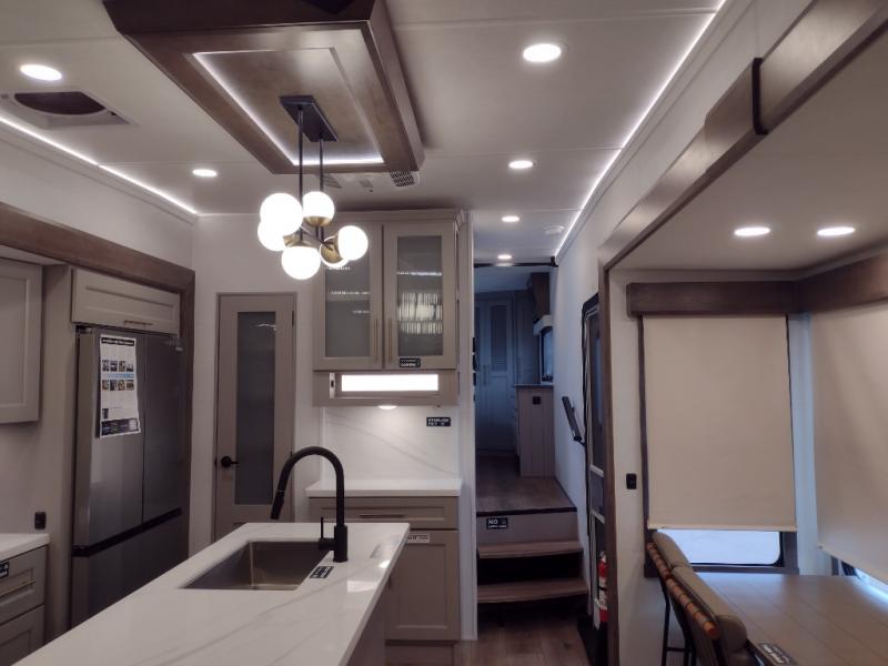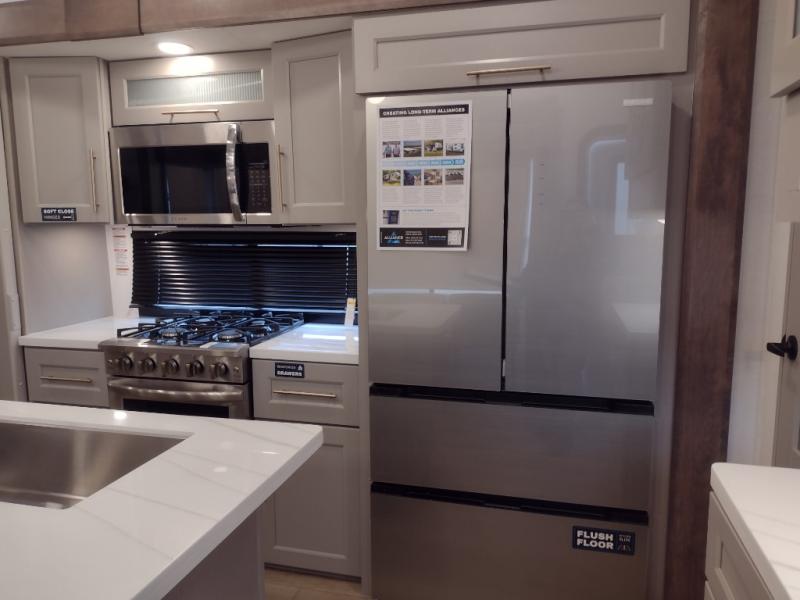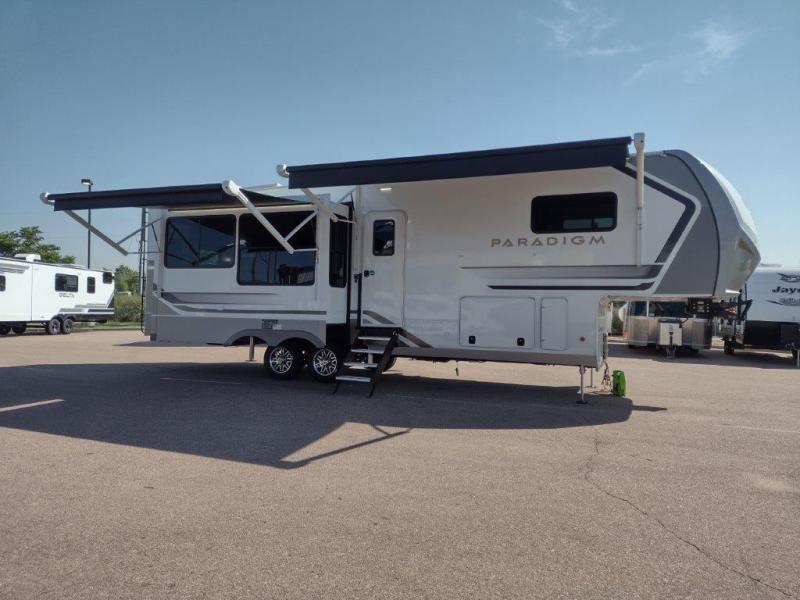 The Paradigm fifth wheels by Alliance RV are functional, high-quality, and luxurious for an unforgettable camping experience. There are three A/C units and a 40K BTU furnace to keep you comfortable year around, and you'll appreciate additional convenient amenities, like the all-in-one enclosed/heated utility center and the color coded and numbered wiring. A Helux Series coil spring pin box comes standard for hassle-free towing, along with Super-G 4,400 lb. rated tires and Dexter 7,000 lb. axles. You'll love the kitchen with its LG solid surface countertops and Lusso range, plus there is LED motion lighting in the pantry and a Maxx fan with a rain sensor to keep everything fresh when making dinner. Each model also includes an HD Smart TV in the living room and bedroom, plus a Winegard Air 360 antenna to keep you connected to the outside world. And of course there are a variety of options you can choose from to further customize your fifth wheel; dual pane windows, Super Solar Plus, slide out awning toppers, and generator prep or a generator to name a few!