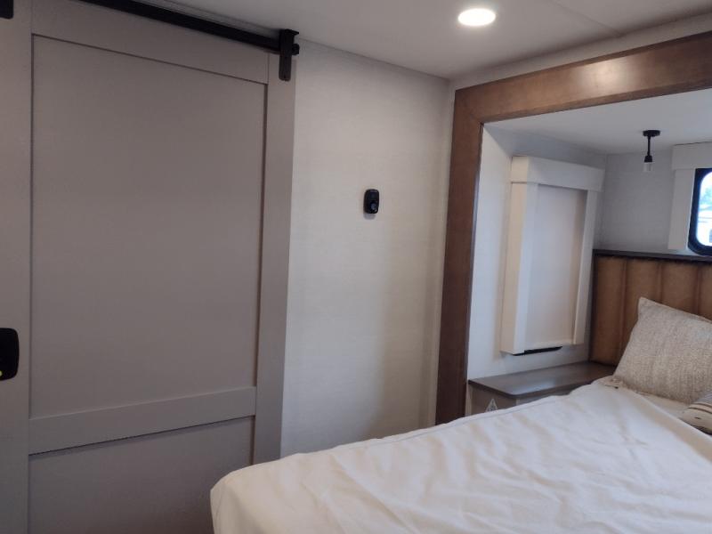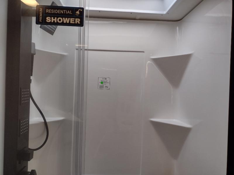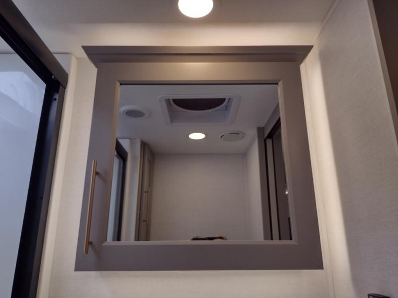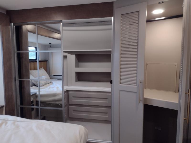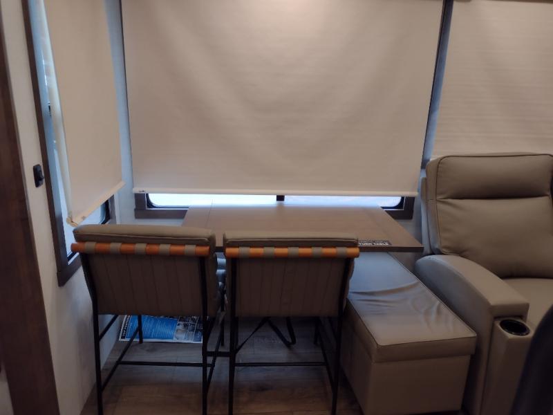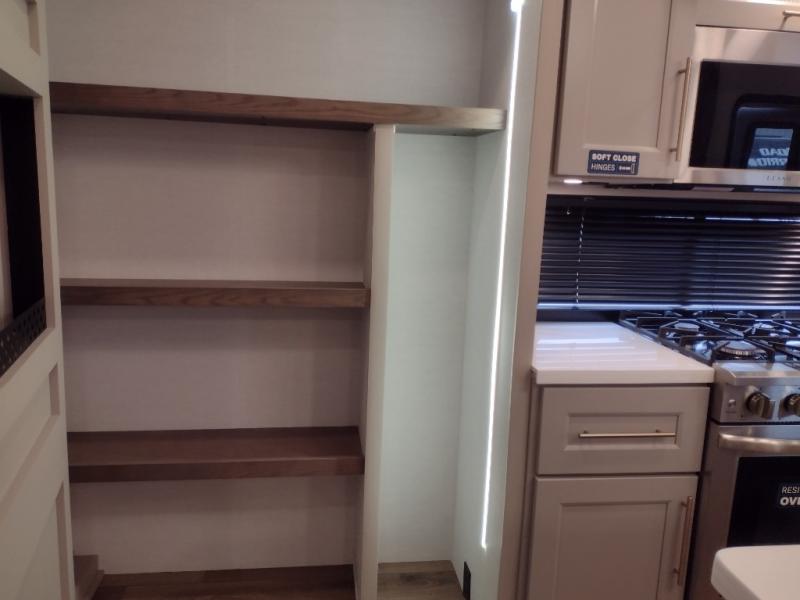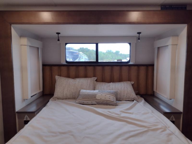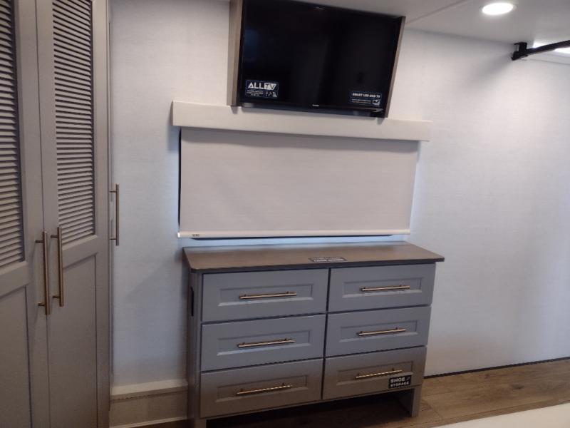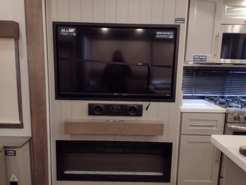 Search for the best views, the nicest RV park, or a place you haven't seen for years with this Paradigm in tow! There is a king bed slide in the master bedroom, a Smart TV, and a dresser with flip-up hidden storage for your belongings. The full bathroom offers a large residential shower, a porcelain toilet with a soft close seat, and storage for your linens, while the kitchen gives you two pantries, an island with a large undermount single basin sink and dishwasher prep if you want the option for easy clean up. You will also have a residential microwave and range, plus a 3.73 cu. ft. oven to make meals. When you're ready to relax for the evening, head to the rear living area to enjoy the dual recliner love seat across from the 50" Smart TV and fireplace!