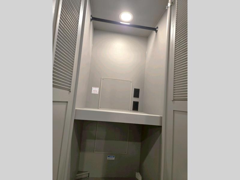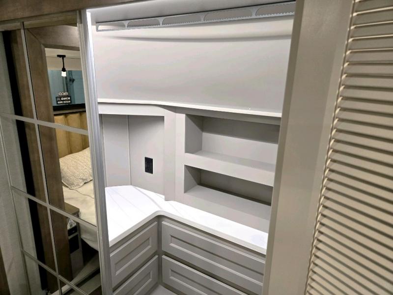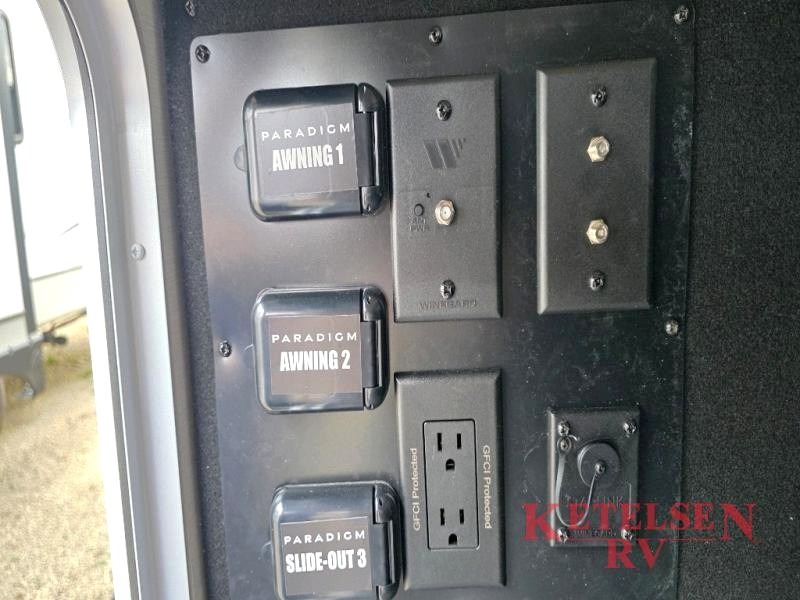 Search for the best views, the nicest RV park, or a place you haven't seen for years with this Paradigm in tow! There is a king bed slide in the master bedroom, a Smart TV, and a dresser with flip-up hidden storage for your belongings. The full bathroom offers a large residential shower, a porcelain toilet with a soft close seat, and storage for your linens, while the kitchen gives you two pantries, an island with a large undermount single basin sink and dishwasher prep if you want the option for easy clean up. You will also have a residential microwave and range, plus a 3.73 cu. ft. oven to make meals. When you're ready to relax for the evening, head to the rear living area to enjoy the dual recliner love seat across from the 50" Smart TV and fireplace!