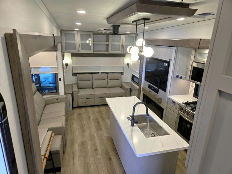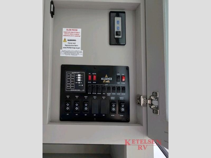 The Paradigm fifth wheels by Alliance RV are functional, high-quality, and luxurious for an unforgettable camping experience. There are three A/C units and a 40K BTU furnace to keep you comfortable year around, and you'll appreciate additional convenient amenities, like the all-in-one enclosed/heated utility center and the color coded and numbered wiring. A Helux Series coil spring pin box comes standard for hassle-free towing, along with Super-G 4,400 lb. rated tires and Dexter 7,000 lb. axles. You'll love the kitchen with its LG solid surface countertops and Lusso range, plus there is LED motion lighting in the pantry and a Maxx fan with a rain sensor to keep everything fresh when making dinner. Each model also includes an HD Smart TV in the living room and bedroom, plus a Winegard Air 360 antenna to keep you connected to the outside world. And of course there are a variety of options you can choose from to further customize your fifth wheel; dual pane windows, Super Solar Plus, slide out awning toppers, and generator prep or a generator to name a few!