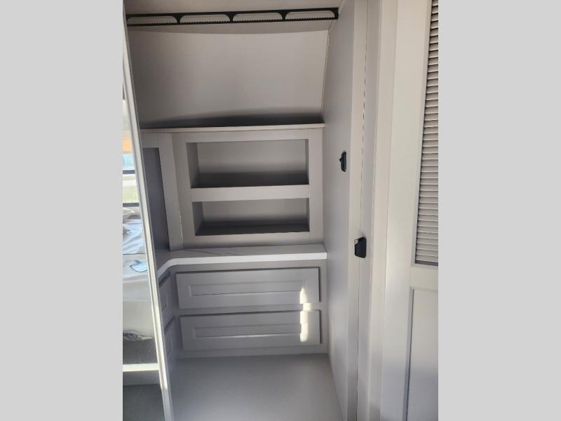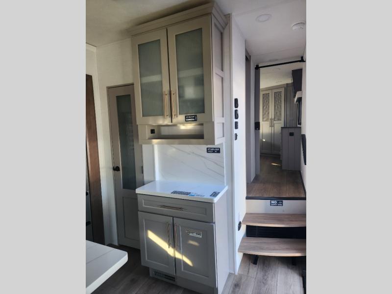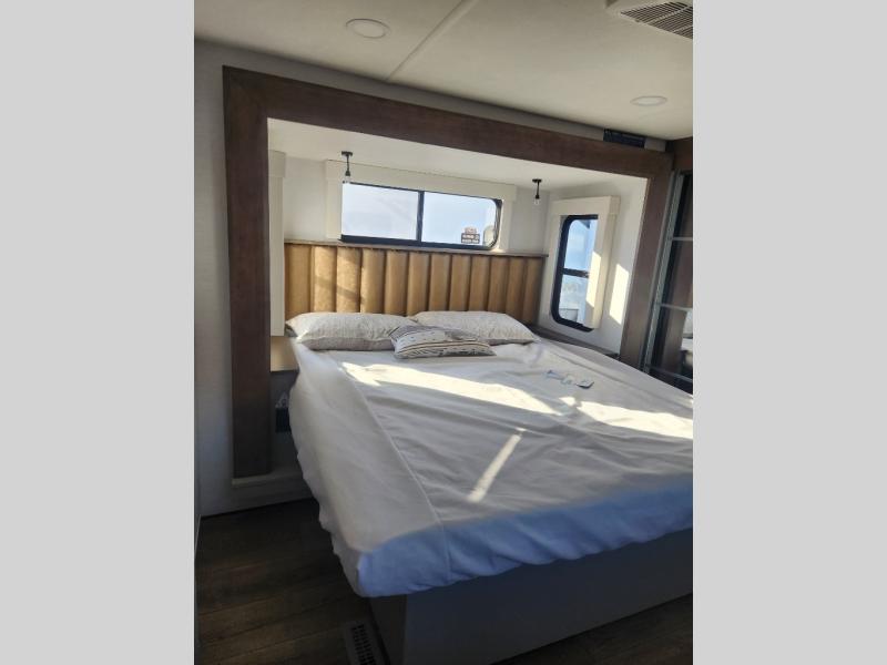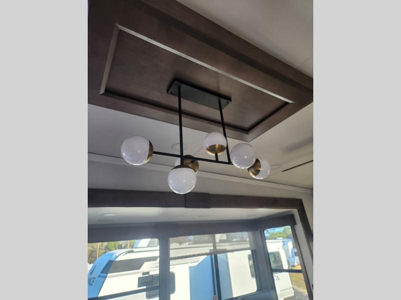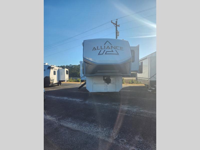 The Paradigm fifth wheels by Alliance RV are functional, high-quality, and luxurious for an unforgettable camping experience. There are three A/C units and a 40K BTU furnace to keep you comfortable year around, and you'll appreciate additional convenient amenities, like the all-in-one enclosed/heated utility center and the color coded and numbered wiring. A Helux Series coil spring pin box comes standard for hassle-free towing, along with Super-G 4,400 lb. rated tires and Dexter 7,000 lb. axles. You'll love the kitchen with its LG solid surface countertops and Lusso range, plus there is LED motion lighting in the pantry and a Maxx fan with a rain sensor to keep everything fresh when making dinner. Each model also includes an HD Smart TV in the living room and bedroom, plus a Winegard Air 360 antenna to keep you connected to the outside world. And of course there are a variety of options you can choose from to further customize your fifth wheel; dual pane windows, Super Solar Plus, slide out awning toppers, and generator prep or a generator to name a few!