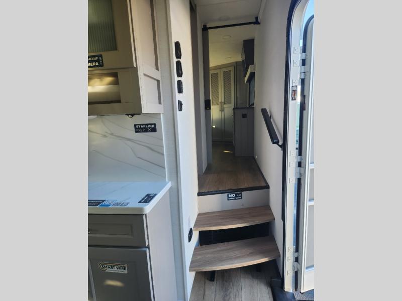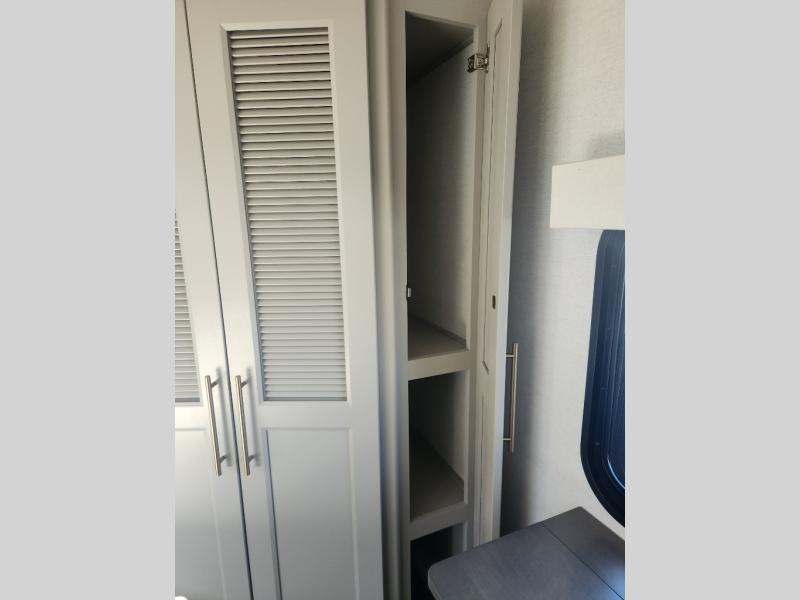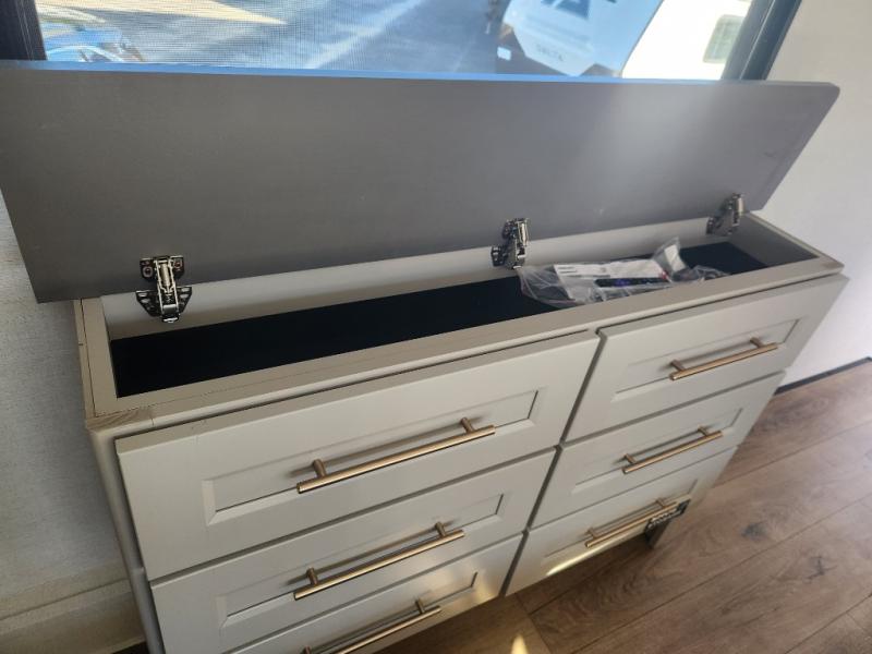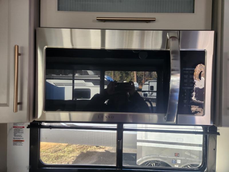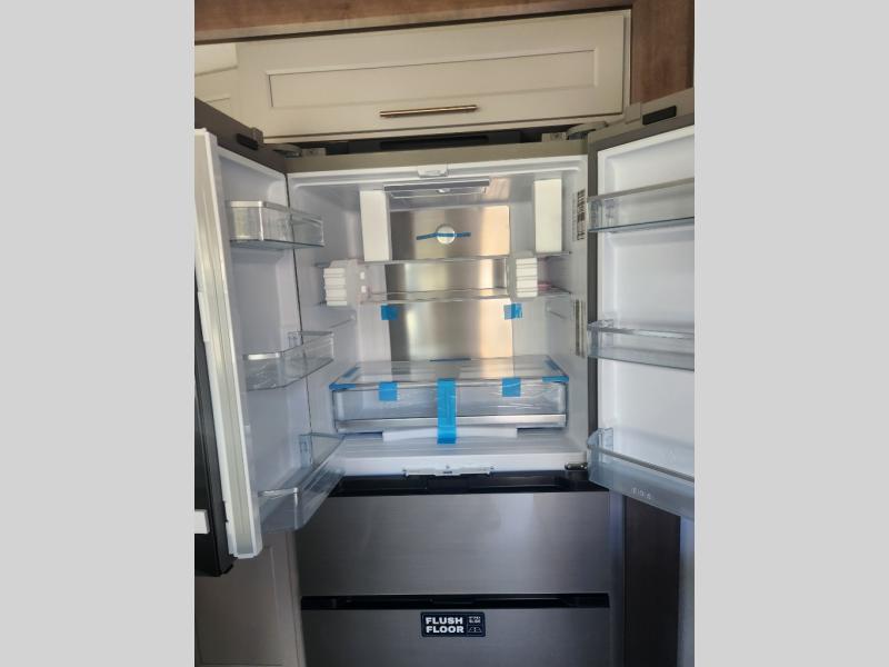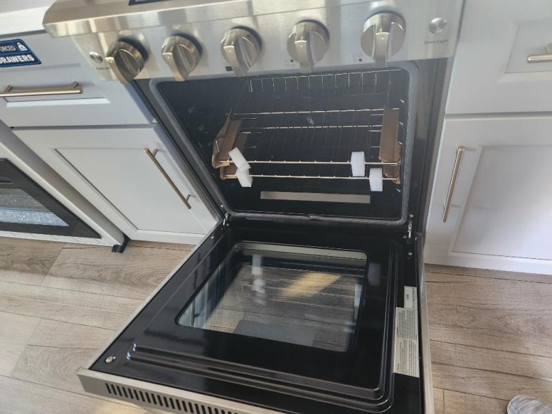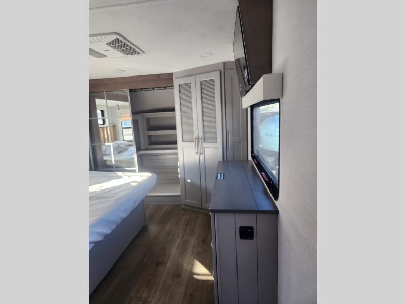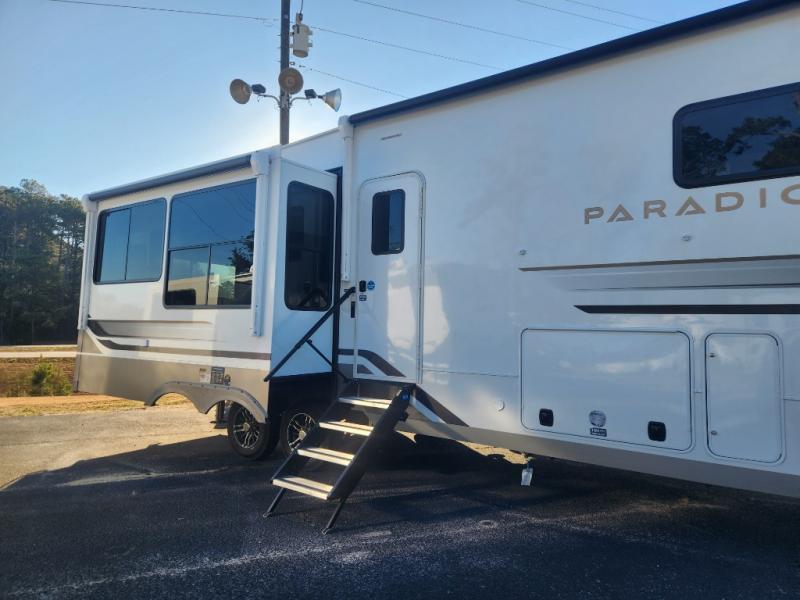 Search for the best views, the nicest RV park, or a place you haven't seen for years with this Paradigm in tow! There is a king bed slide in the master bedroom, a Smart TV, and a dresser with flip-up hidden storage for your belongings. The full bathroom offers a large residential shower, a porcelain toilet with a soft close seat, and storage for your linens, while the kitchen gives you two pantries, an island with a large undermount single basin sink and dishwasher prep if you want the option for easy clean up. You will also have a residential microwave and range, plus a 3.73 cu. ft. oven to make meals. When you're ready to relax for the evening, head to the rear living area to enjoy the dual recliner love seat across from the 50" Smart TV and fireplace!