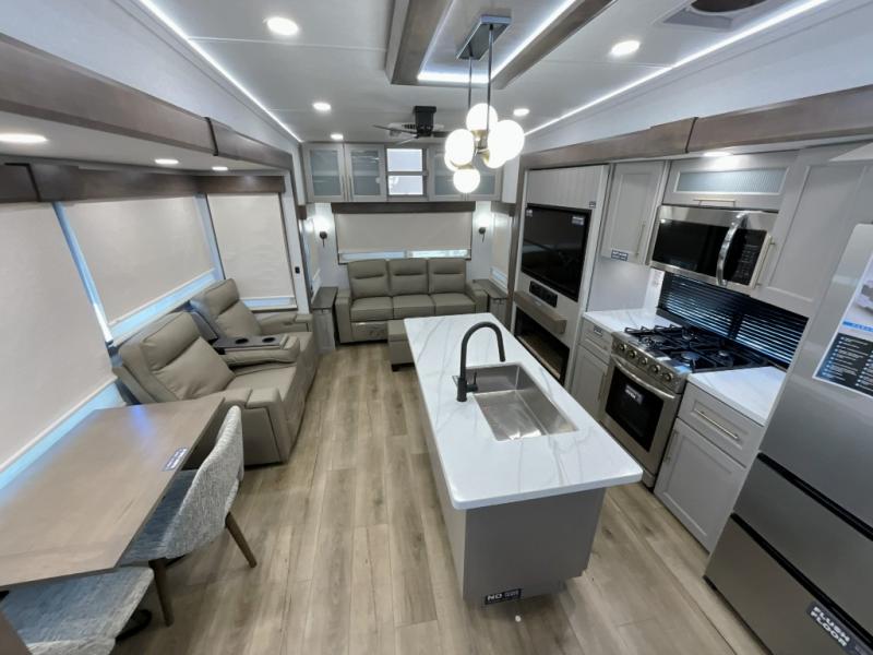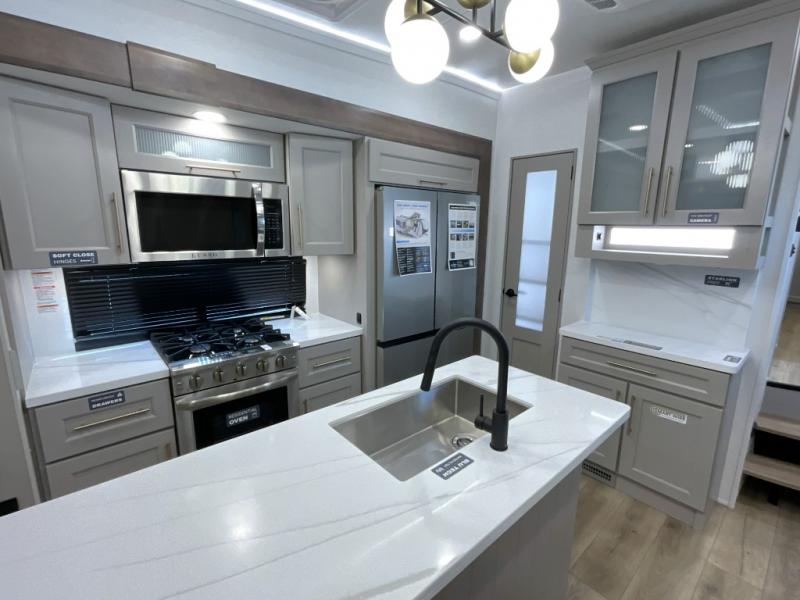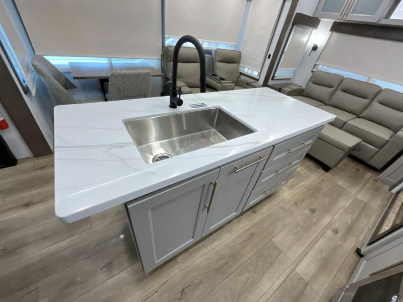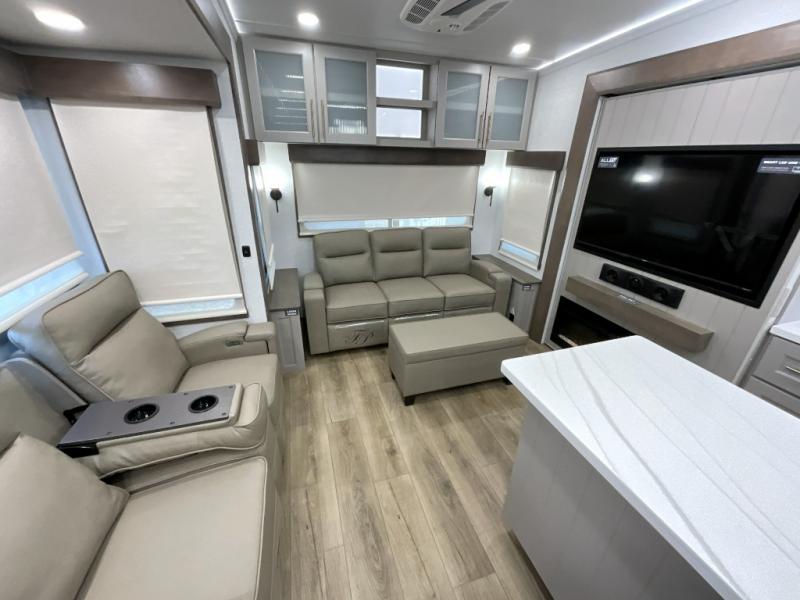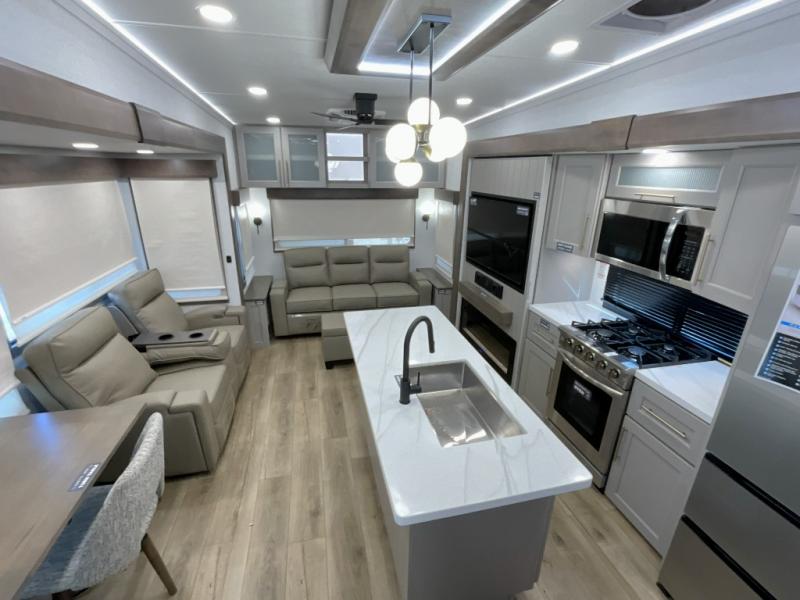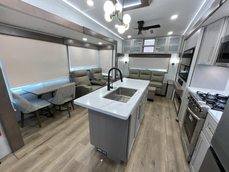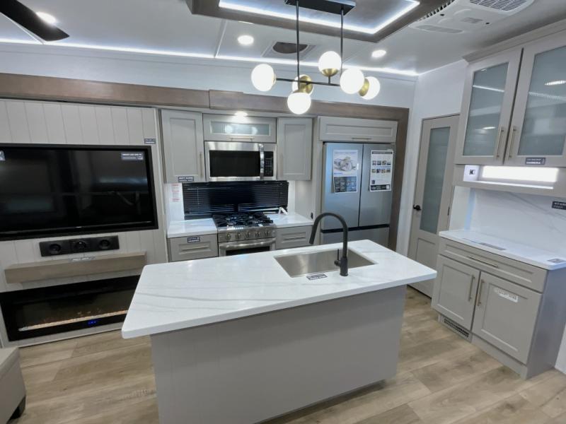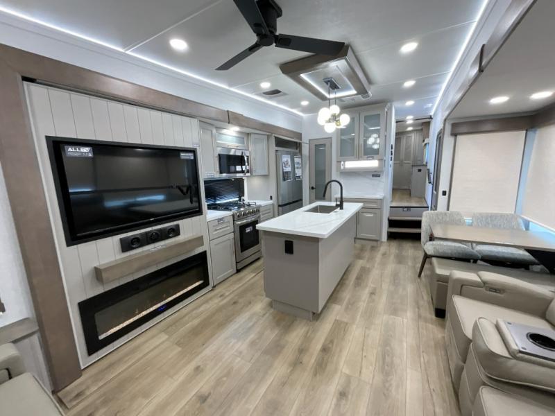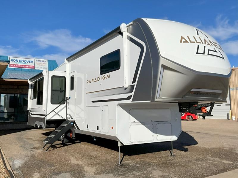 The Paradigm fifth wheels by Alliance RV are functional, high-quality, and luxurious for an unforgettable camping experience. There are three A/C units and a 40K BTU furnace to keep you comfortable year around, and you'll appreciate additional convenient amenities, like the all-in-one enclosed/heated utility center and the color coded and numbered wiring. A Helux Series coil spring pin box comes standard for hassle-free towing, along with Super-G 4,400 lb. rated tires and Dexter 7,000 lb. axles. You'll love the kitchen with its LG solid surface countertops and Lusso range, plus there is LED motion lighting in the pantry and a Maxx fan with a rain sensor to keep everything fresh when making dinner. Each model also includes an HD Smart TV in the living room and bedroom, plus a Winegard Air 360 antenna to keep you connected to the outside world. And of course there are a variety of options you can choose from to further customize your fifth wheel; dual pane windows, Super Solar Plus, slide out awning toppers, and generator prep or a generator to name a few!