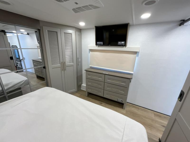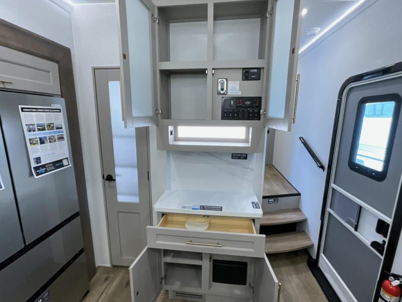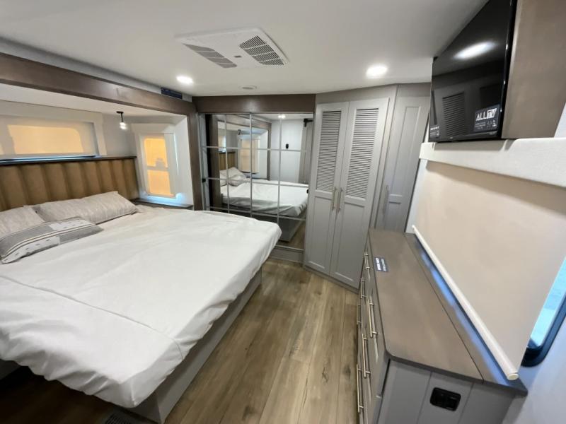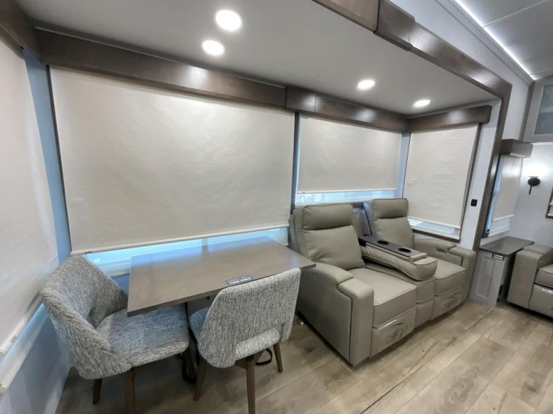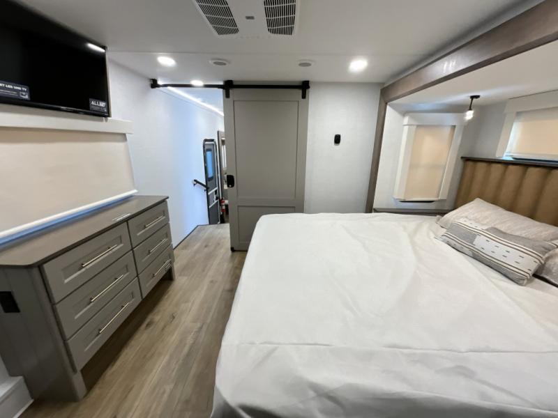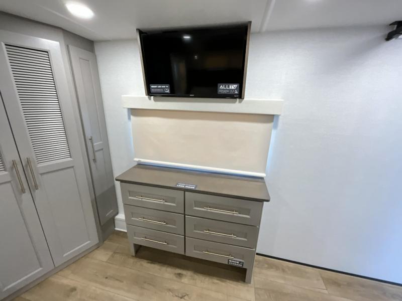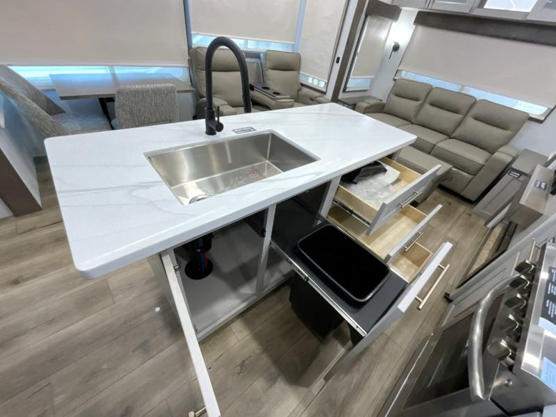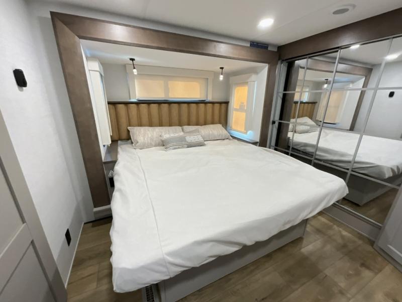 The Paradigm fifth wheels by Alliance RV are functional, high-quality, and luxurious for an unforgettable camping experience. There are three A/C units and a 40K BTU furnace to keep you comfortable year around, and you'll appreciate additional convenient amenities, like the all-in-one enclosed/heated utility center and the color coded and numbered wiring. A Helux Series coil spring pin box comes standard for hassle-free towing, along with Super-G 4,400 lb. rated tires and Dexter 7,000 lb. axles. You'll love the kitchen with its LG solid surface countertops and Lusso range, plus there is LED motion lighting in the pantry and a Maxx fan with a rain sensor to keep everything fresh when making dinner. Each model also includes an HD Smart TV in the living room and bedroom, plus a Winegard Air 360 antenna to keep you connected to the outside world. And of course there are a variety of options you can choose from to further customize your fifth wheel; dual pane windows, Super Solar Plus, slide out awning toppers, and generator prep or a generator to name a few!