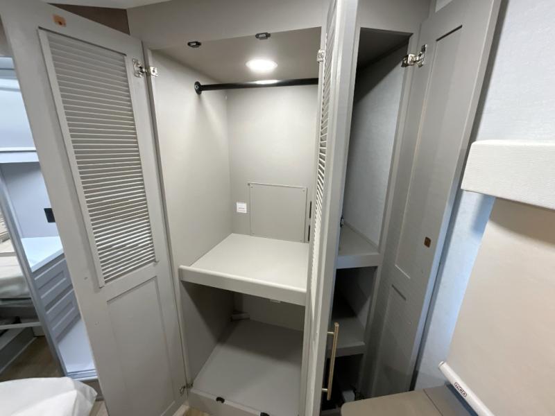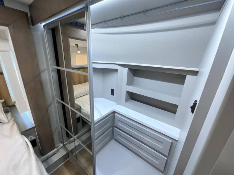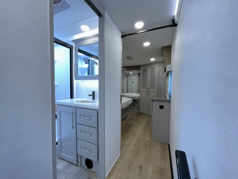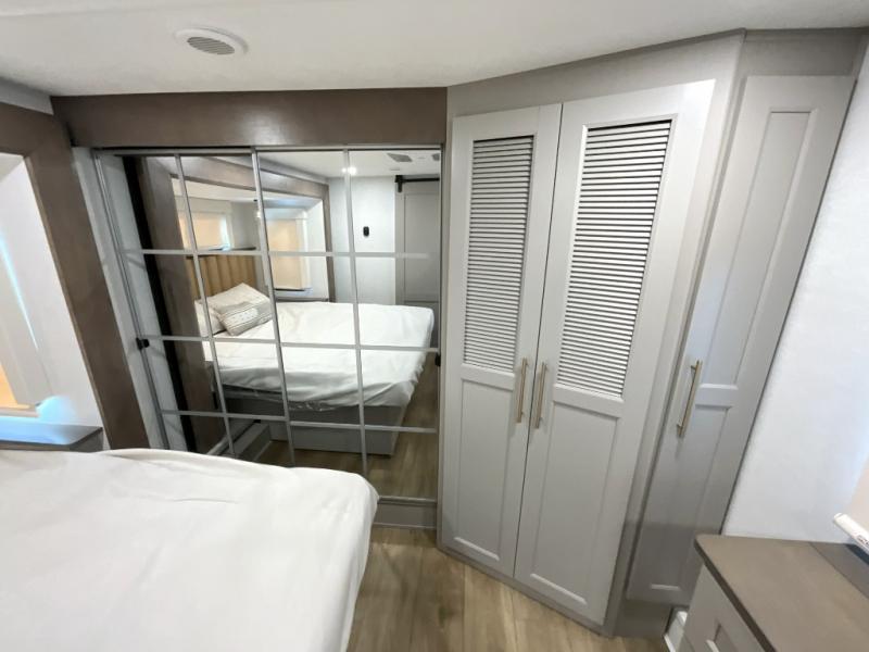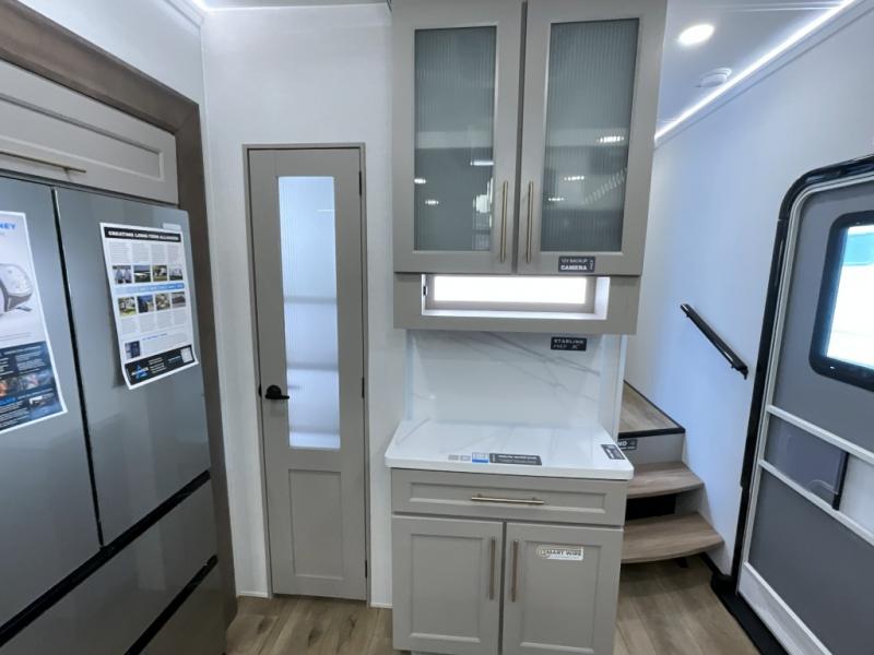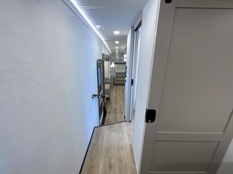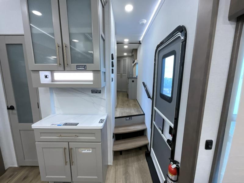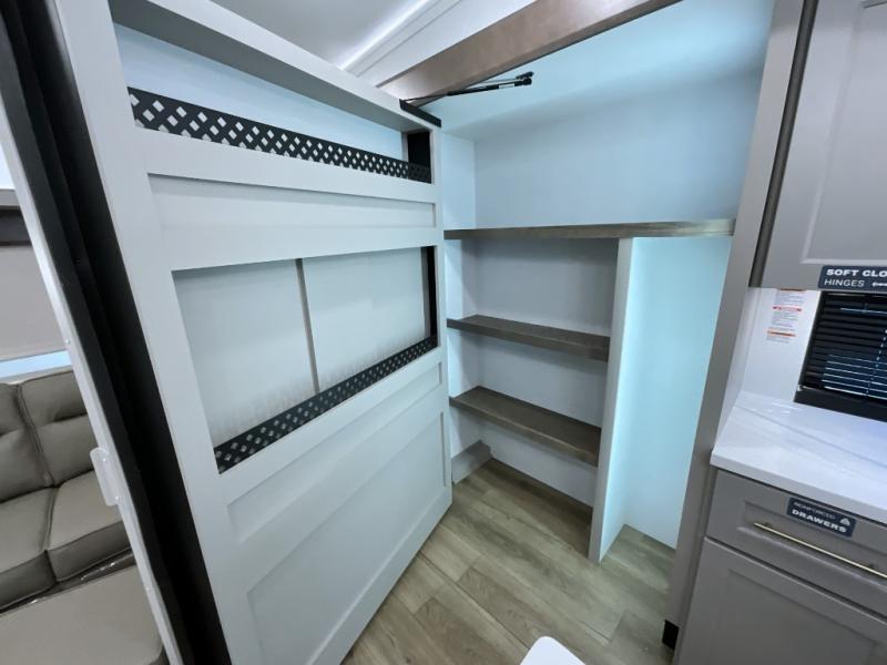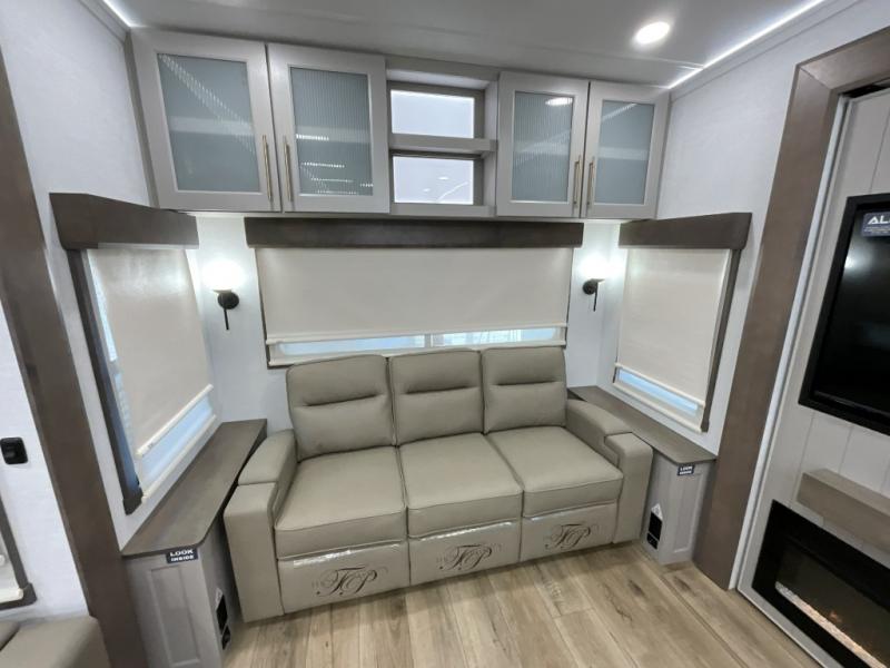 The Paradigm fifth wheels by Alliance RV are functional, high-quality, and luxurious for an unforgettable camping experience. There are three A/C units and a 40K BTU furnace to keep you comfortable year around, and you'll appreciate additional convenient amenities, like the all-in-one enclosed/heated utility center and the color coded and numbered wiring. A Helux Series coil spring pin box comes standard for hassle-free towing, along with Super-G 4,400 lb. rated tires and Dexter 7,000 lb. axles. You'll love the kitchen with its LG solid surface countertops and Lusso range, plus there is LED motion lighting in the pantry and a Maxx fan with a rain sensor to keep everything fresh when making dinner. Each model also includes an HD Smart TV in the living room and bedroom, plus a Winegard Air 360 antenna to keep you connected to the outside world. And of course there are a variety of options you can choose from to further customize your fifth wheel; dual pane windows, Super Solar Plus, slide out awning toppers, and generator prep or a generator to name a few!