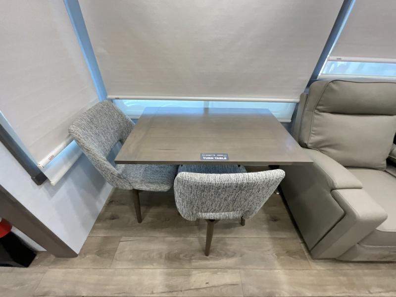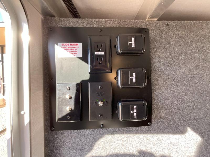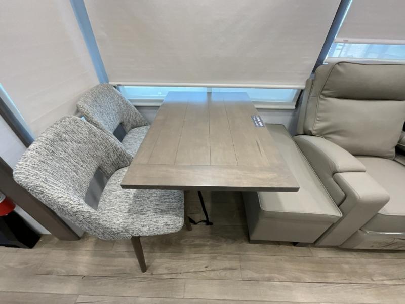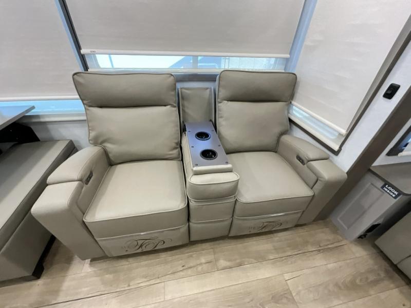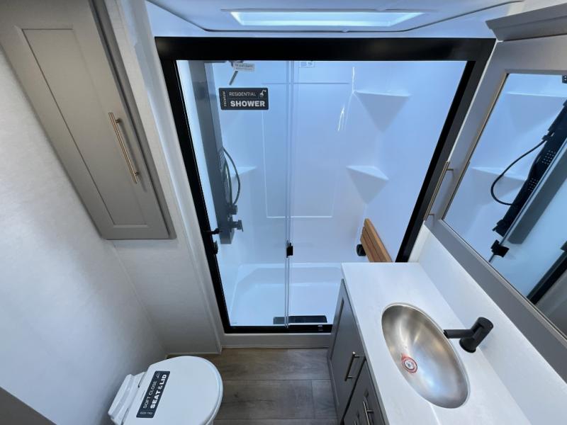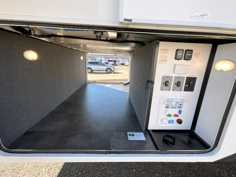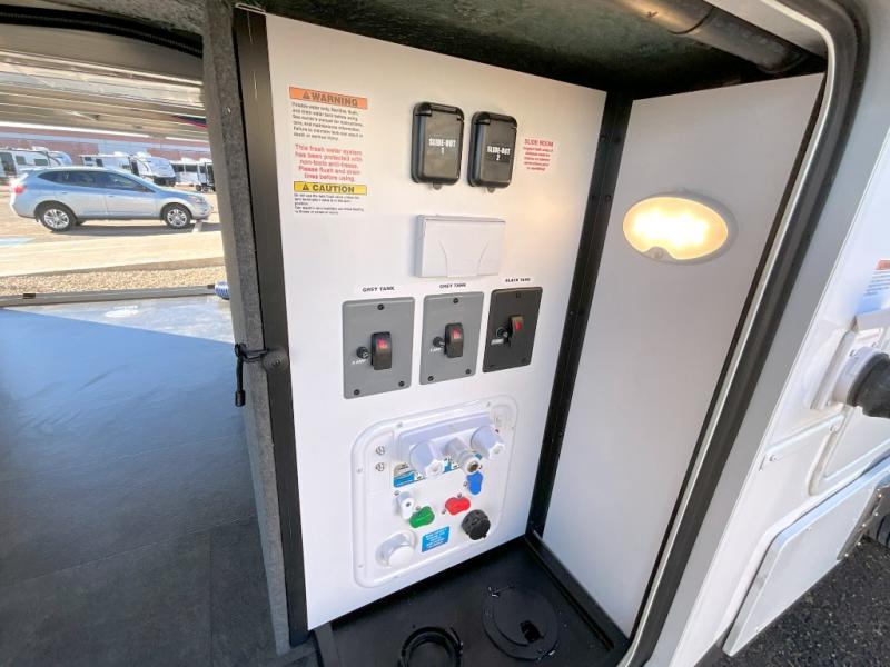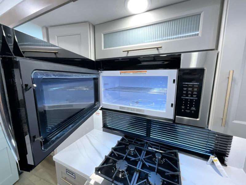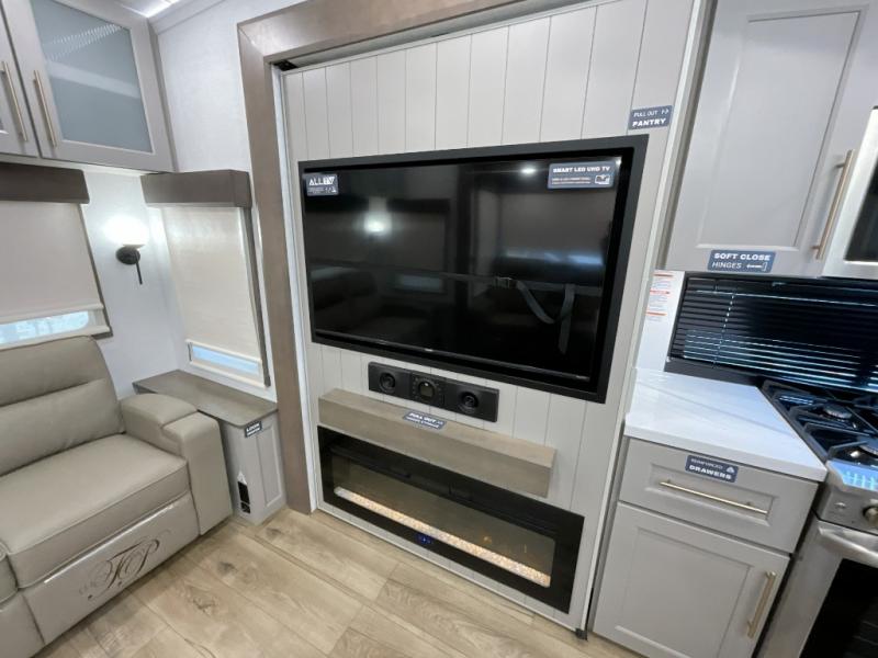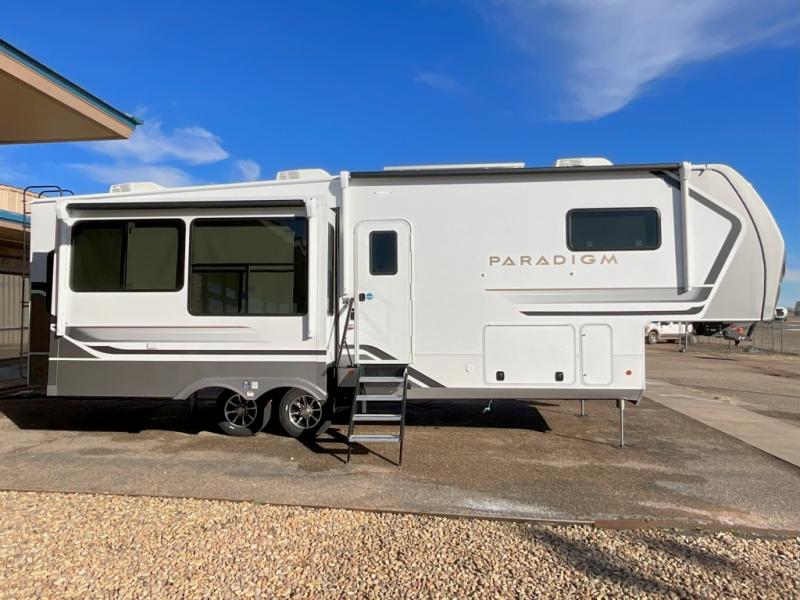 Search for the best views, the nicest RV park, or a place you haven't seen for years with this Paradigm in tow! There is a king bed slide in the master bedroom, a Smart TV, and a dresser with flip-up hidden storage for your belongings. The full bathroom offers a large residential shower, a porcelain toilet with a soft close seat, and storage for your linens, while the kitchen gives you two pantries, an island with a large undermount single basin sink and dishwasher prep if you want the option for easy clean up. You will also have a residential microwave and range, plus a 3.73 cu. ft. oven to make meals. When you're ready to relax for the evening, head to the rear living area to enjoy the dual recliner love seat across from the 50" Smart TV and fireplace!